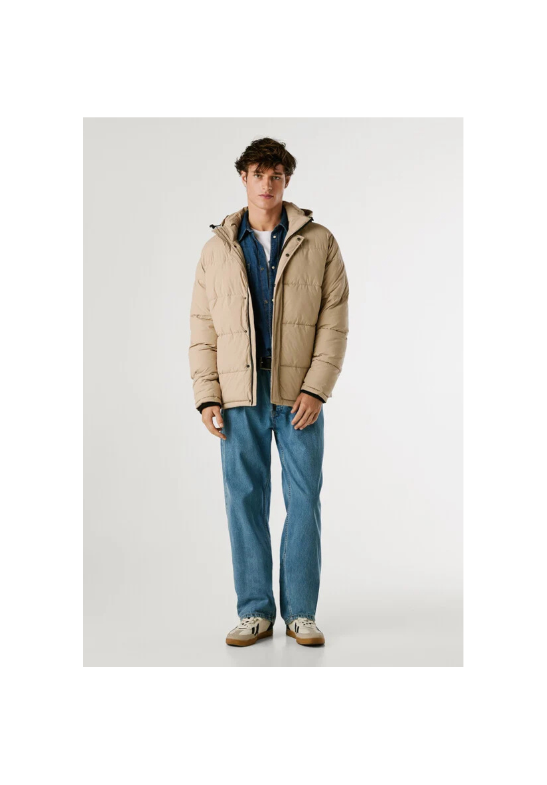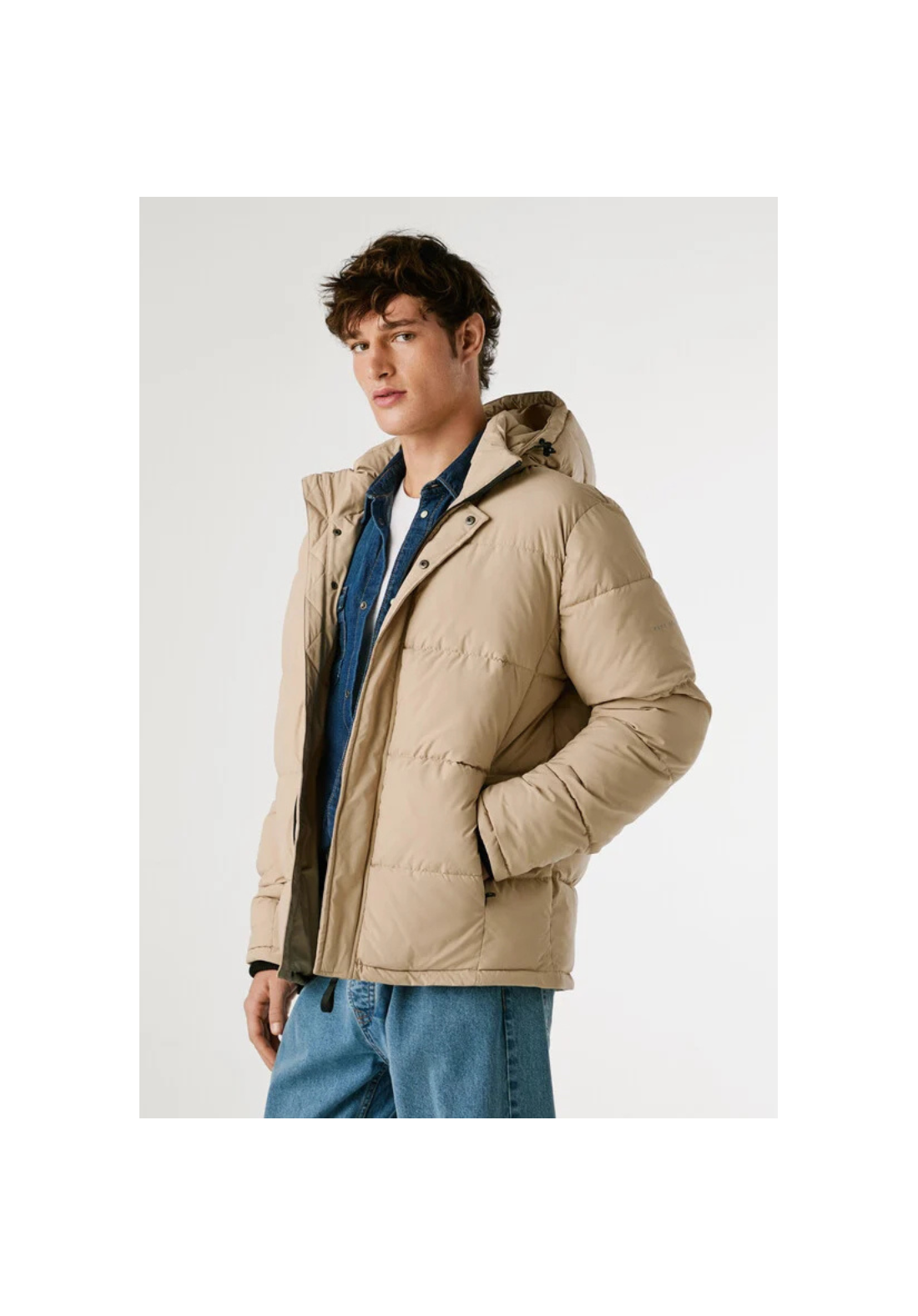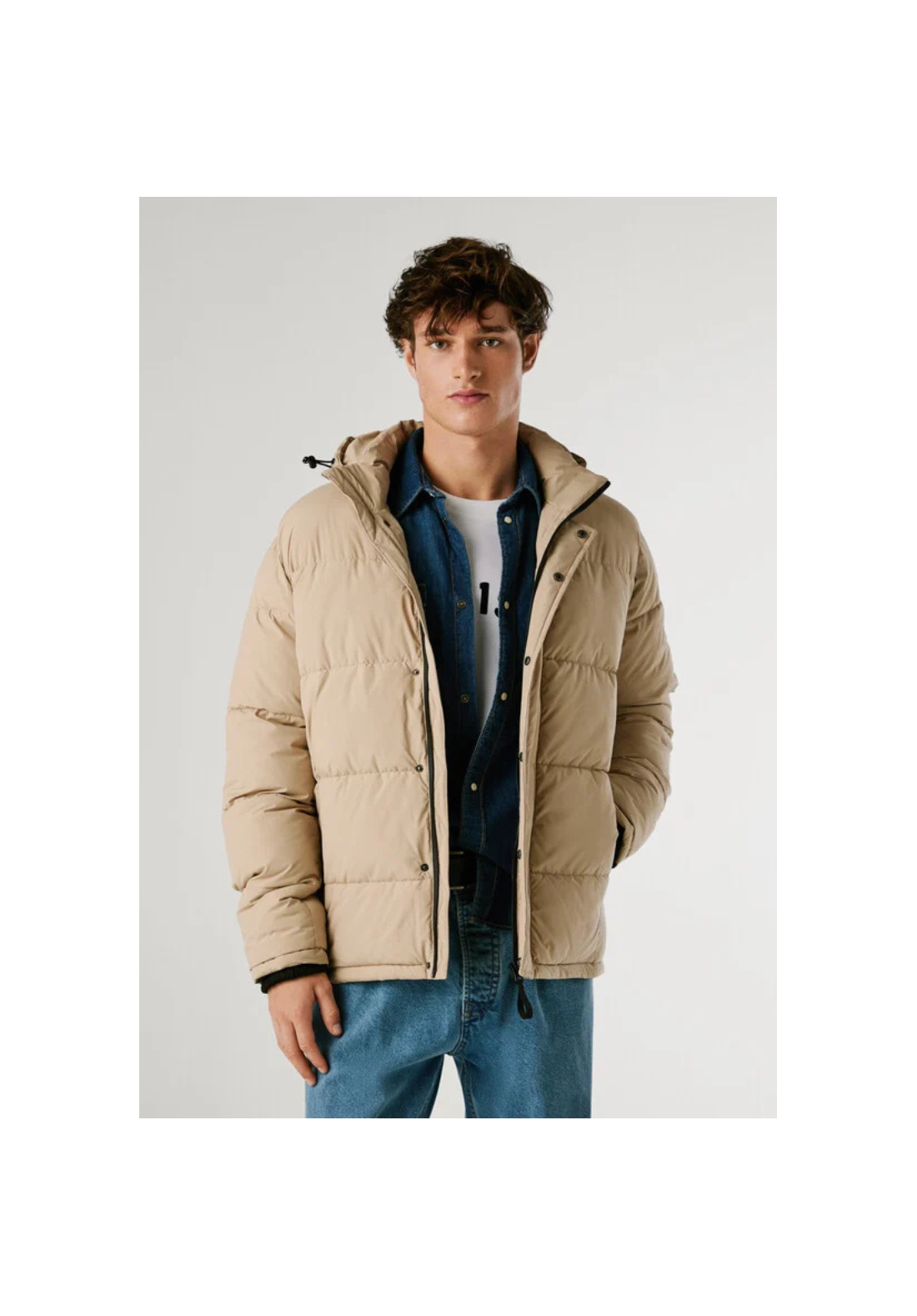Chaqueta acolchada de tejido ligero, con capucha ajustable y extraíble, cierre frontal con cremallera y tapeta oculta. Tiene bolsillos laterales con cremallera.