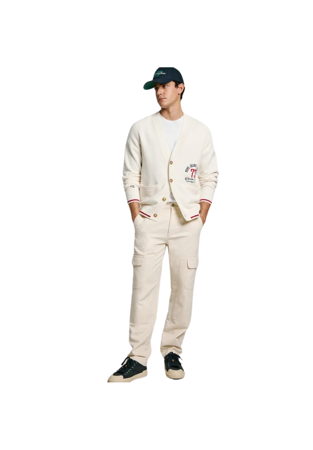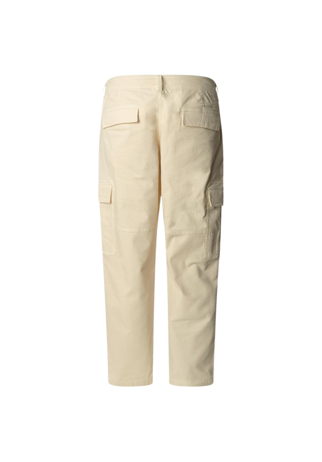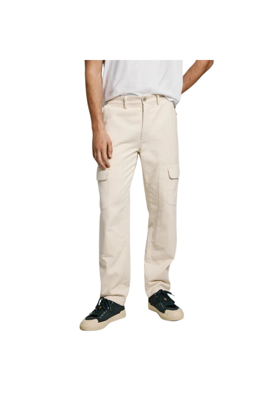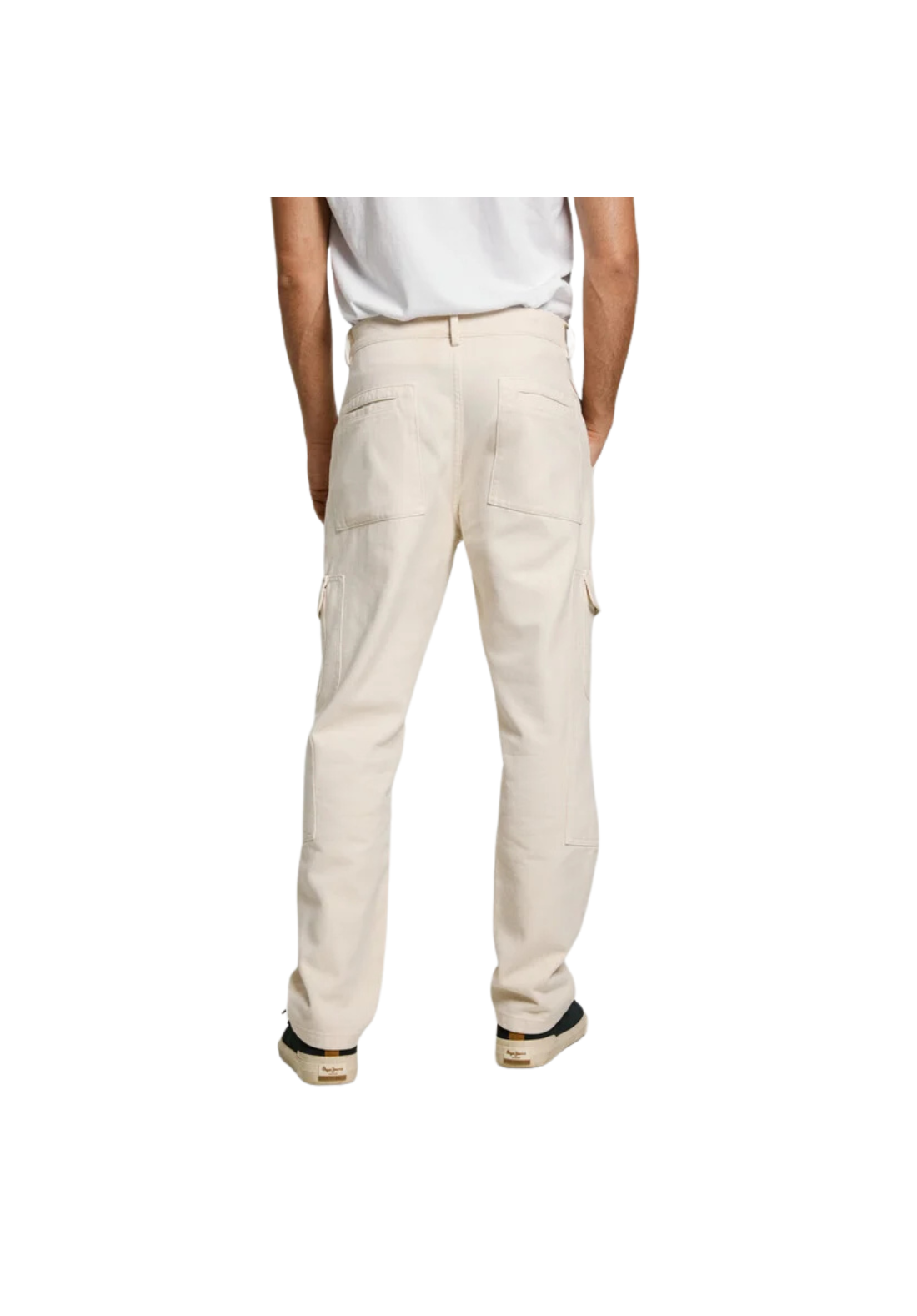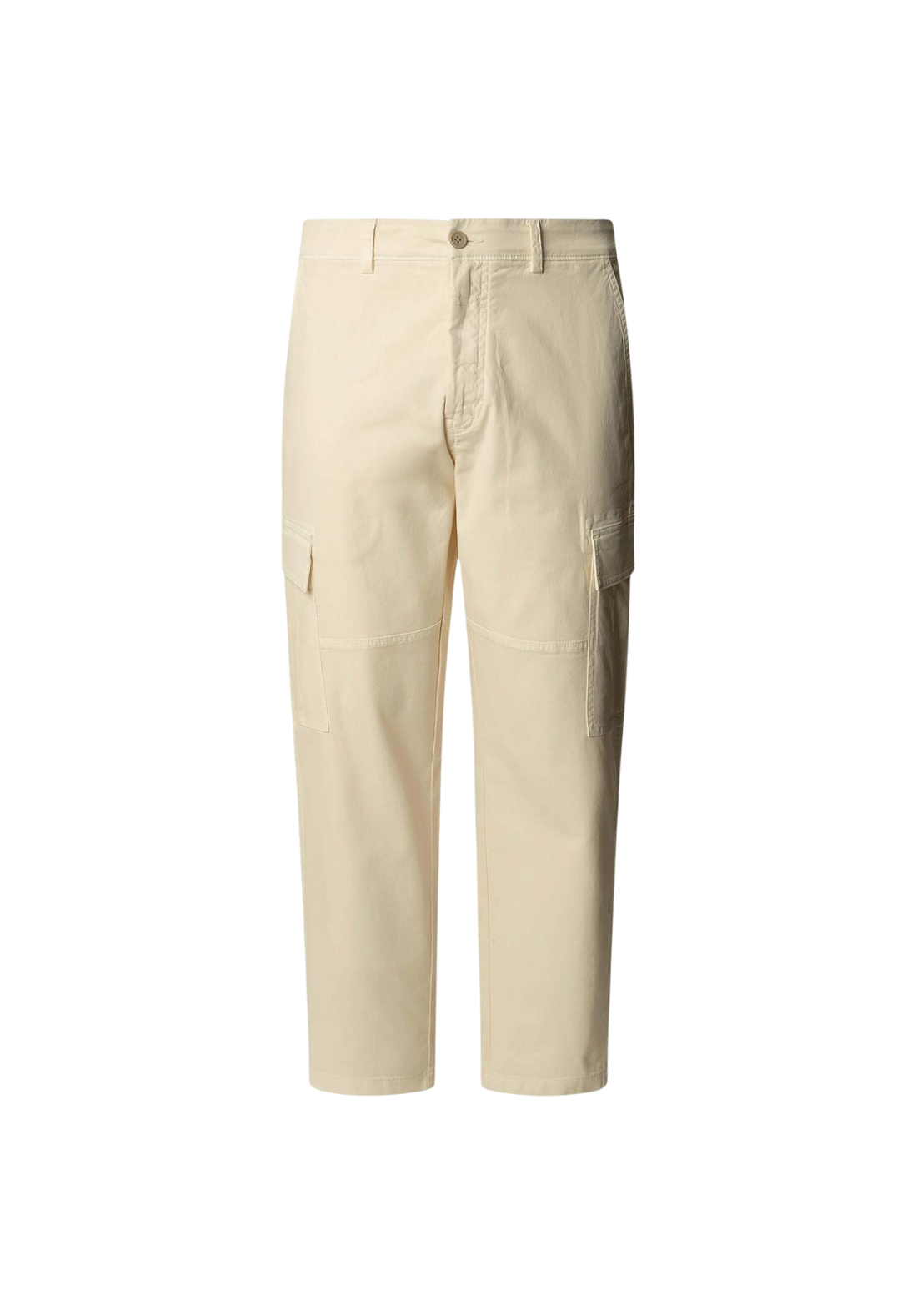 Pantalón cargo en tejido de lona elástica. Tiene bolsillos italianos y bolsillos de parche laterales y traseros con solapa. El cierre es con cremallera y botón.