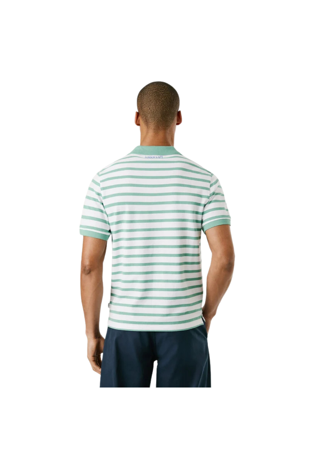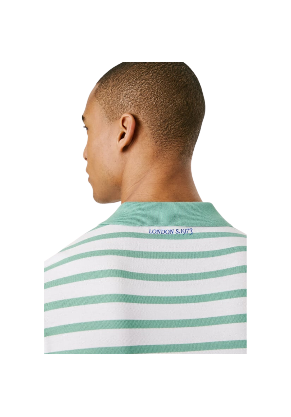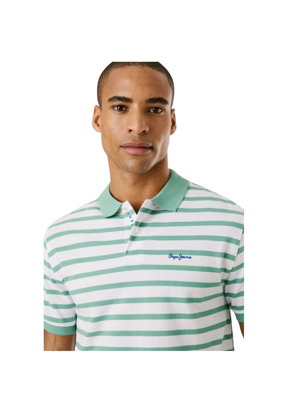 Polo de manga corta y tapeta de dos botones en tejido piqué de algodón. Estampado de rayas en hilos teñidos. Tiene acabado doble pespunte en bajo.