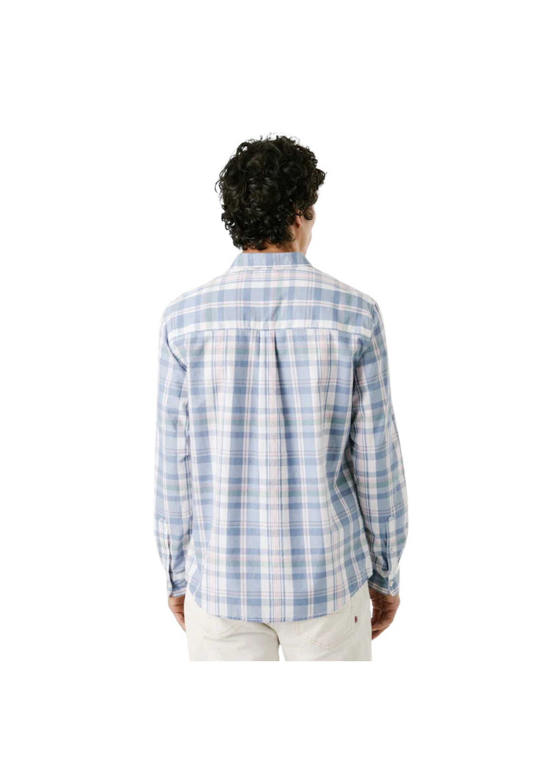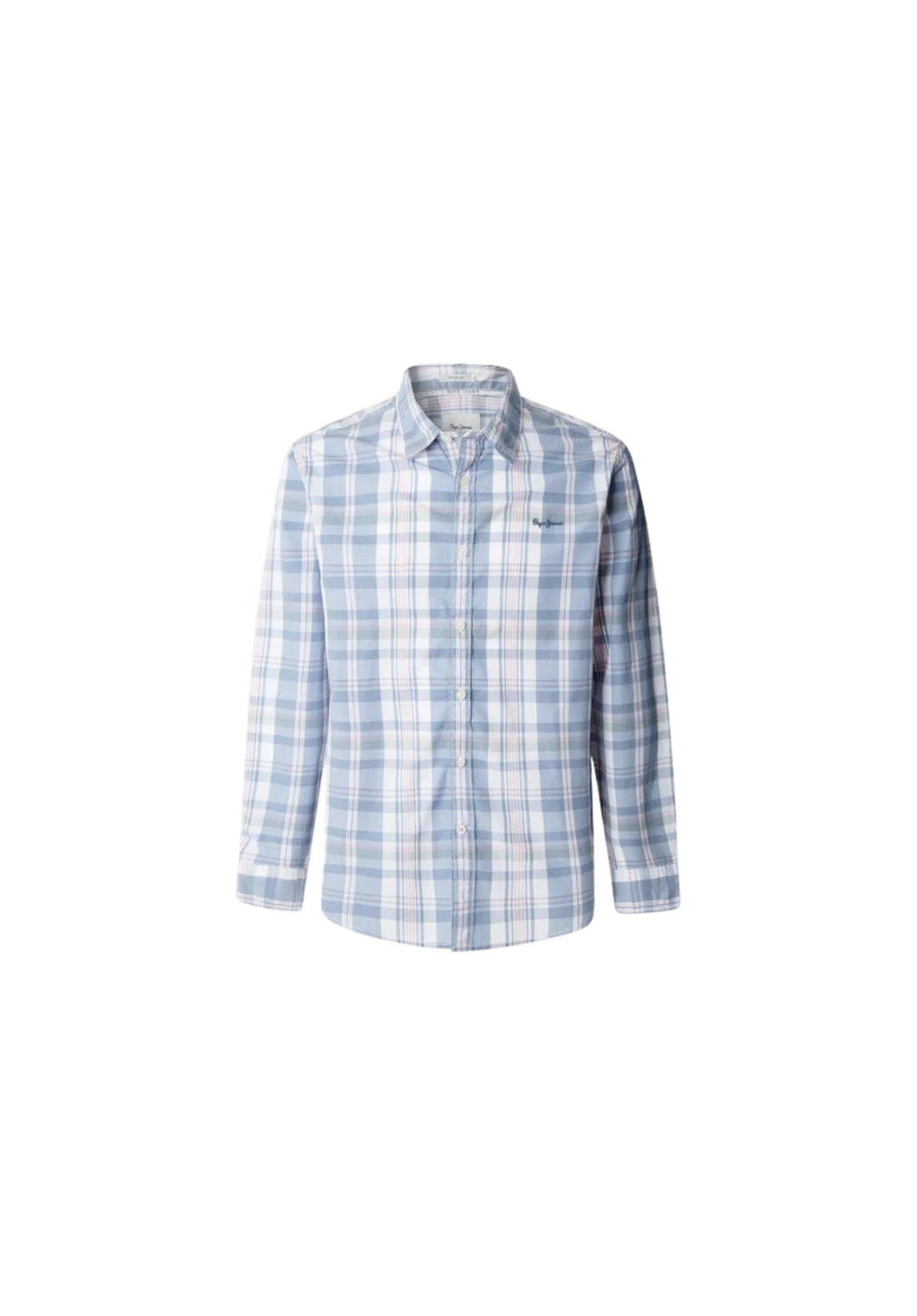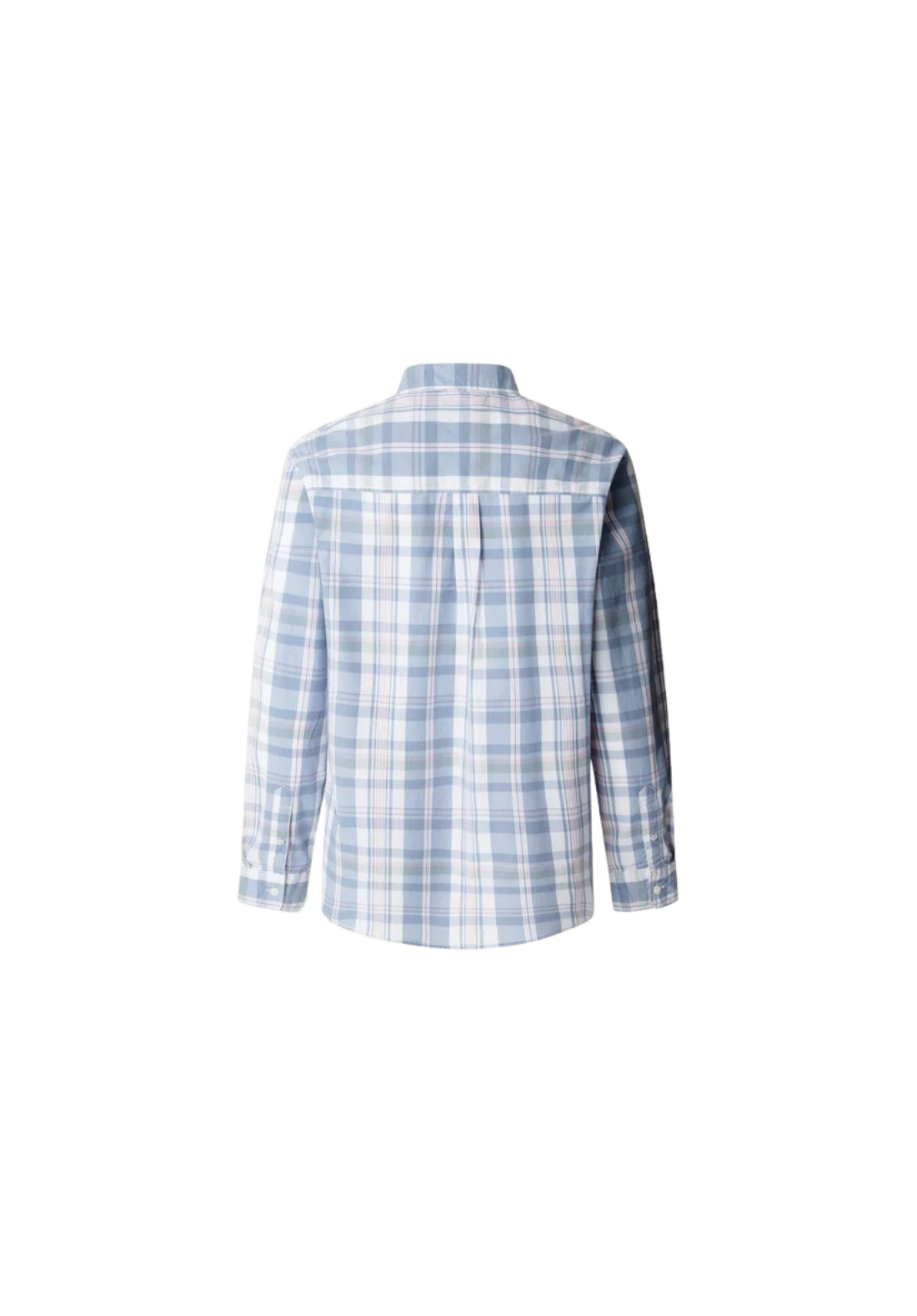 Camisa ligera de popelina de manga larga y cuello clásico. Tiene los puños redondeados con dos botones y pliegue central en la espalda.