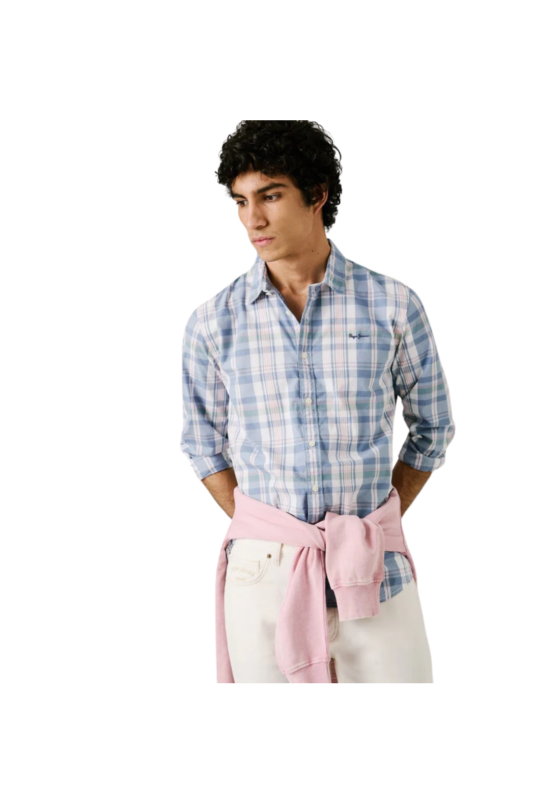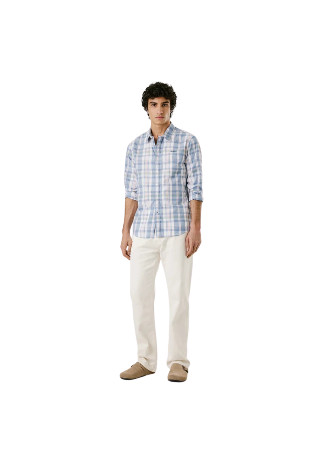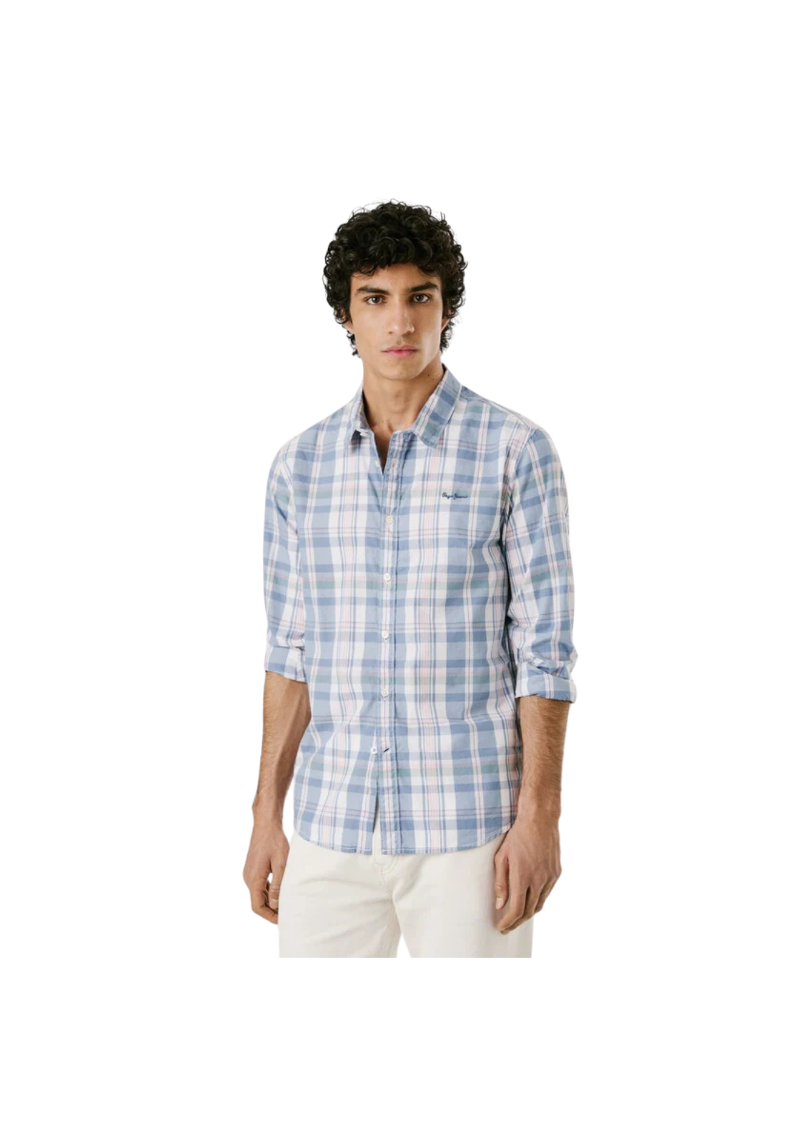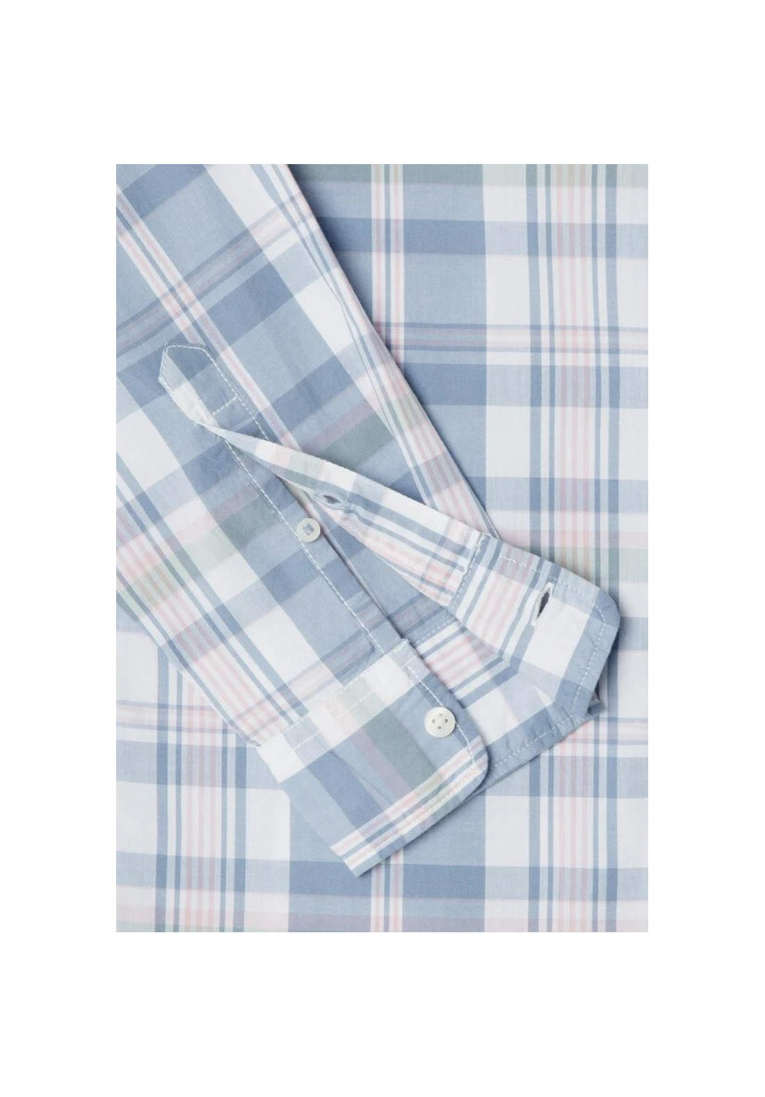Camisa ligera de popelina de manga larga y cuello clásico. Tiene los puños redondeados con dos botones y pliegue central en la espalda.