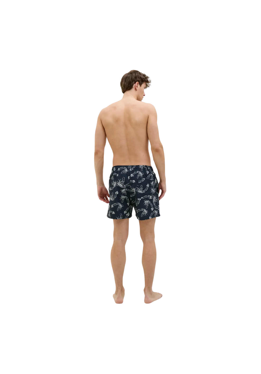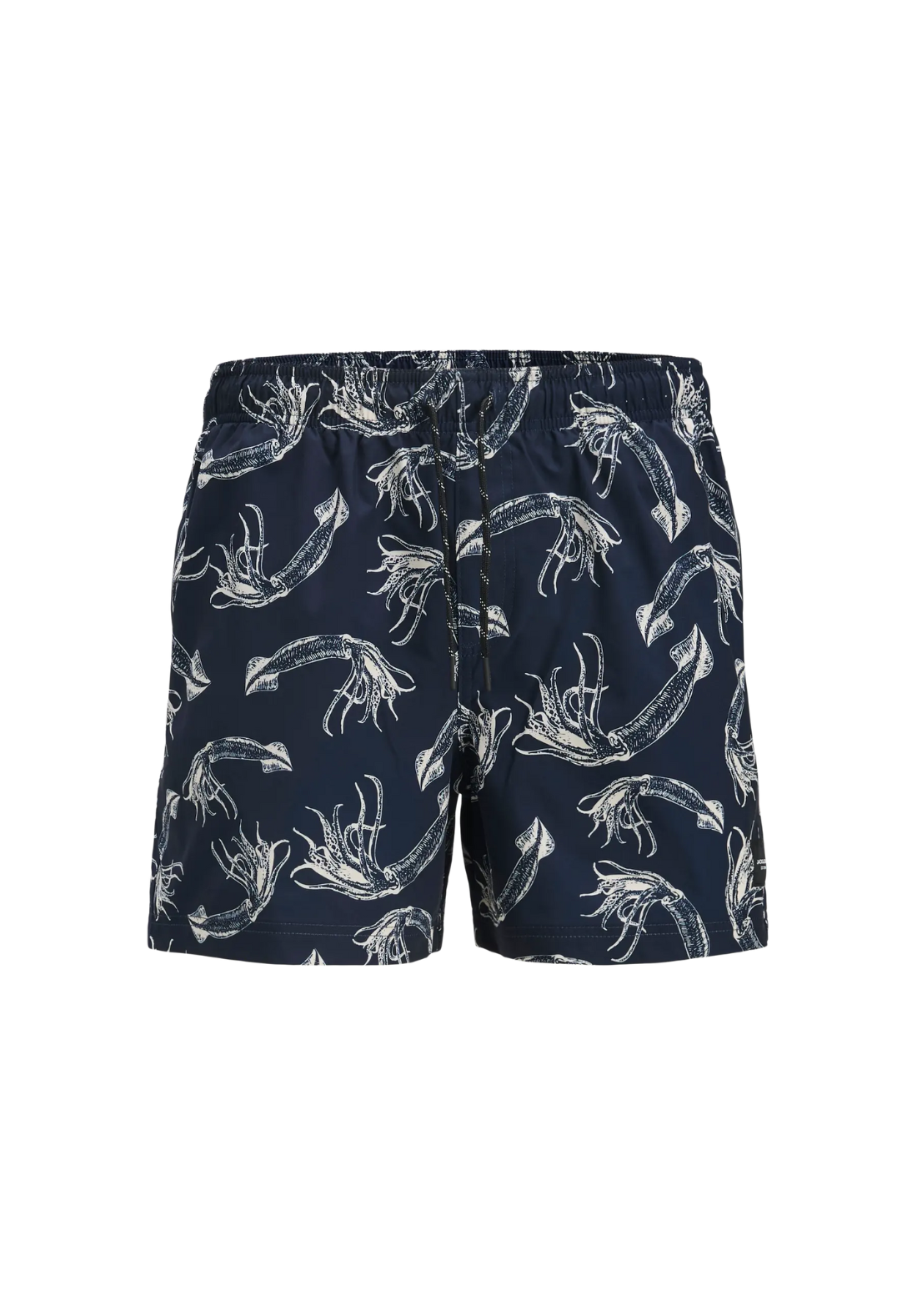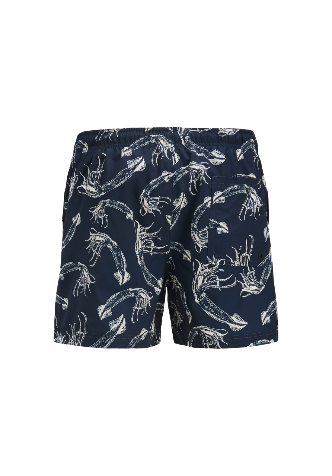 Bañador corto con dos bolsillos delanteros verticales y uno trasero horizontal. Es de talle medio y tiene cordón ajustable a la cintura. La cinturilla es elástica