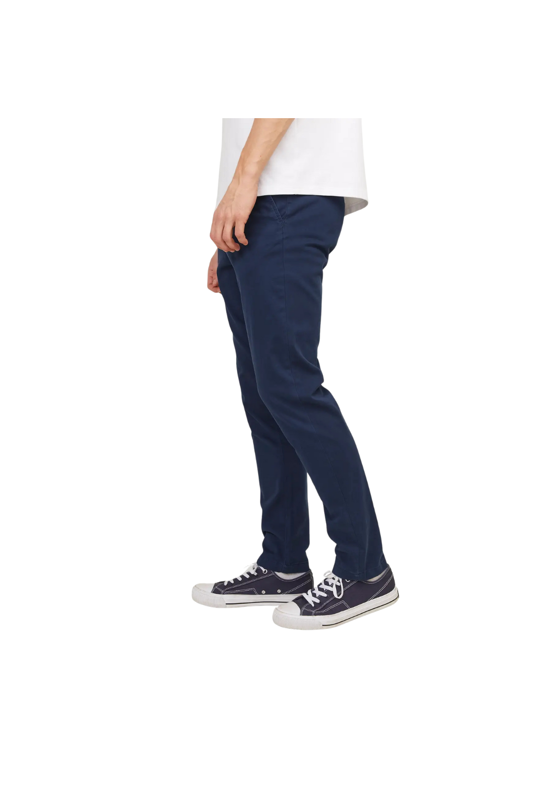 Pantalón chino con cierre de botón y cremallera. Tiene bolsillos verticales delanteros y dos bolsillos traseros. Es de tiro bajo.