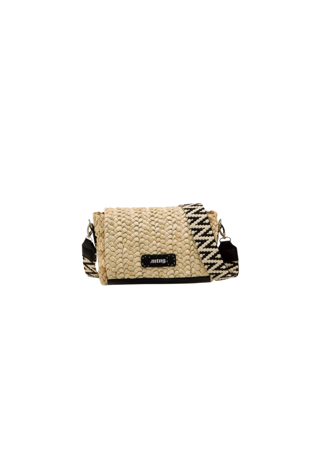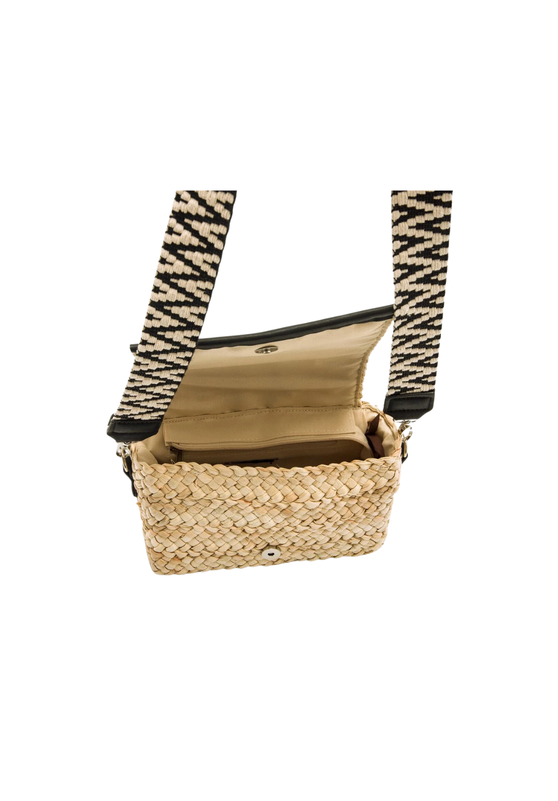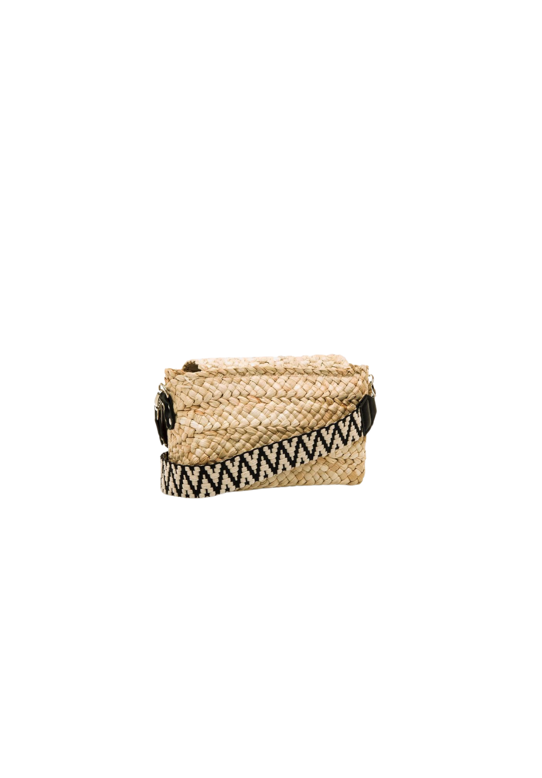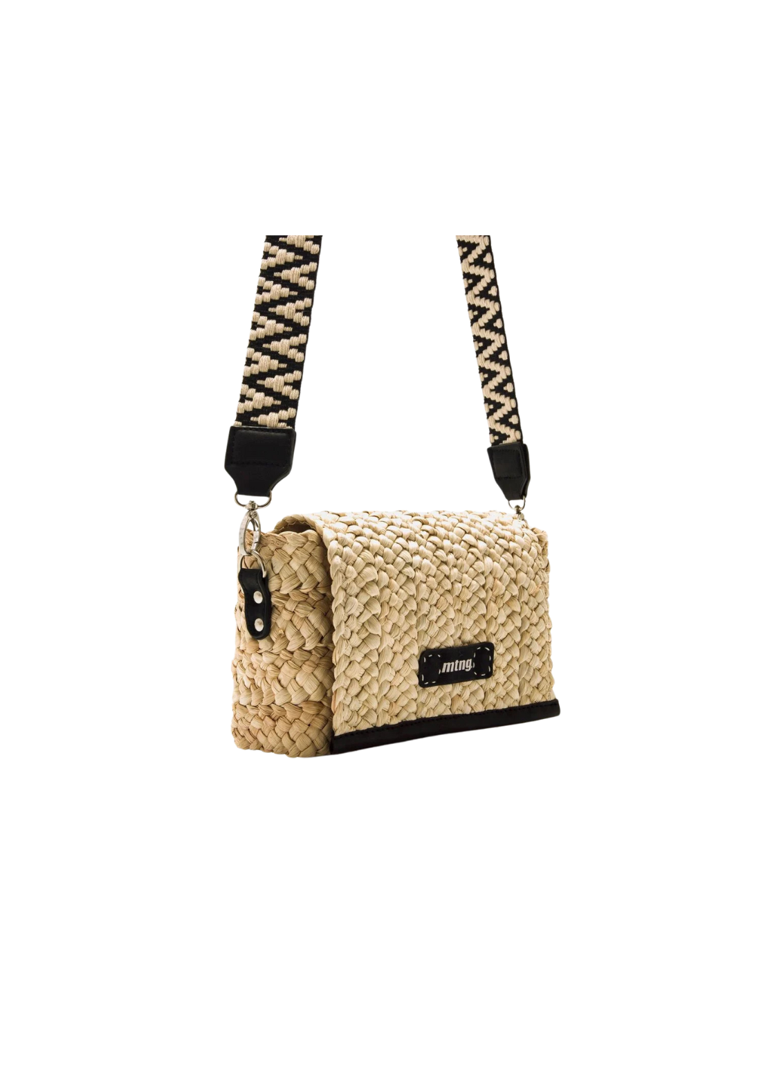 Bolso bandolera diseñado con material vegetal de color natural. Este bolso combina un diseño trenzado con una correa ajustable étnica en tonos verdes que añade un toque bohemio y original, perfecta para complementar cualquier look casual. Puedes llevarlo cómodamente al hombro o cruzado.
