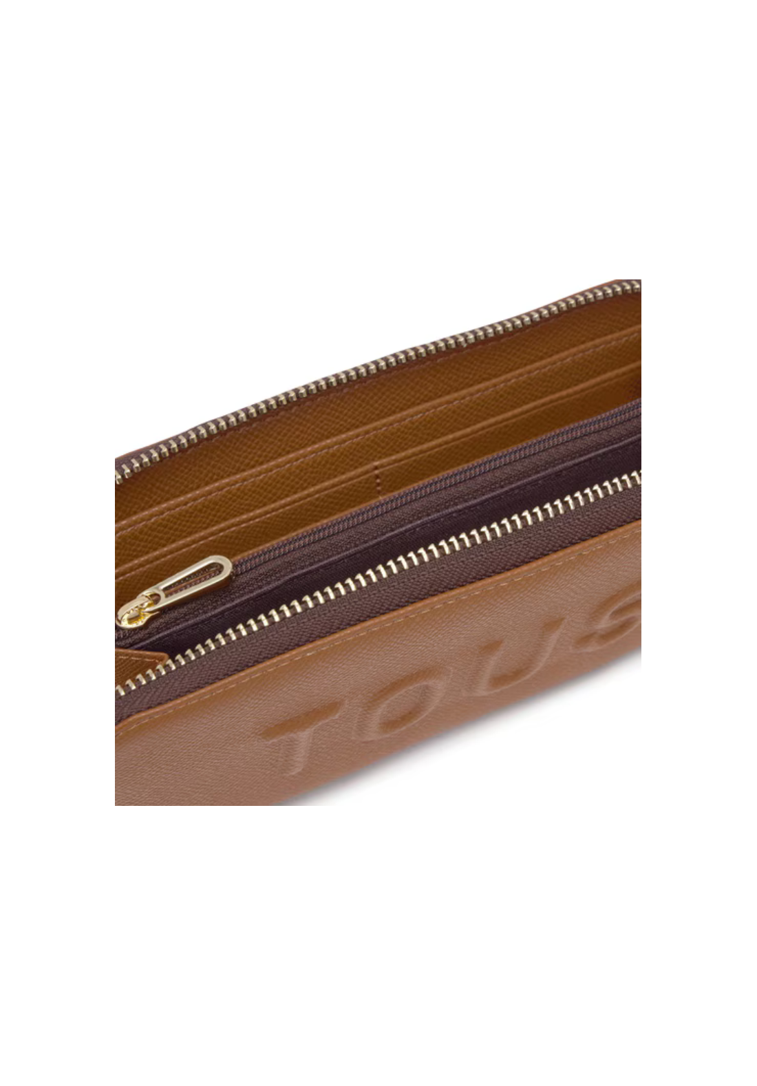 Billetera TOUS Brenda de poliuretano con cierre de cremallera. En el interior cuenta con dos compartimentos abiertos para billetes, un compartimento con cremallera para monedas y ocho ranuras para tarjetas.