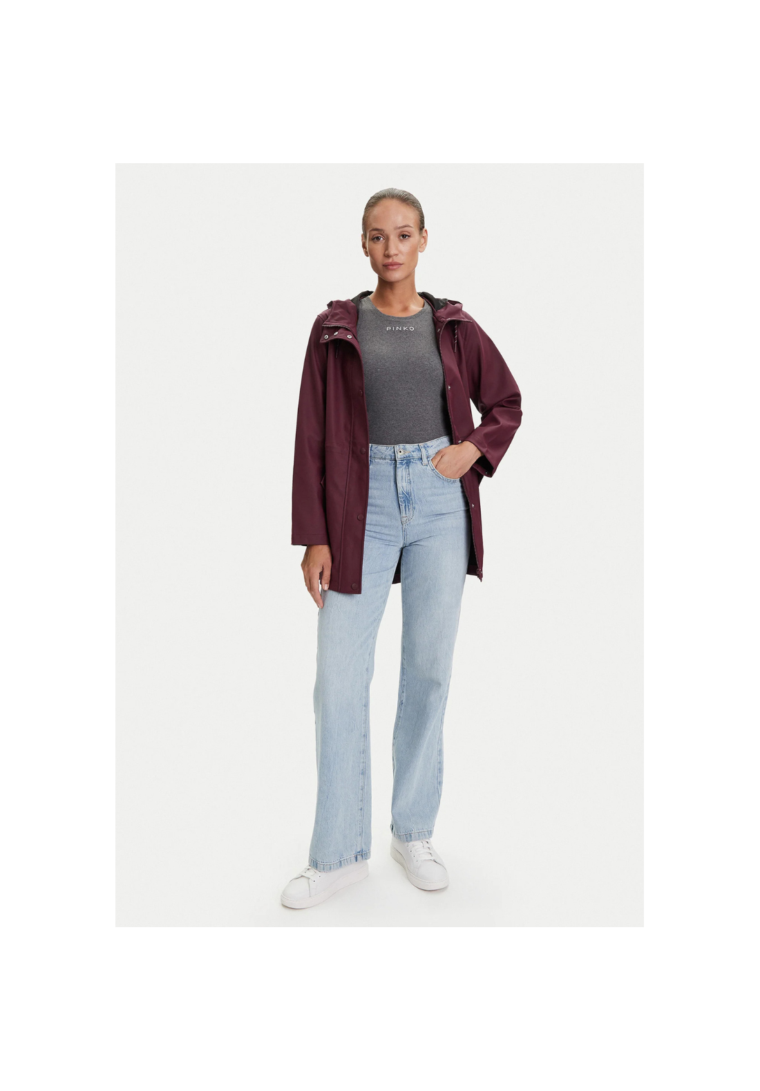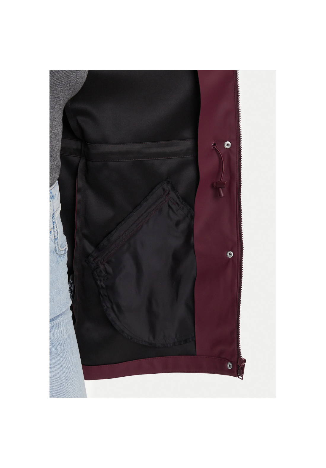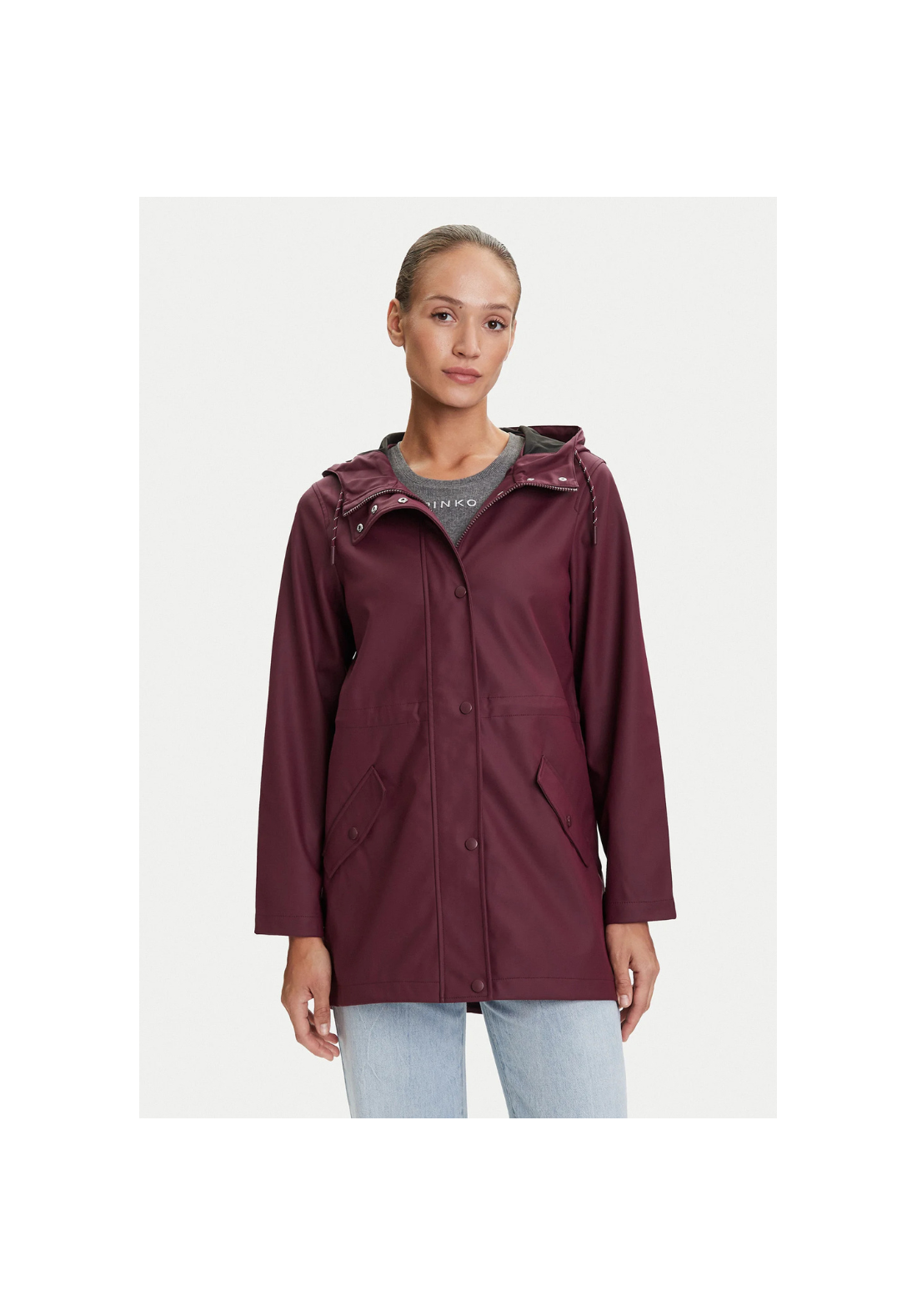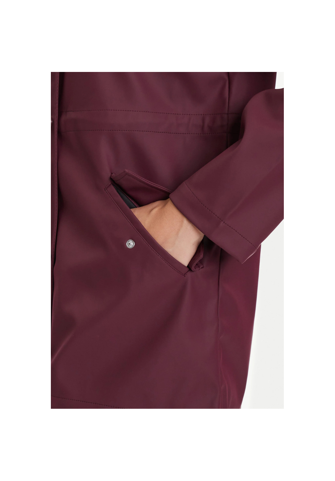 Chaqueta impermeable con capucha. Tiene bolsillos laterales con cierre de botón a presión y un cordón en la cintura para ajustarla.