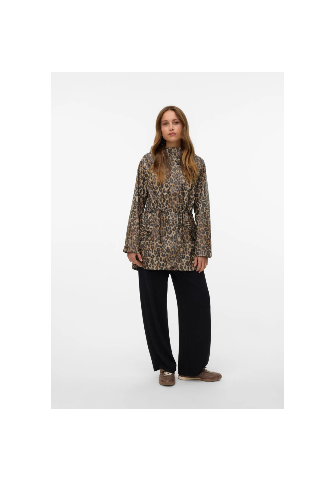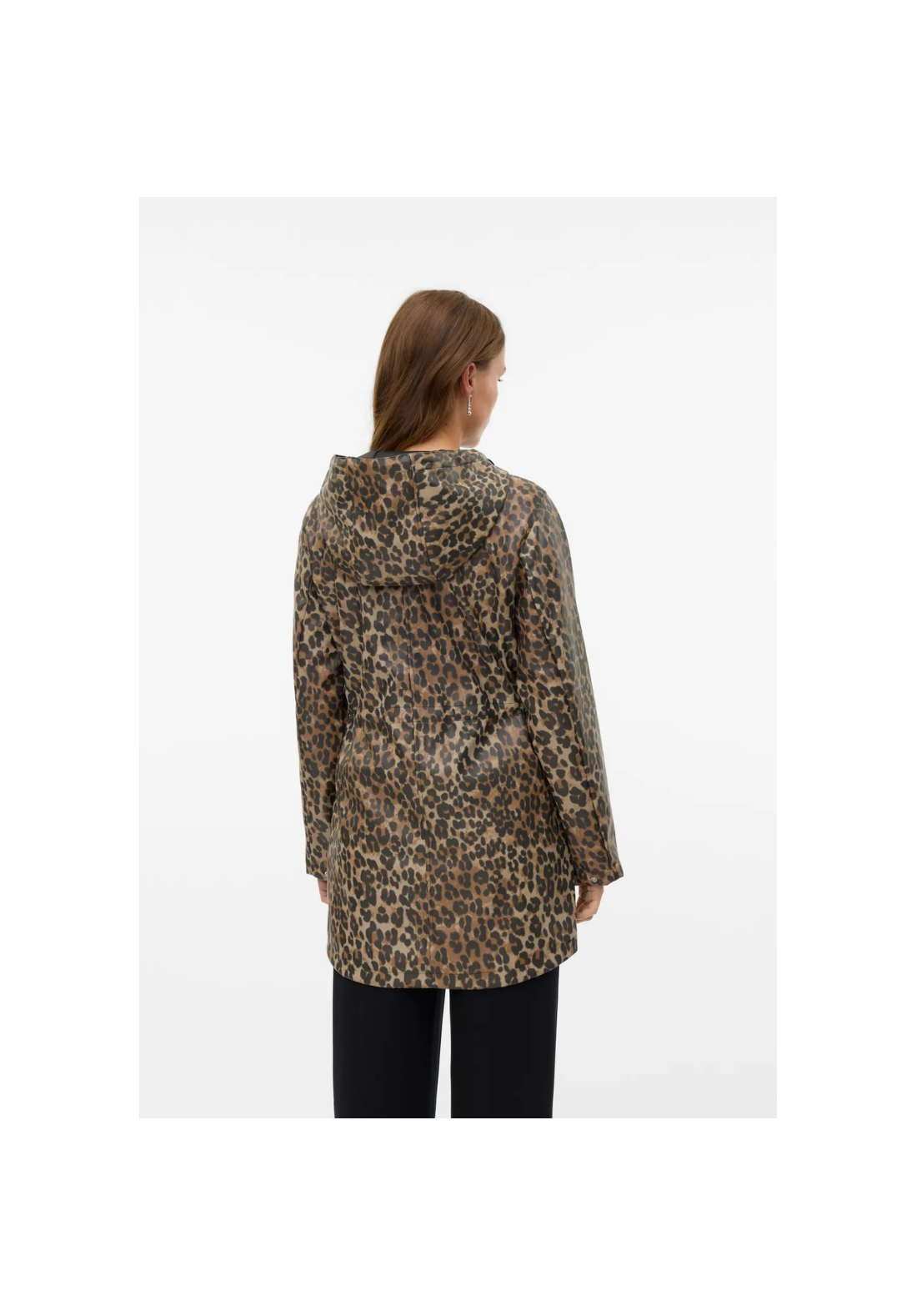 Chaqueta impermeable con capucha. Tiene bolsillos laterales con cierre de botón a presión y un cordón en la cintura para ajustarla.
