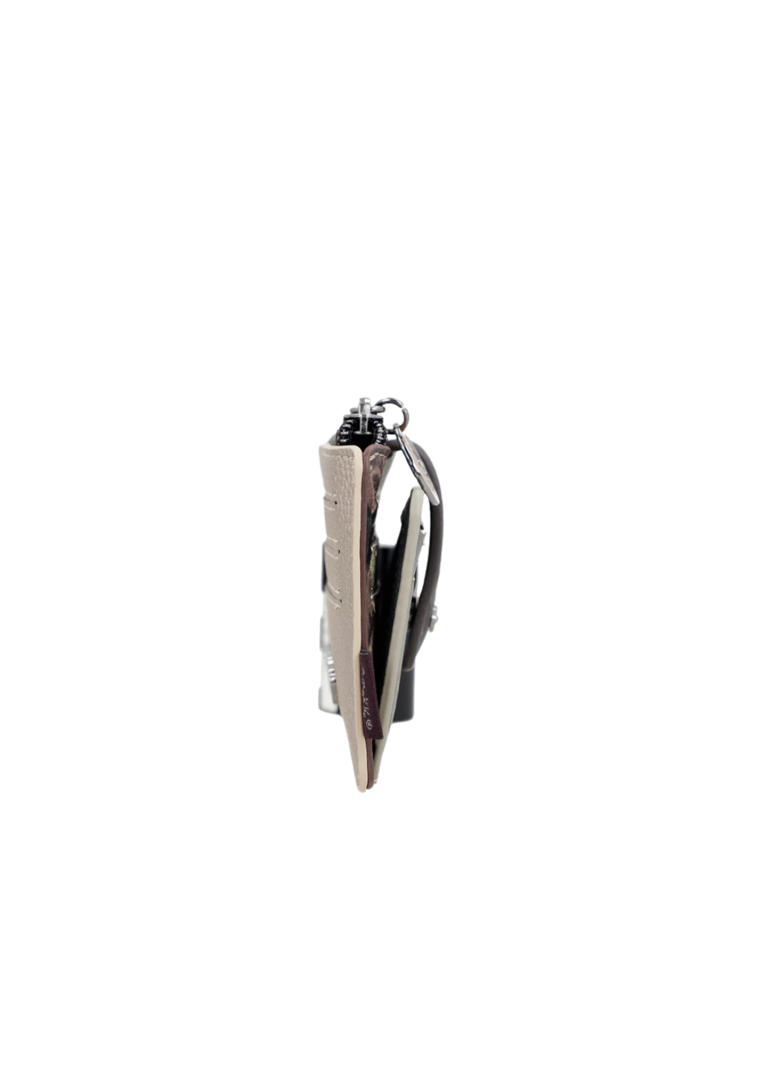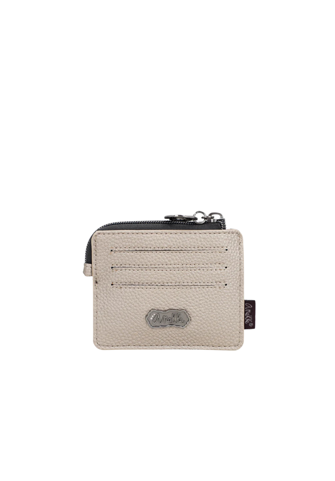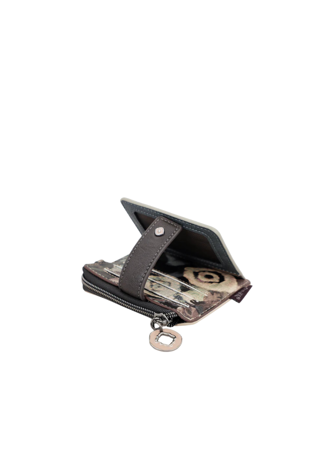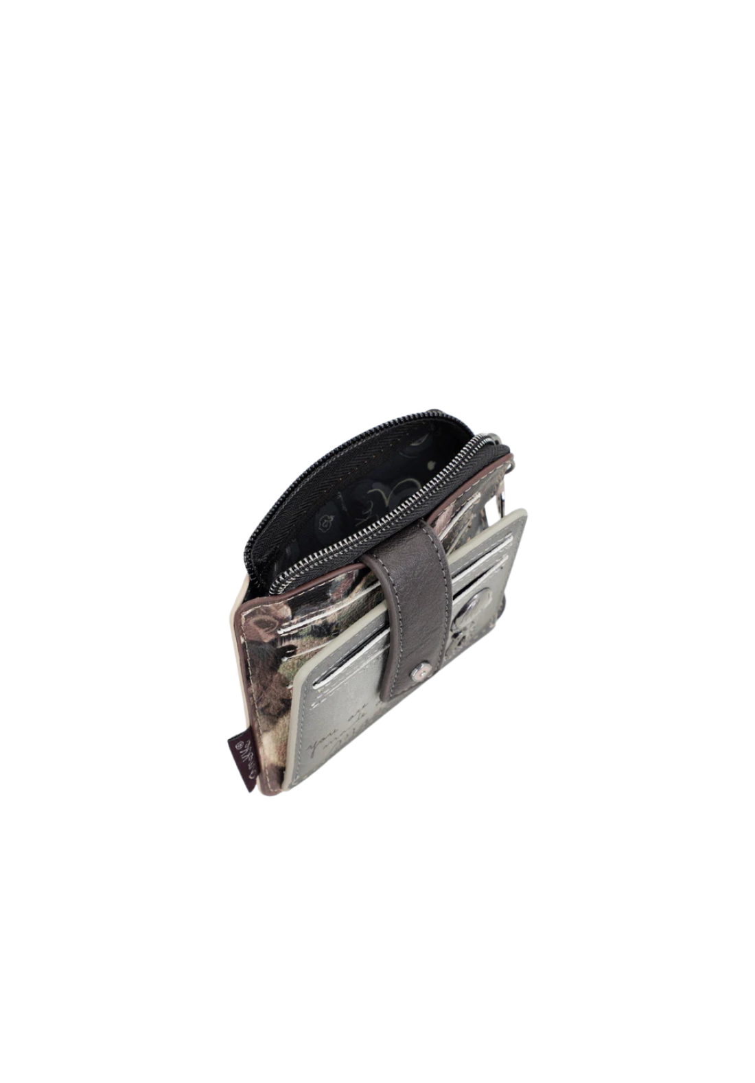 Tarjetero con cierre de solapa y múltiples bolsillos interiores.