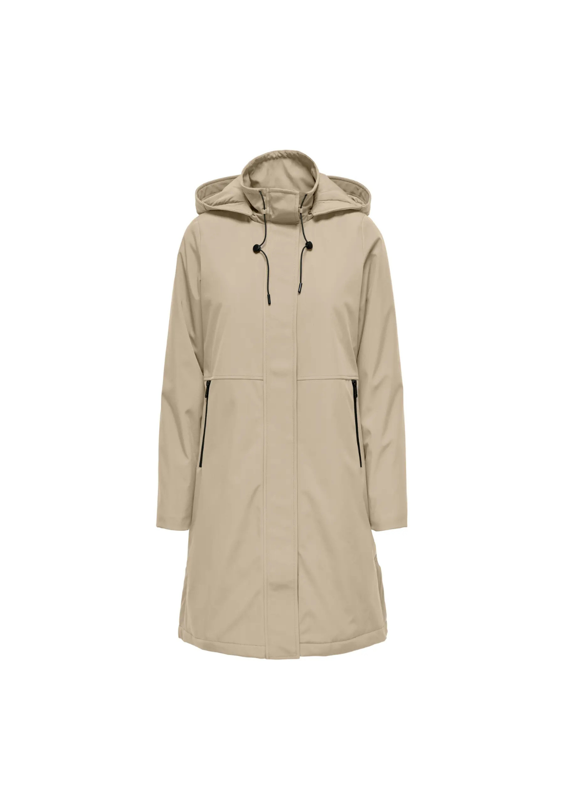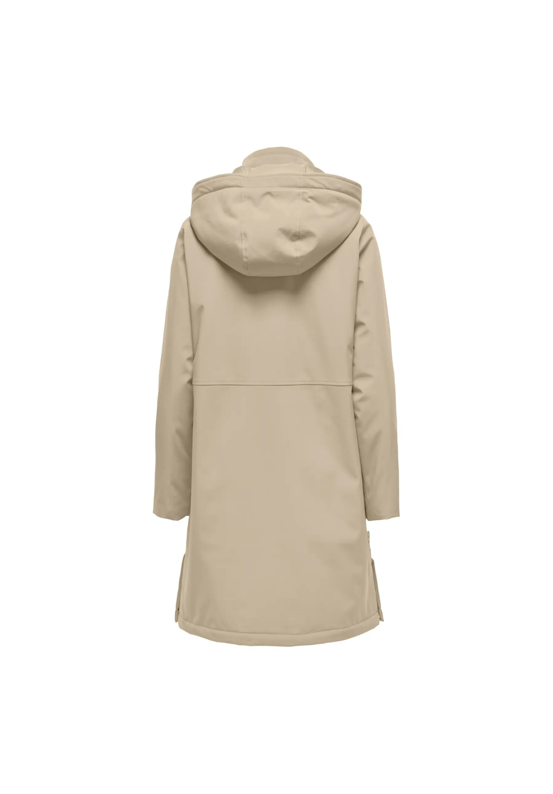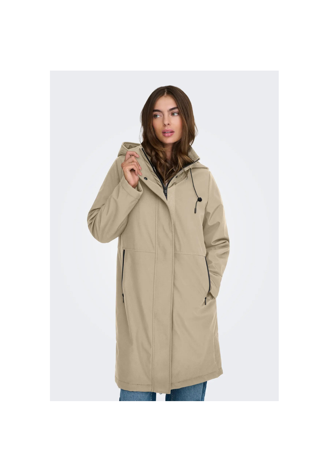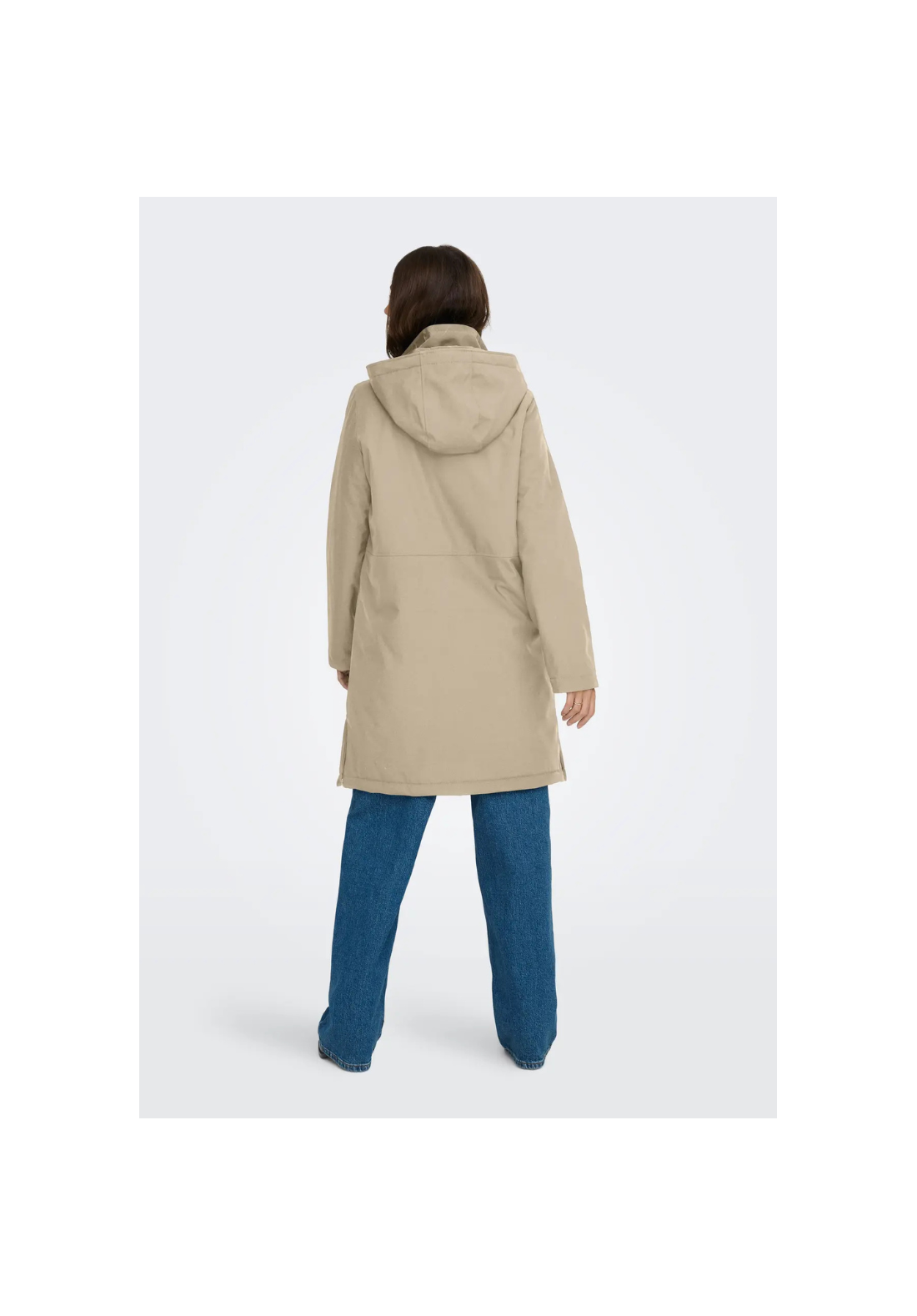 Parka larga, con capucha, cierrre de cremallera y bolsillos laterales con cremallera. Tiene un cordón ajustable en la cintura.