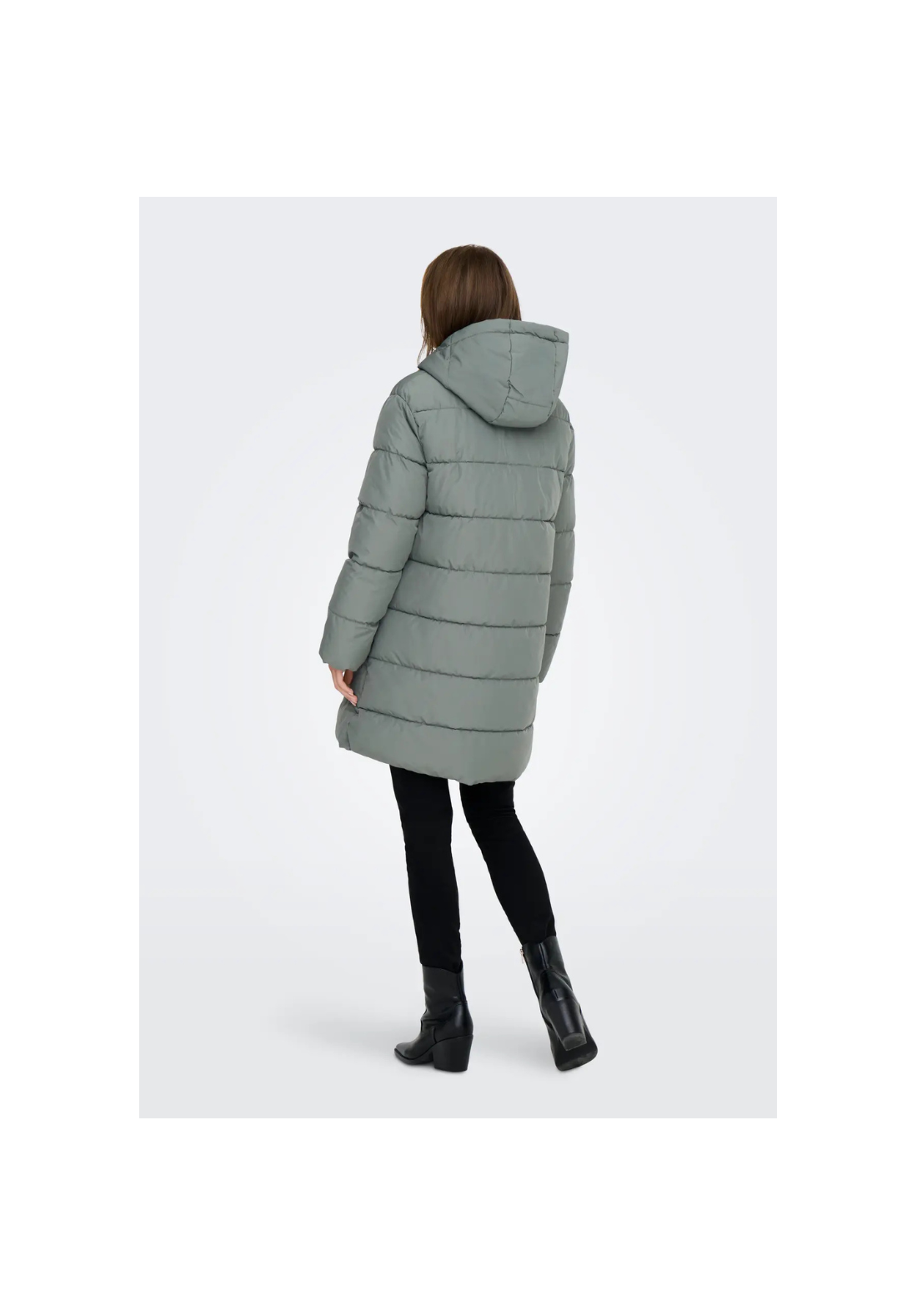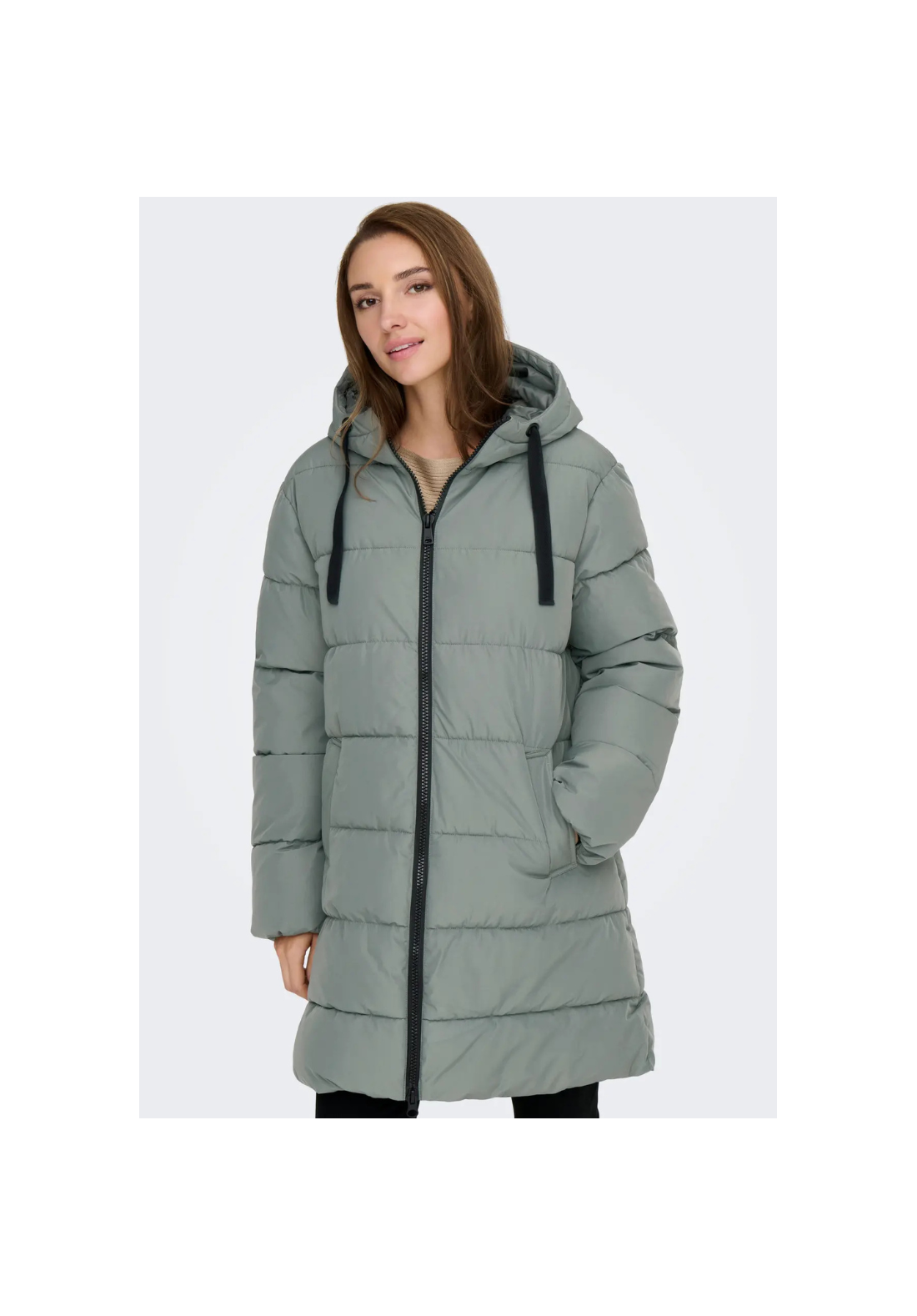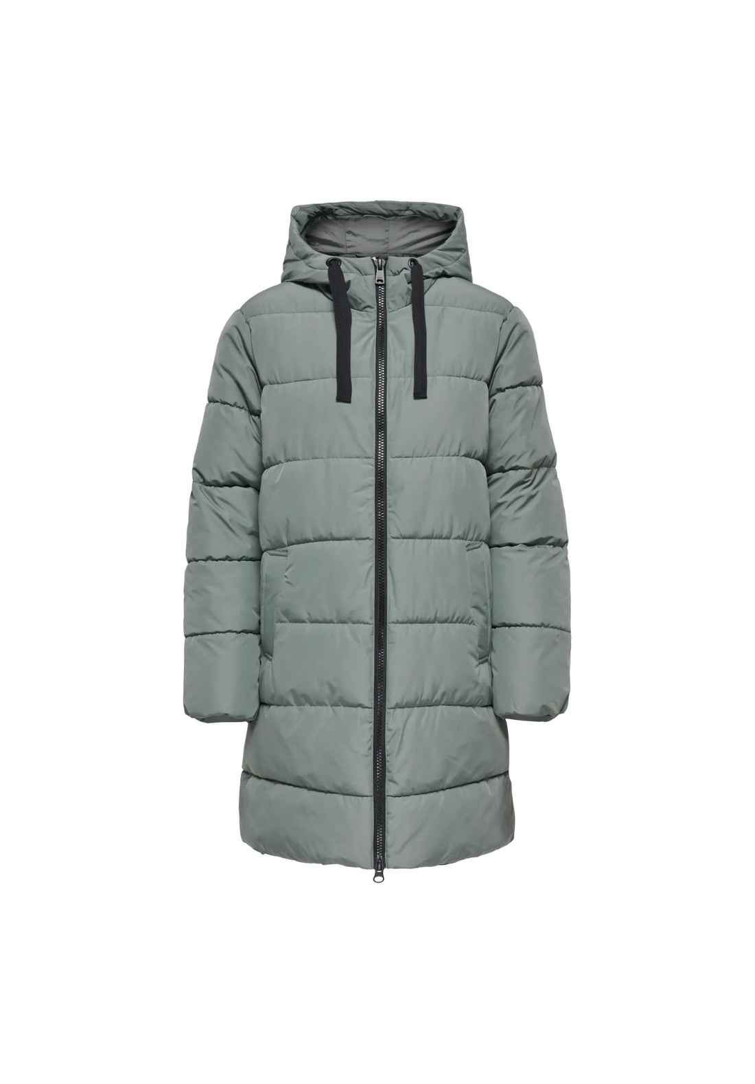 Abrigo largo, con capucha y cierre de cremallera que abre desde arriba y desde abajo. Tiene un cordón en la capucha para ajustarla.