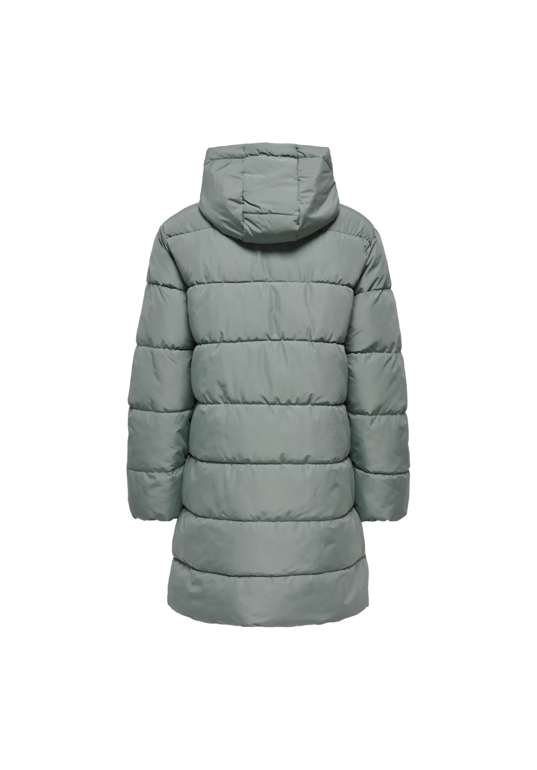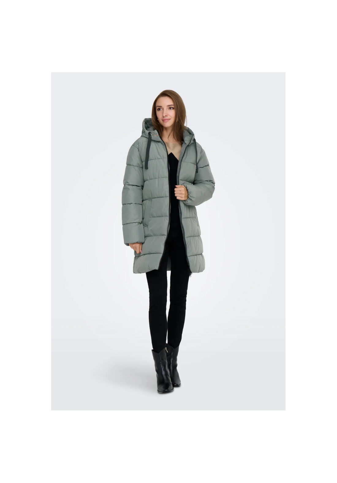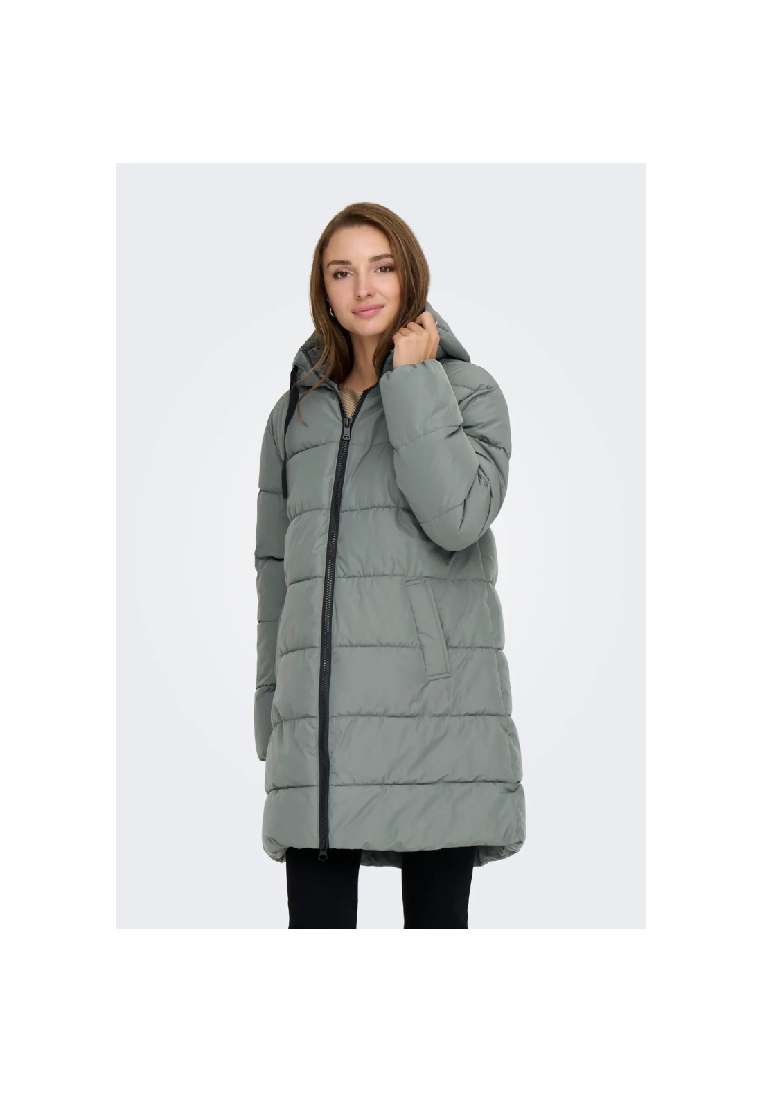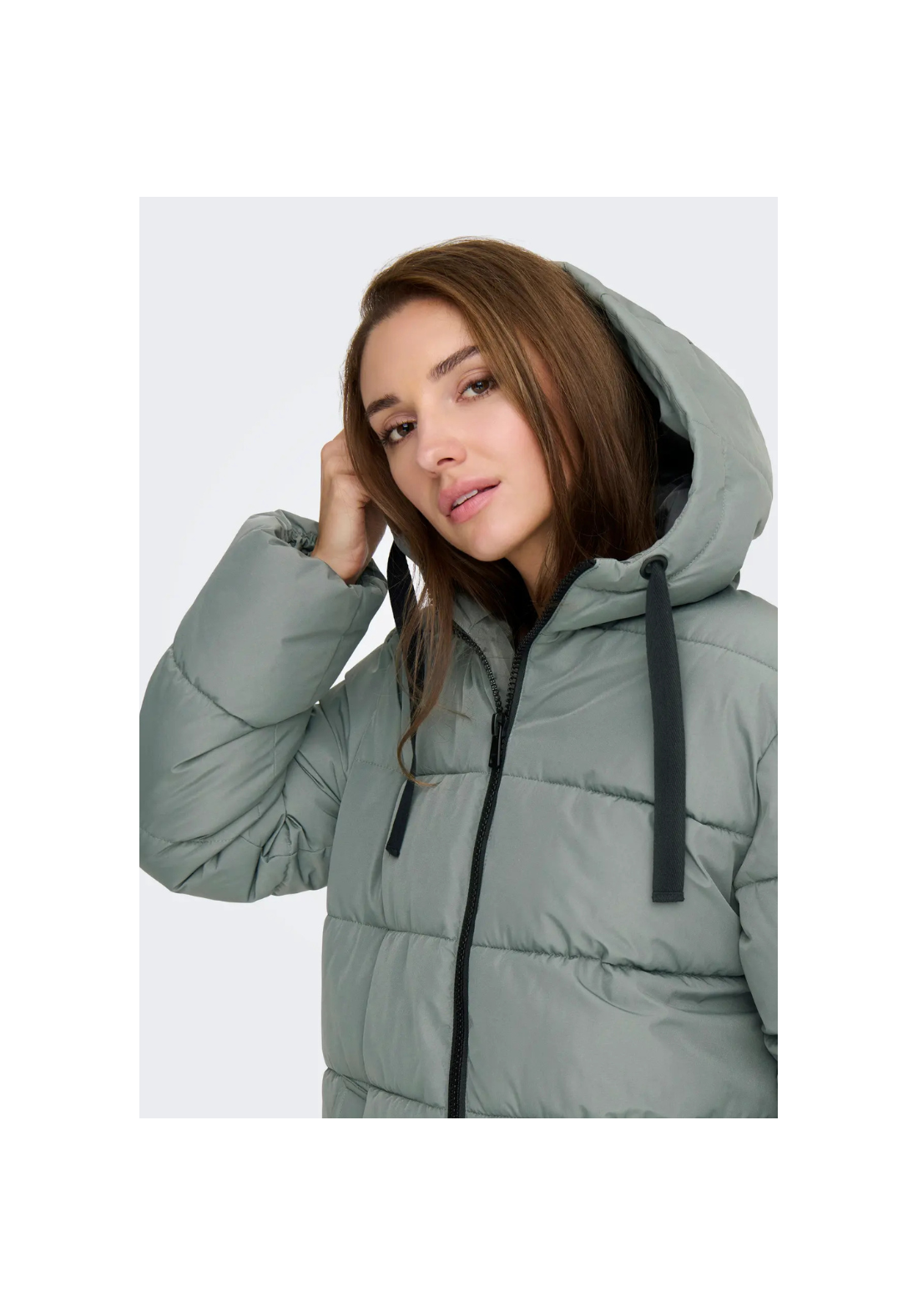 Abrigo largo, con capucha y cierre de cremallera que abre desde arriba y desde abajo. Tiene un cordón en la capucha para ajustarla.