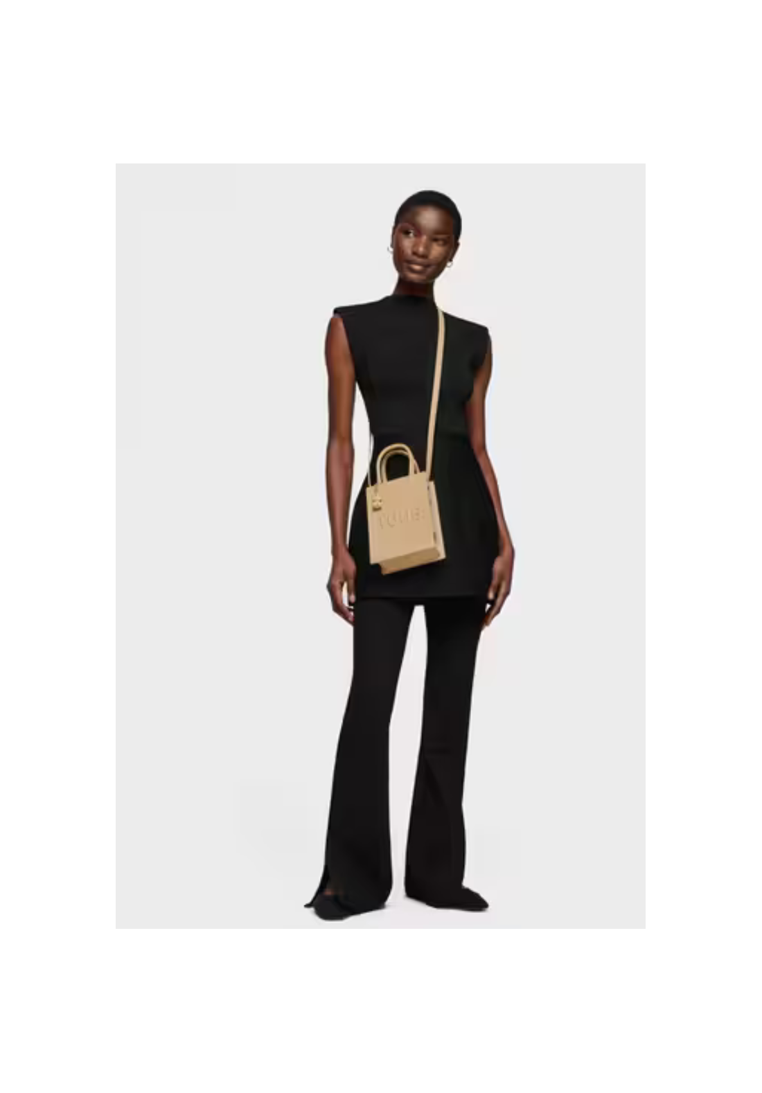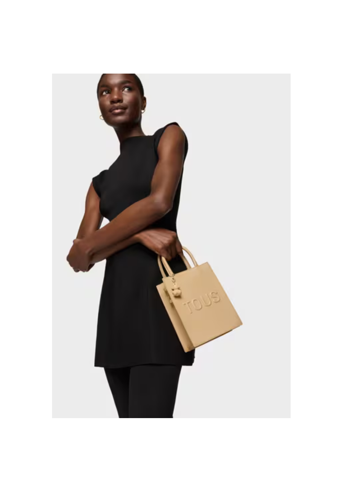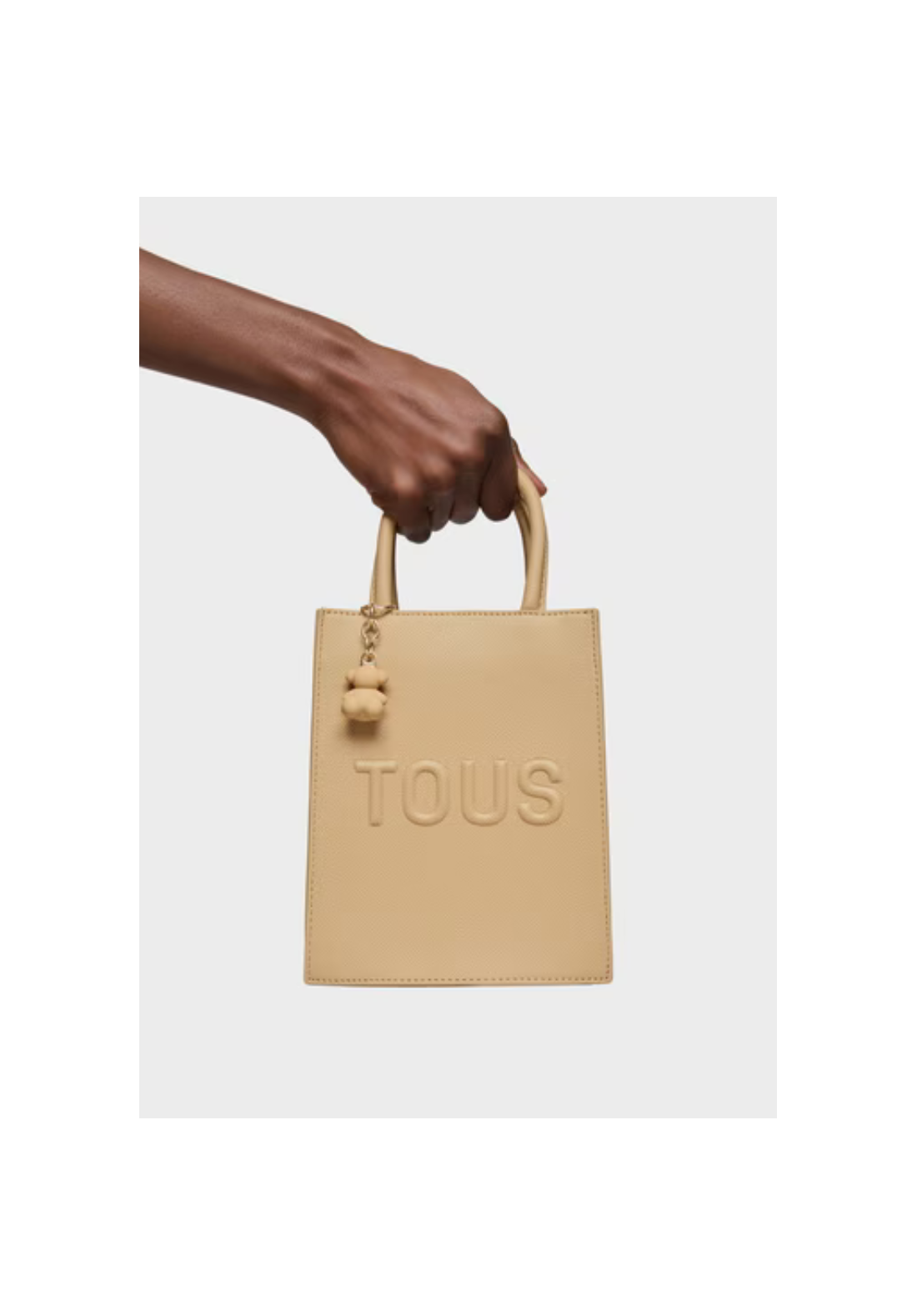 Minibolso Pop TOUS Brenda de poliuretano en color arena. Cierre con botón magnético. Asas fijas de mano y asa bandolera ajustable y desmontable. Incorpora un bonito detalle de oso colgante. Medidas (alto x ancho x fondo): 20 x 16 x 7 cm.