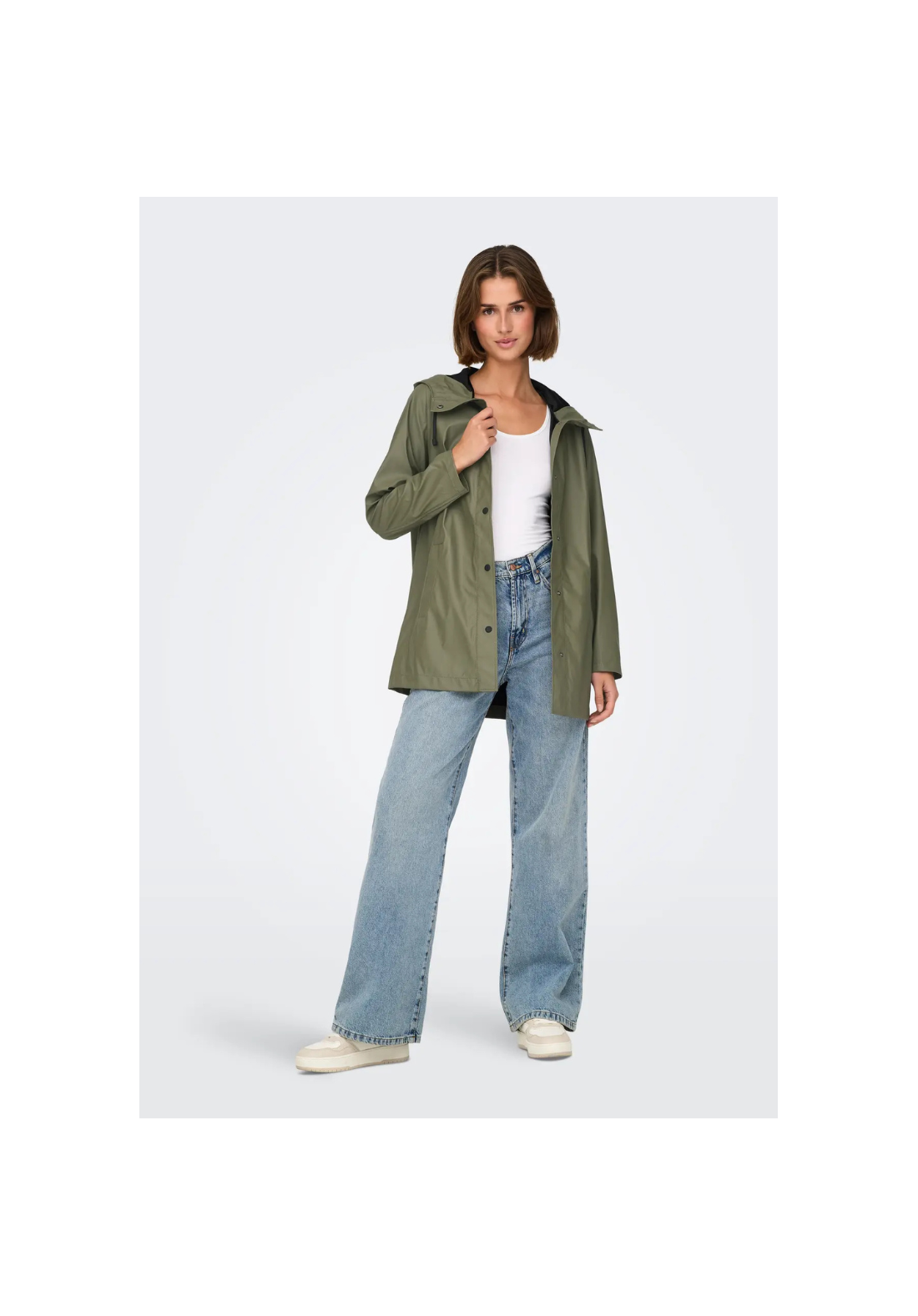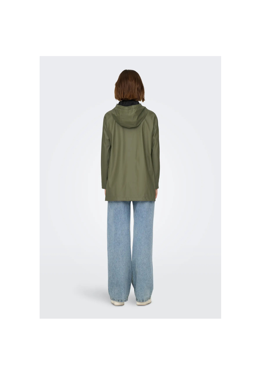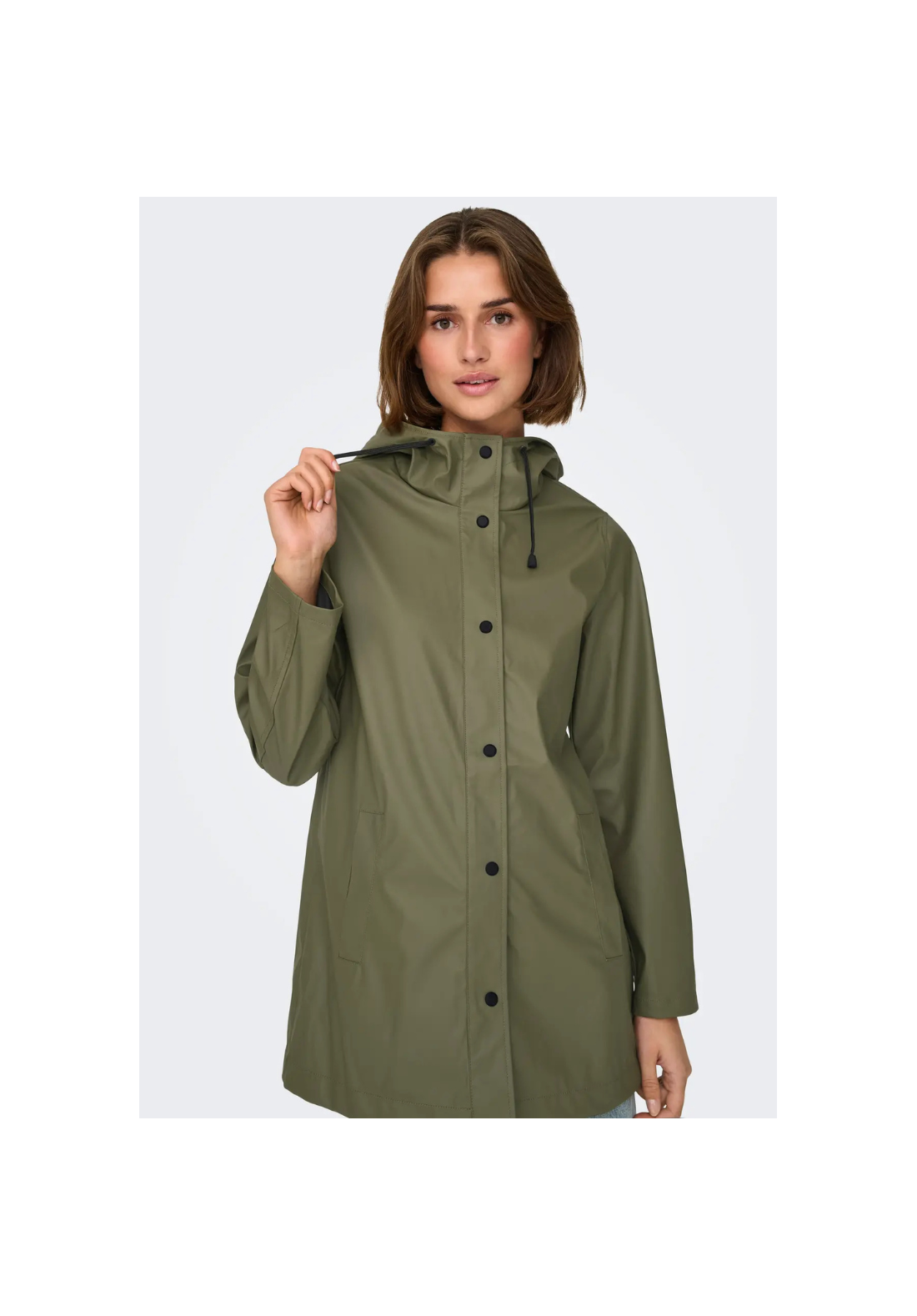 Chubasquero con capucha, cierre de botones y bolsillos laterales. Tiene un cordón ajustable en el bajo. Es repelente al agua.