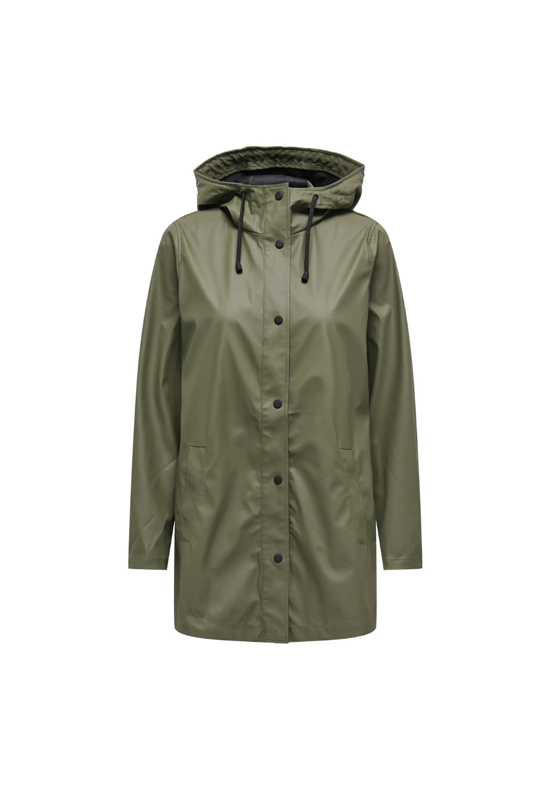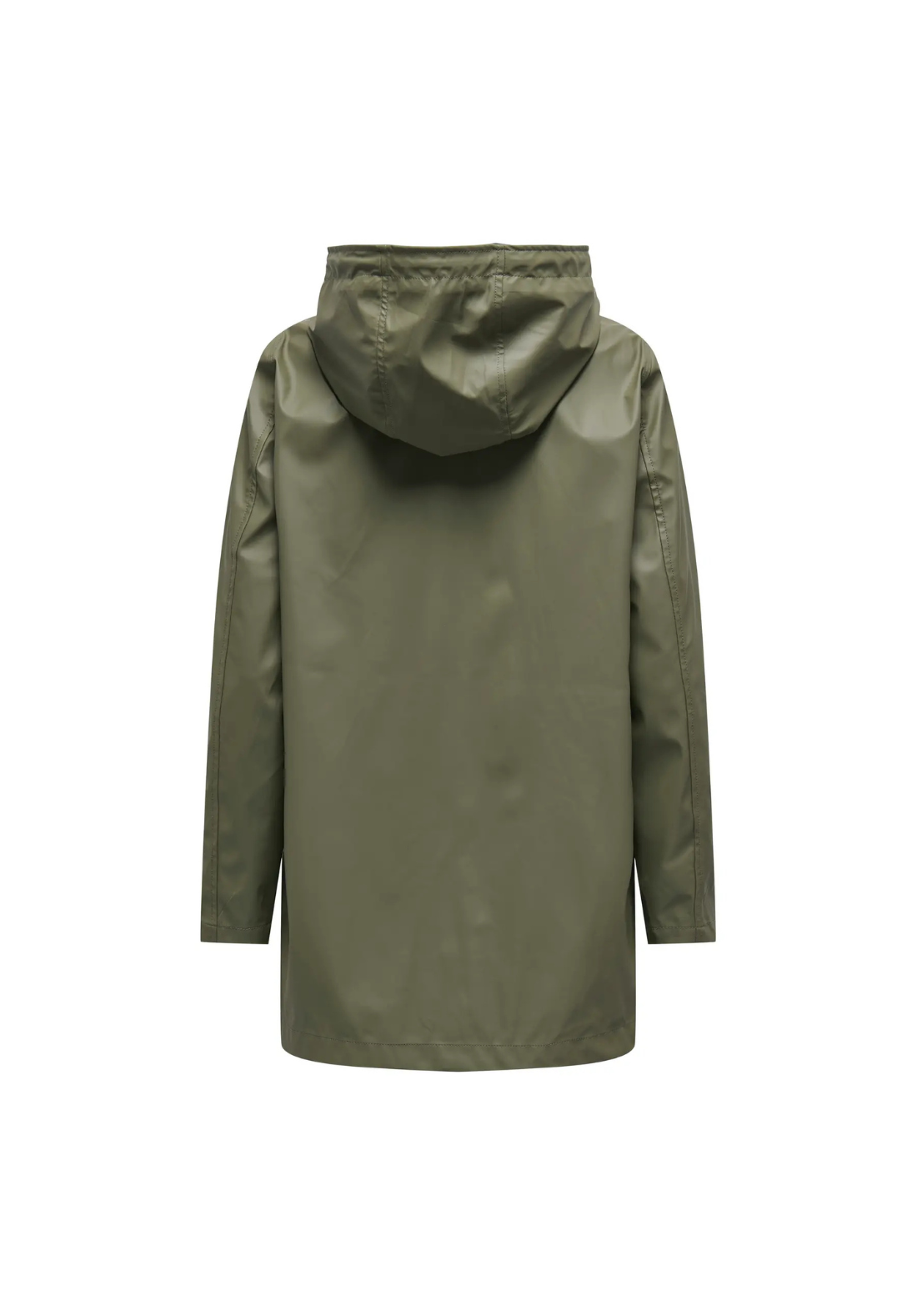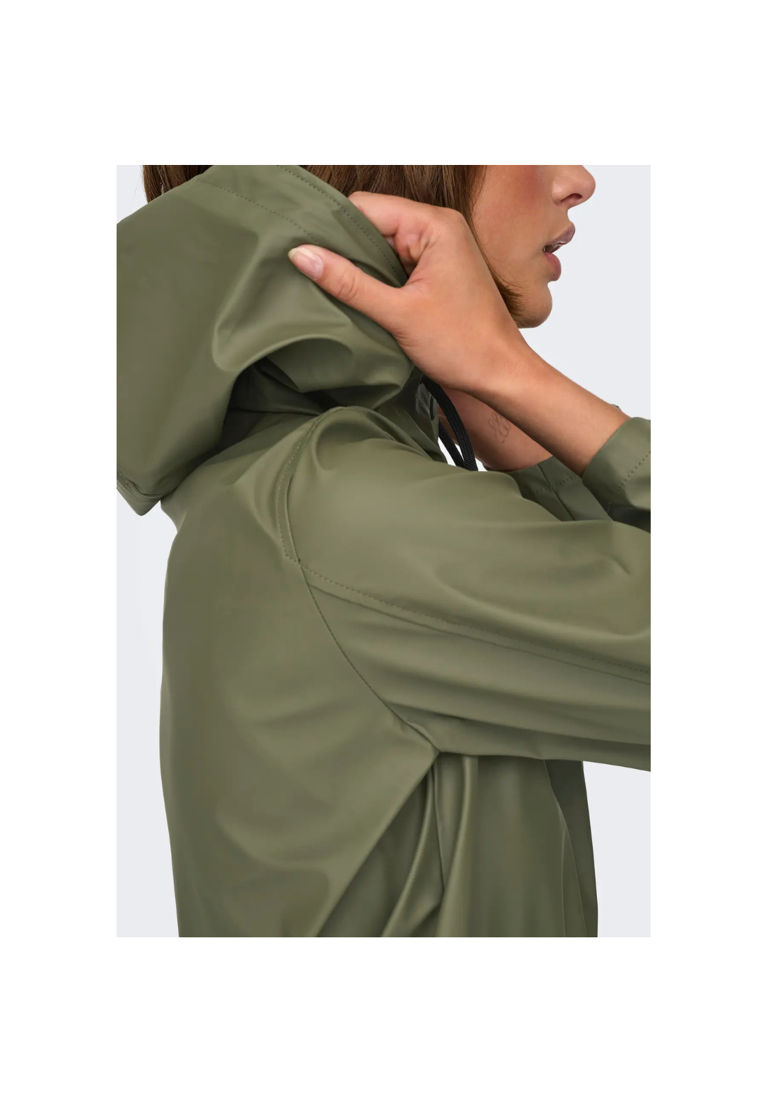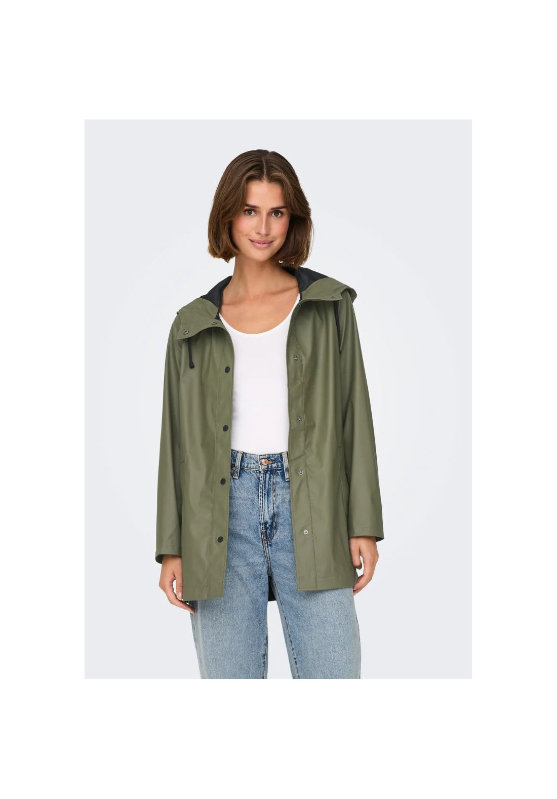 Chubasquero con capucha, cierre de botones y bolsillos laterales. Tiene un cordón ajustable en el bajo. Es repelente al agua.