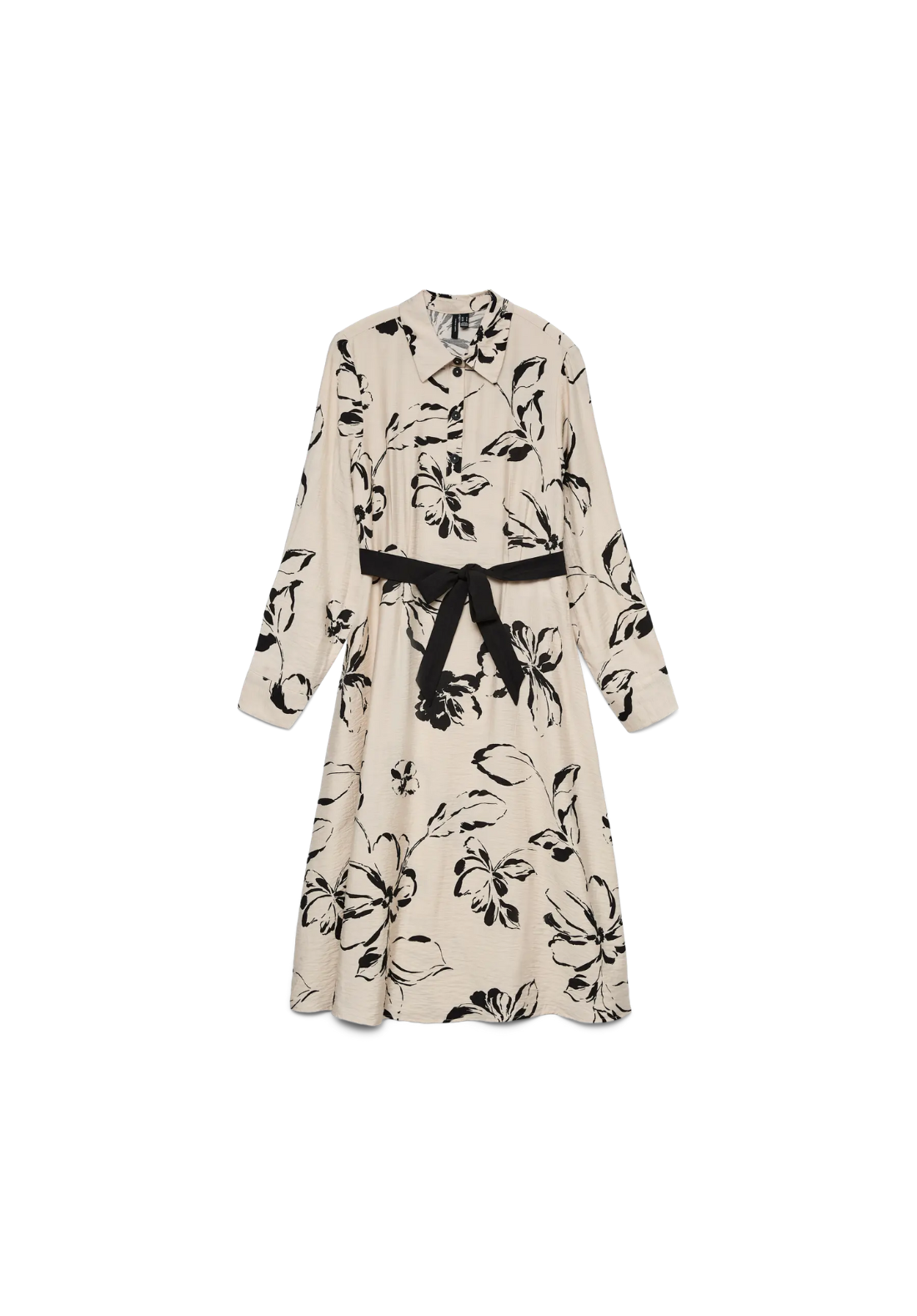 Vestido camisero, de manga larga, con cuello camisero y puños abotonados. Cierre con un cuarto de botón y cinturón en la cintura. El largo es midi.