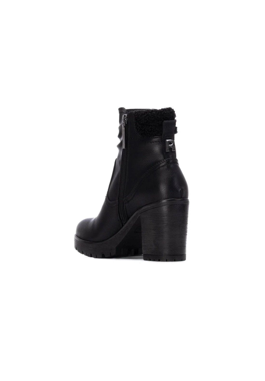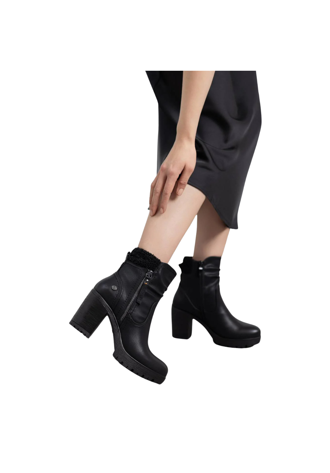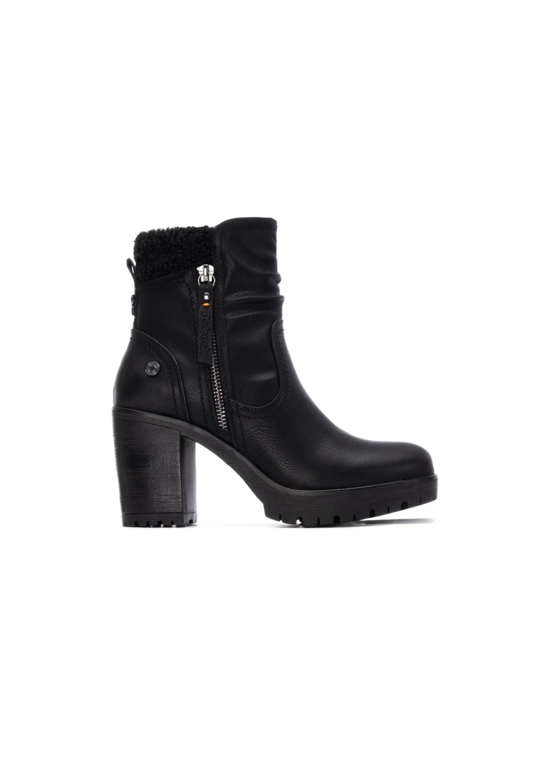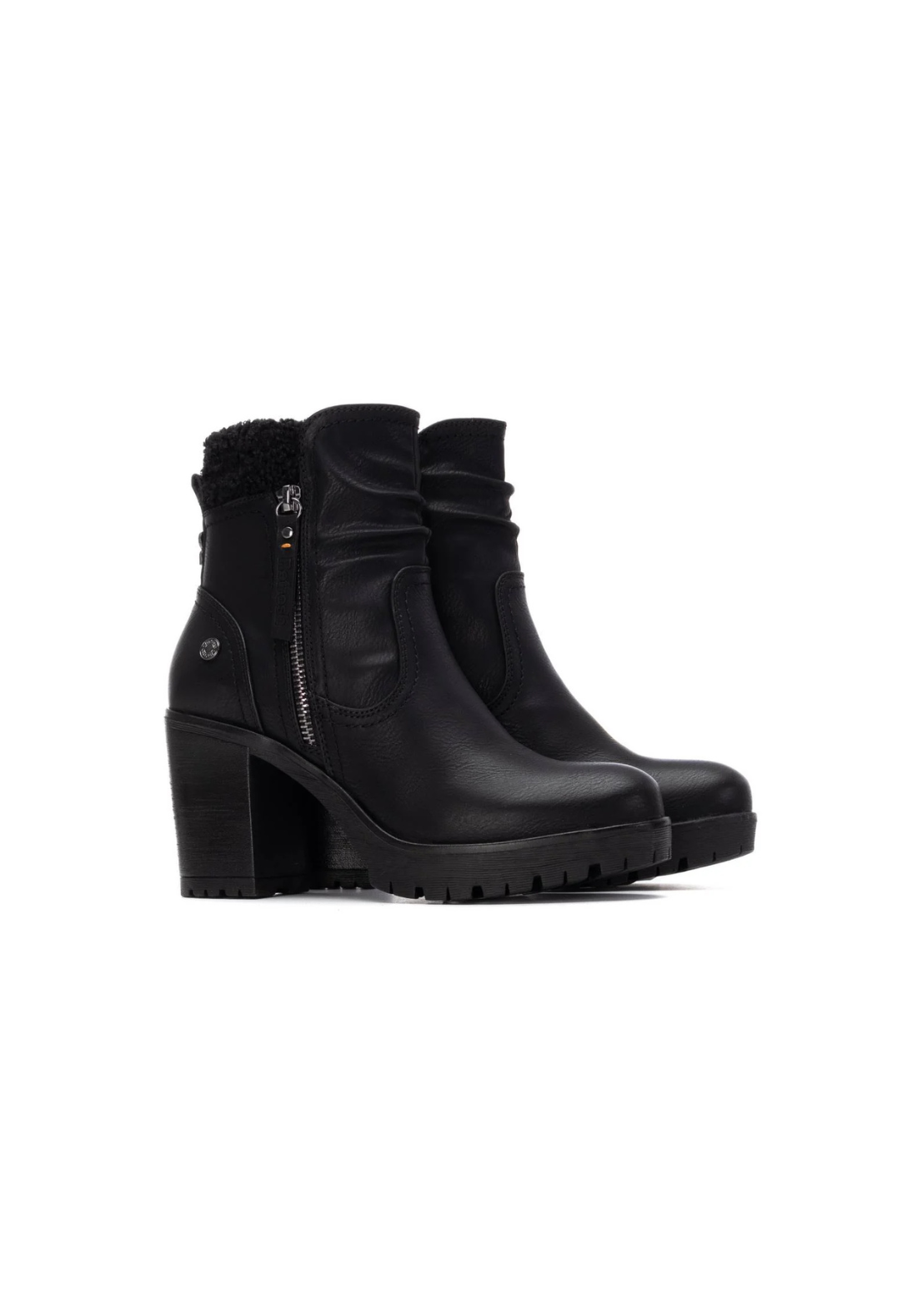 Botín fabricado en material que imita a la piel con acabado cepillado. Cremallera lateral decorativa. Cierre mediante cremallera interior. Tacón de 9 cm con suela de goma. Plantilla extraíble. Este modelo ha obtenido el certificado vegano por la organización mundial PETA (Organización de los derechos de los animales).
