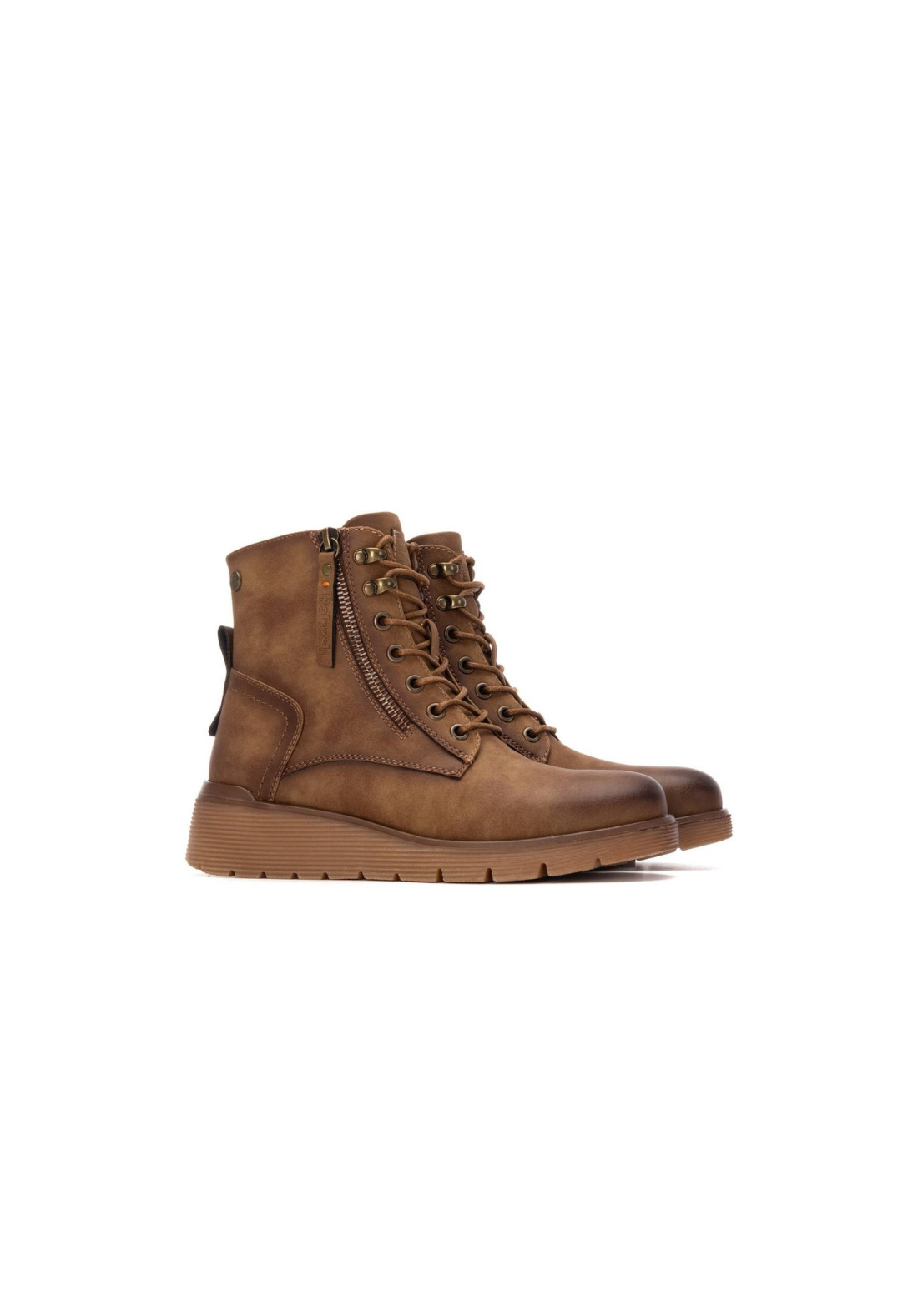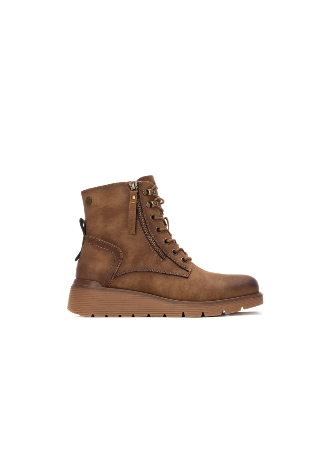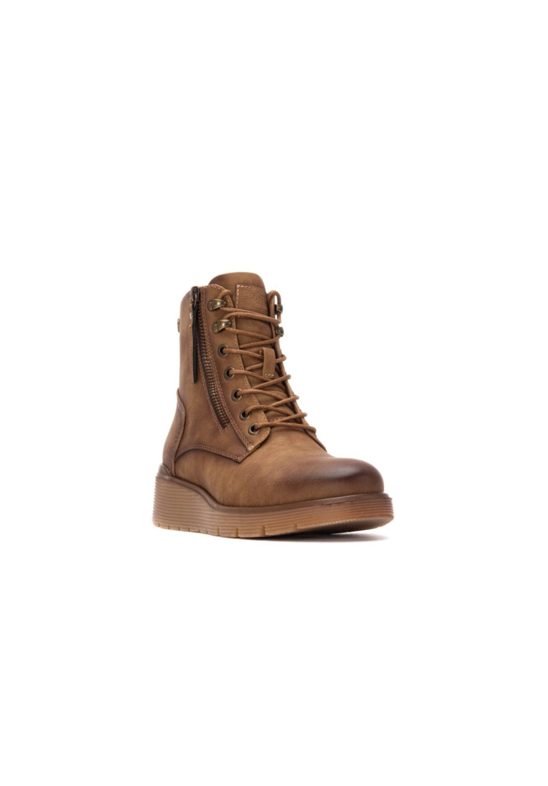 Botín estilo militar, fabricado en material que imita a la piel. Cierre mediante cremallera interior. Cordones regulables encerados. Cremallera lateral decorativa. Suela volumen en forma de cuña baja. Con plantilla extraíble. Este modelo ha obtenido el certificado vegano por la organización mundial PETA (Organización de los derechos de los animales).