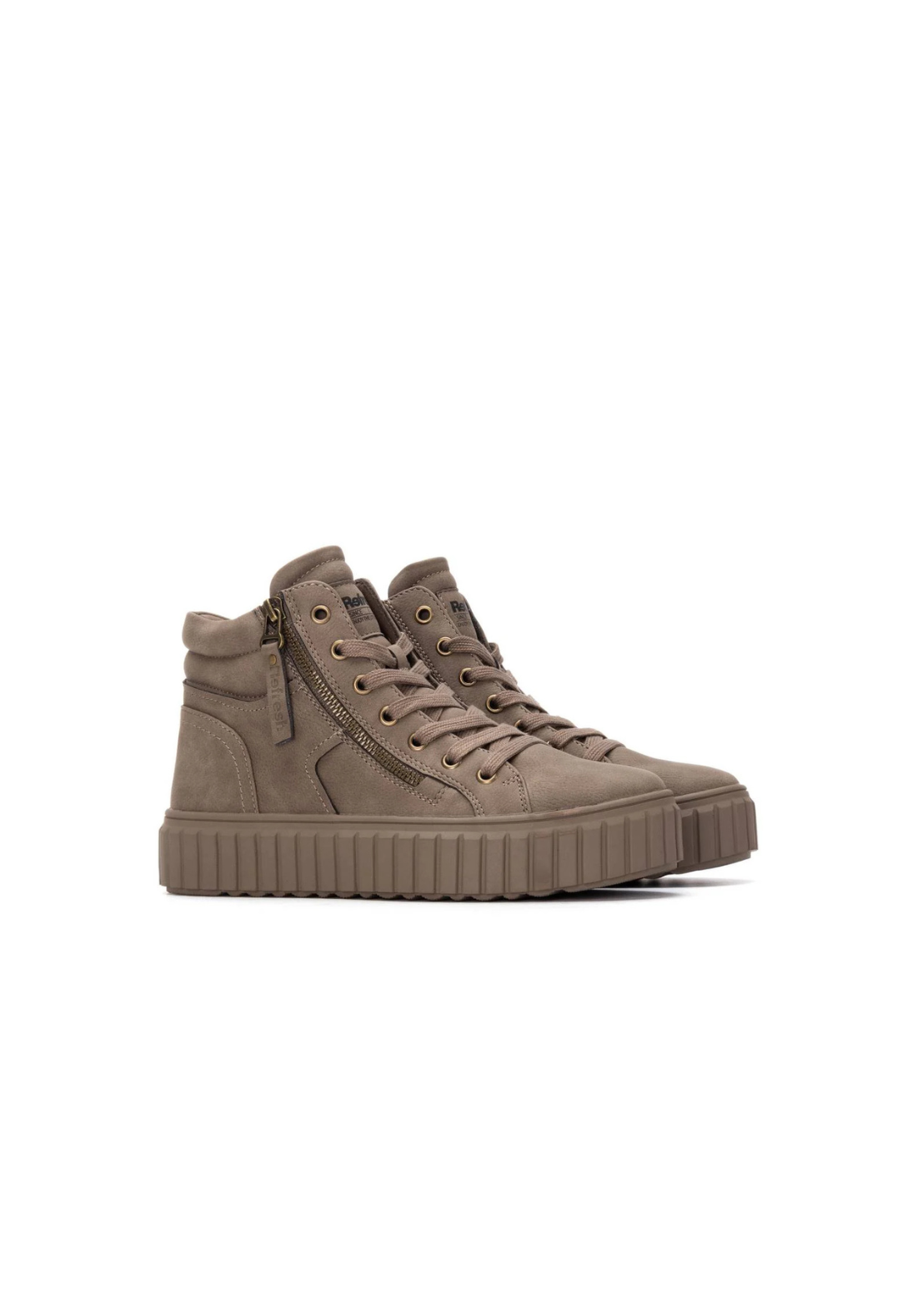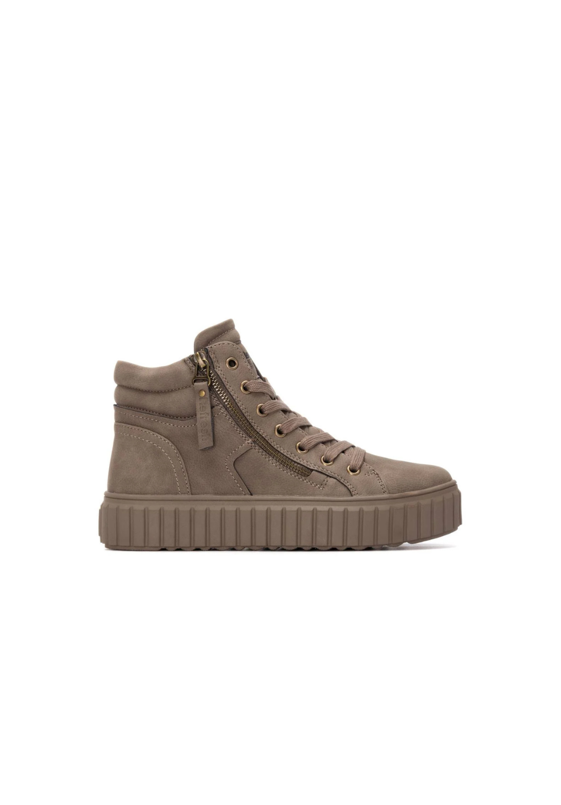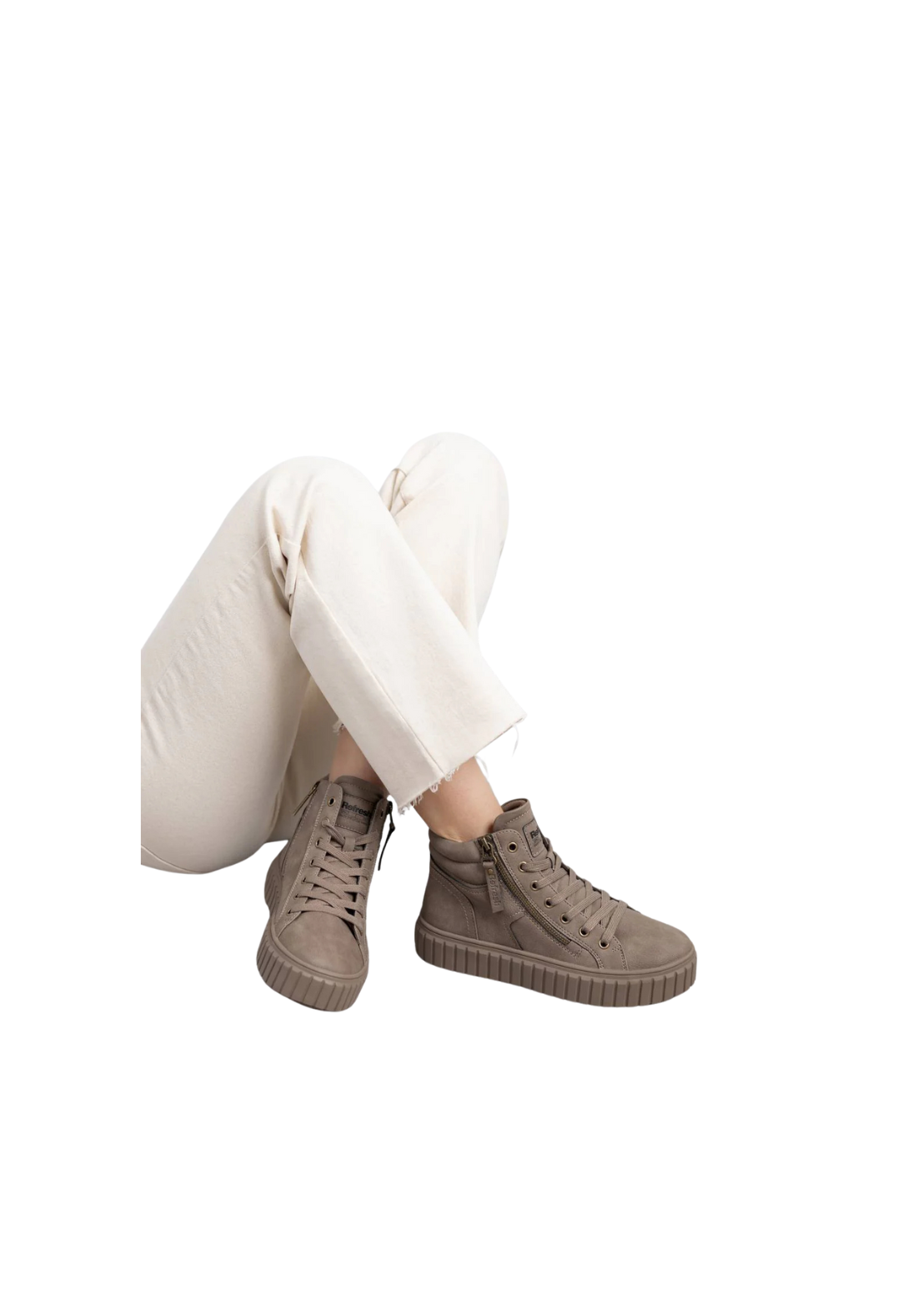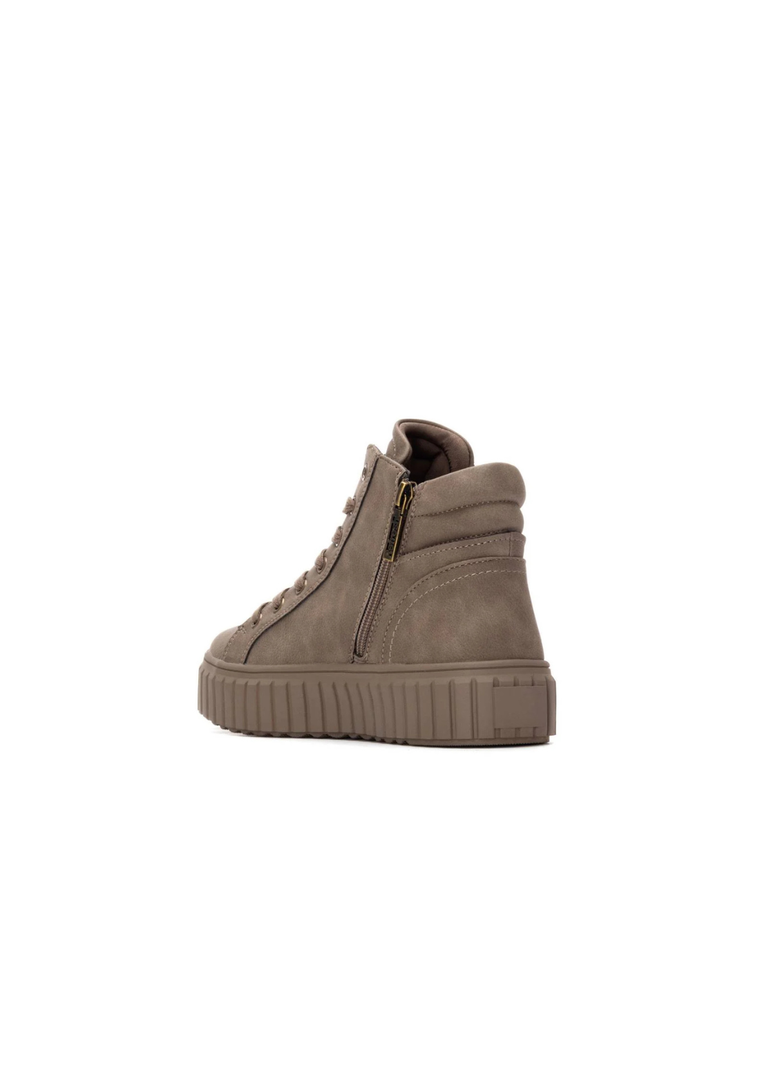 Zapatilla tipo botín fabricada en material que imita a la piel. Cierre mediante cremallera lateral con cordones regulables para un mejor ajuste. Gruesa suela de goma antideslizante. Con plantilla extraíble. Este modelo ha obtenido el certificado vegano por la organización mundial PETA (Organización de los derechos de los animales).