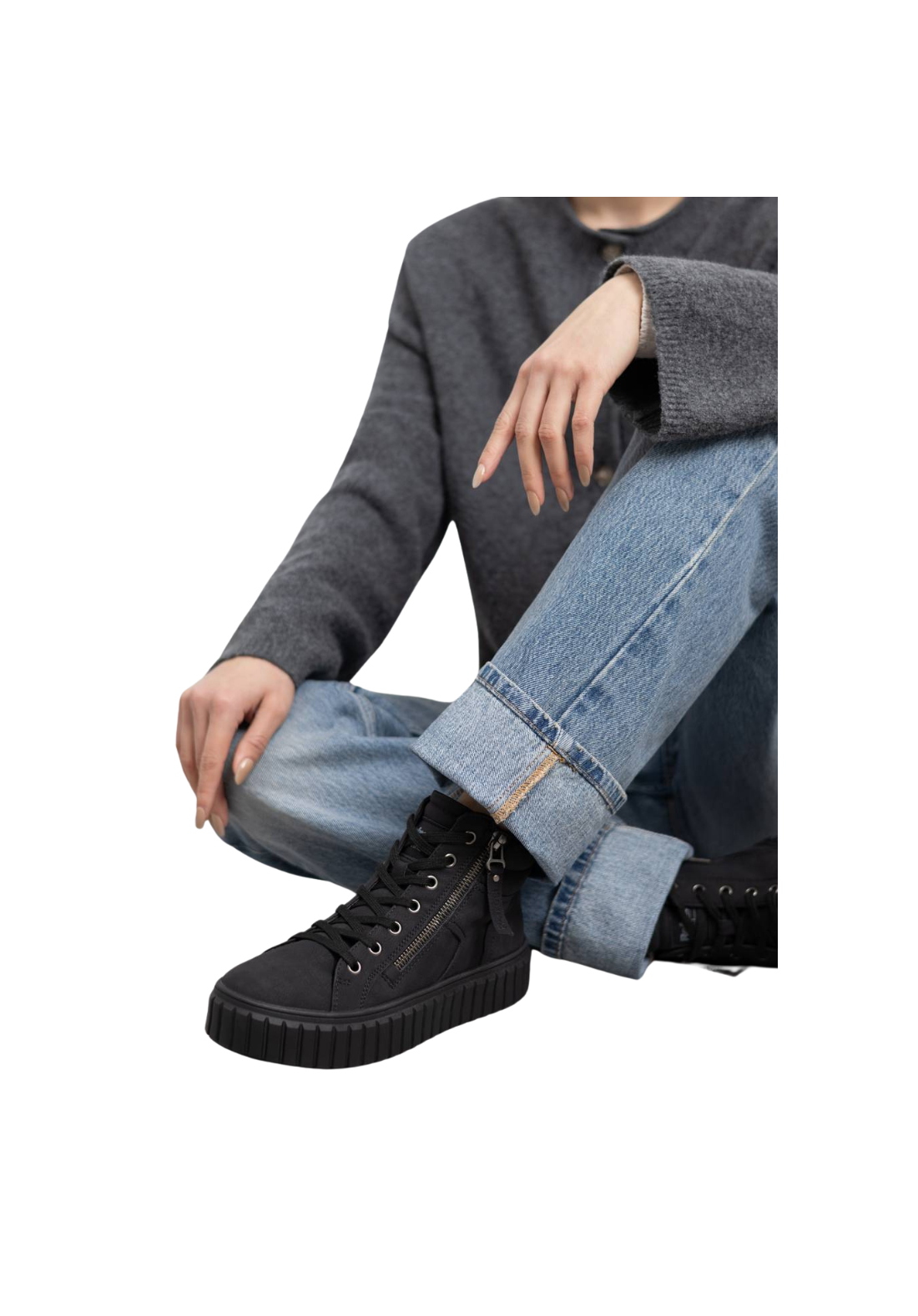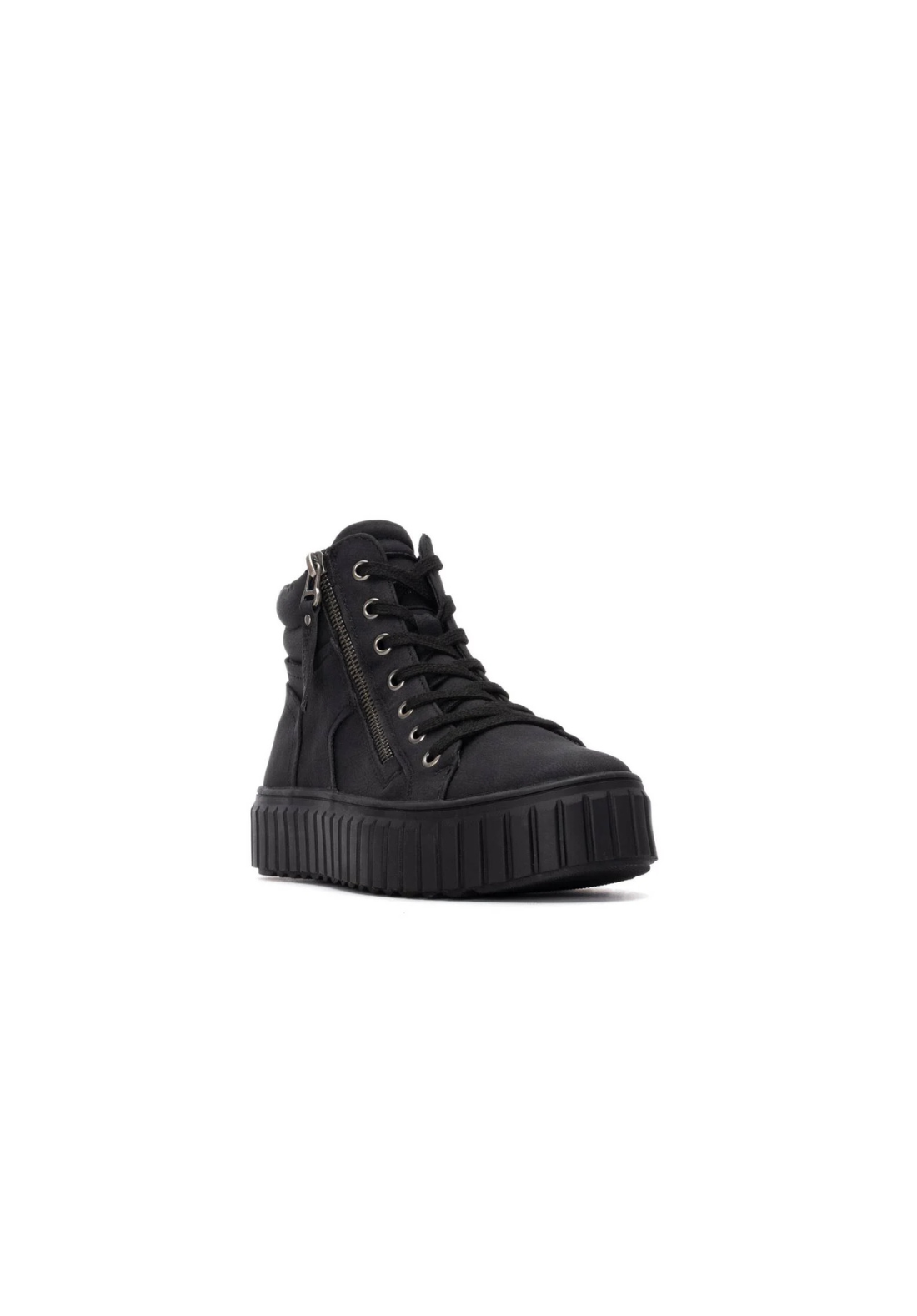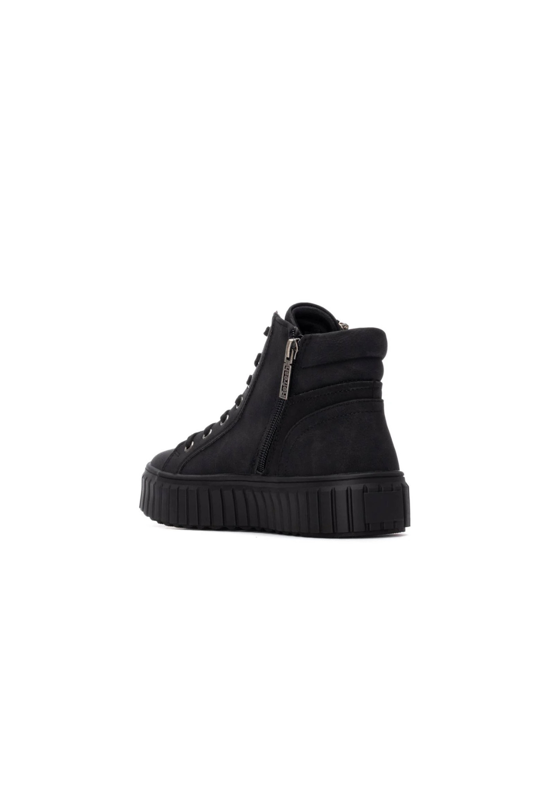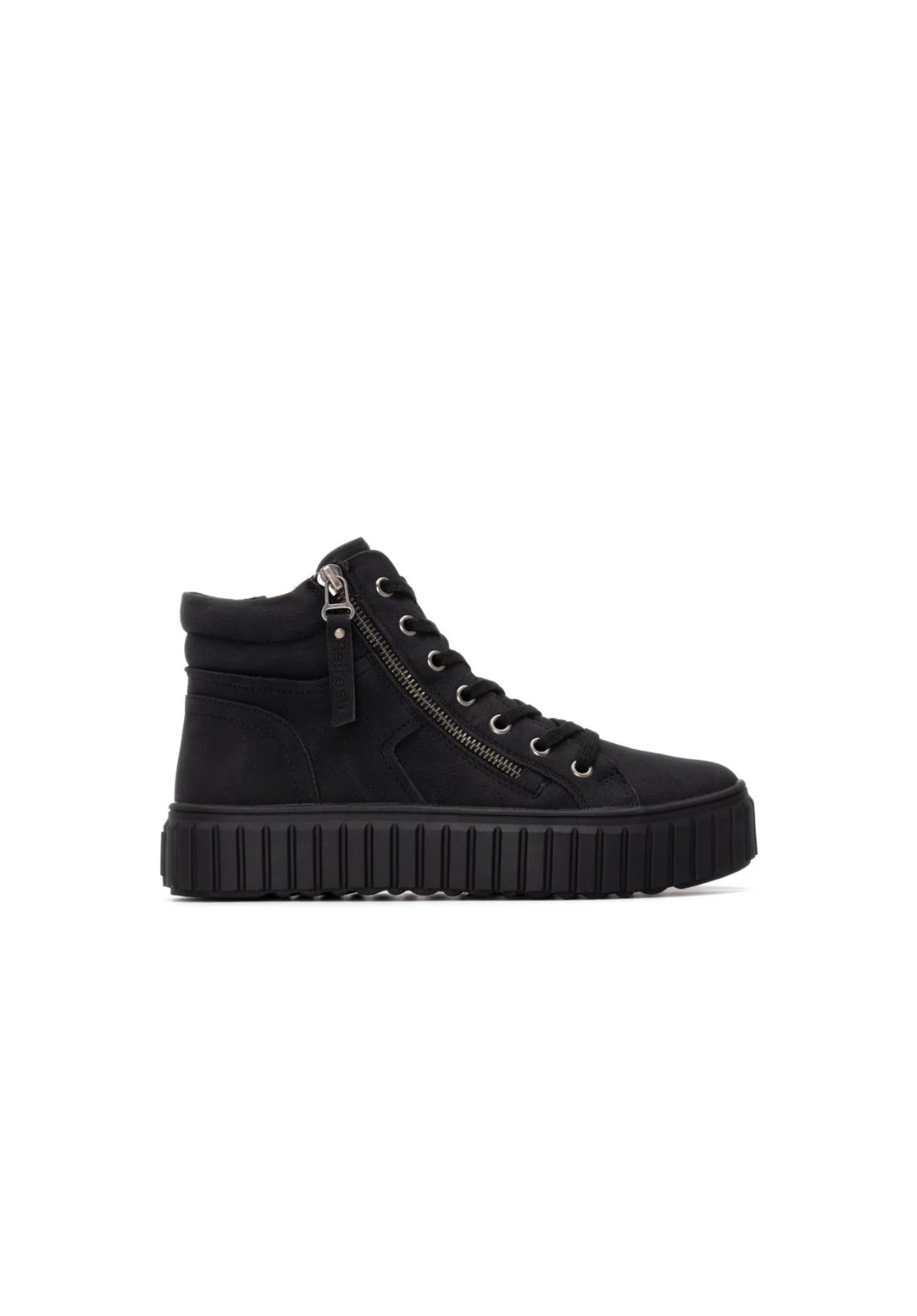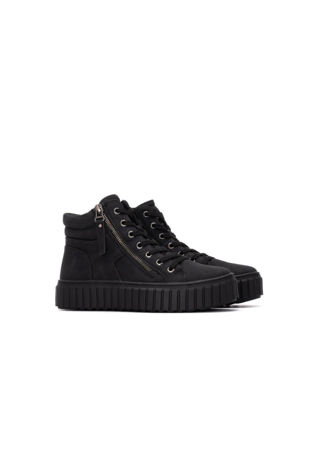 Zapatilla tipo botín fabricada en material que imita a la piel. Cierre mediante cremallera lateral con cordones regulables para un mejor ajuste. Gruesa suela de goma antideslizante. Con plantilla extraíble. Este modelo ha obtenido el certificado vegano por la organización mundial PETA (Organización de los derechos de los animales).