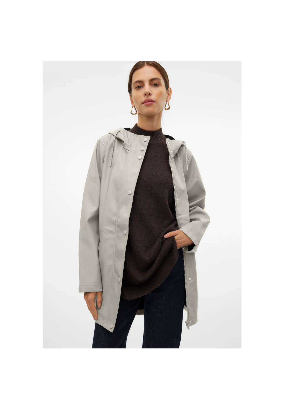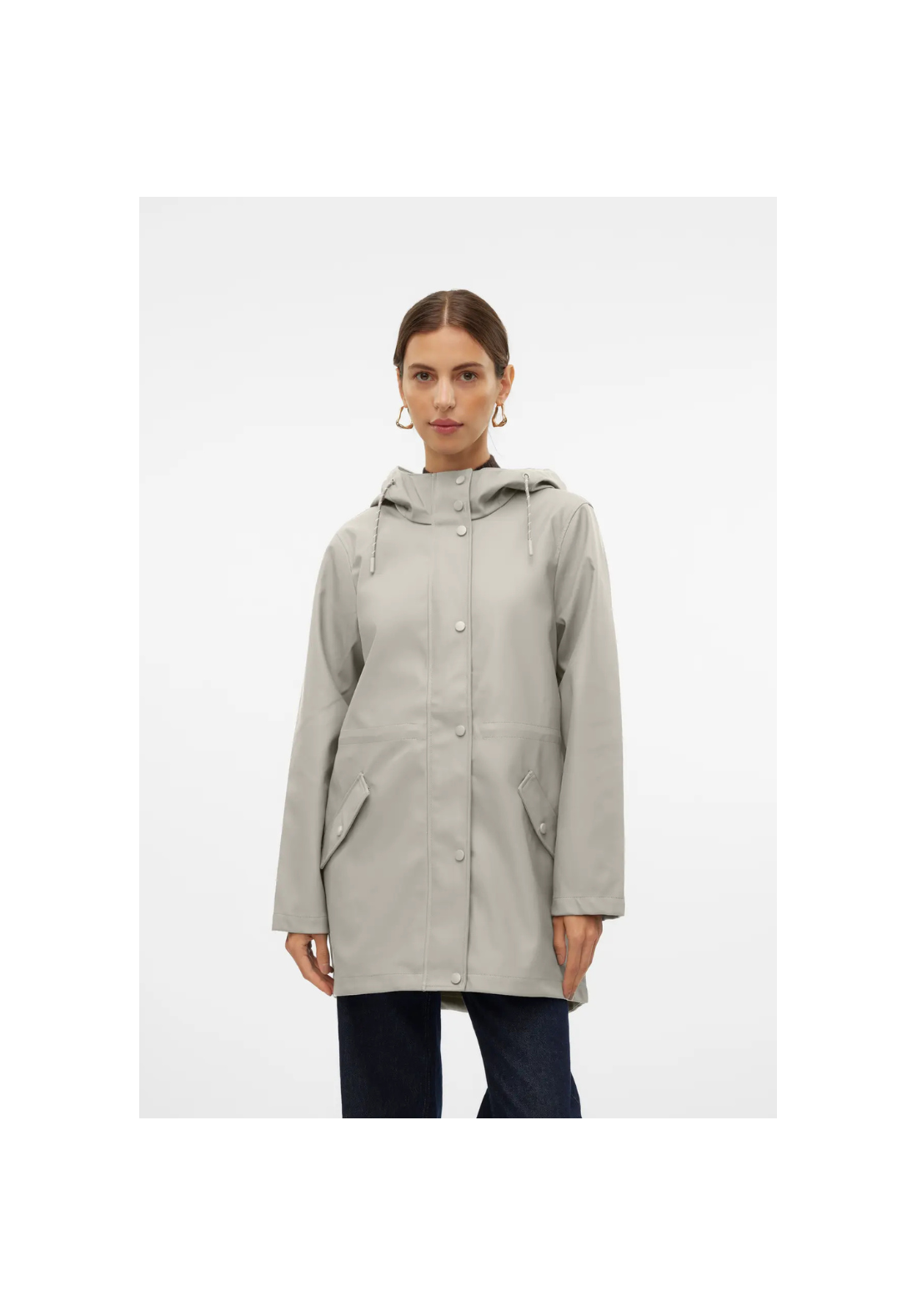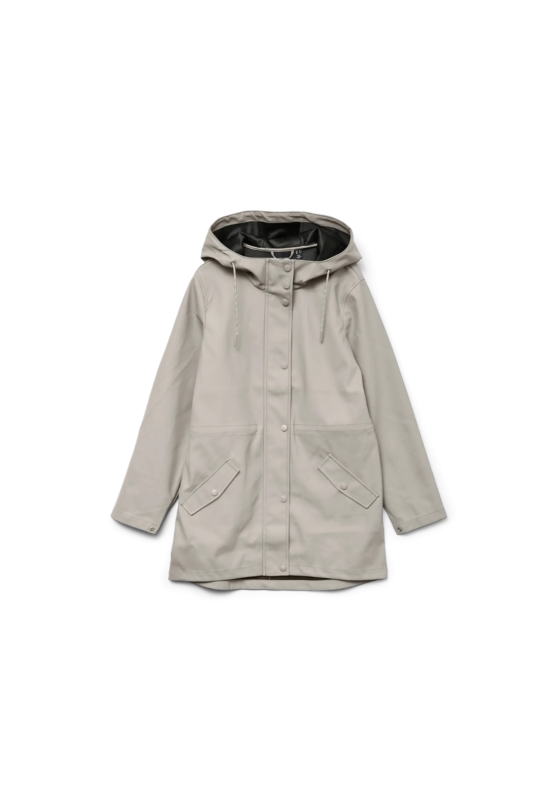 Chaqueta impermeable con capucha. Tiene bolsillos laterales con cierre de botón a presión y un cordón en la cintura para ajustarla.