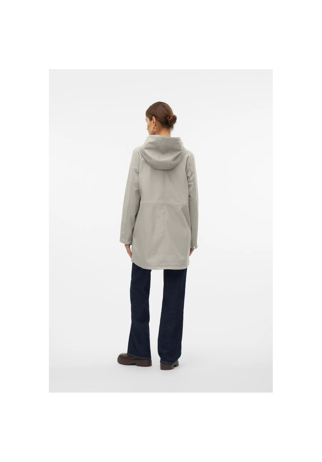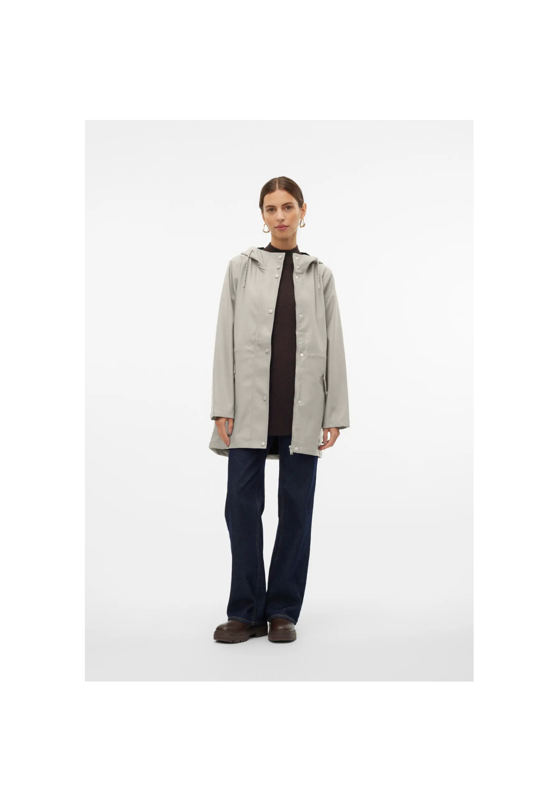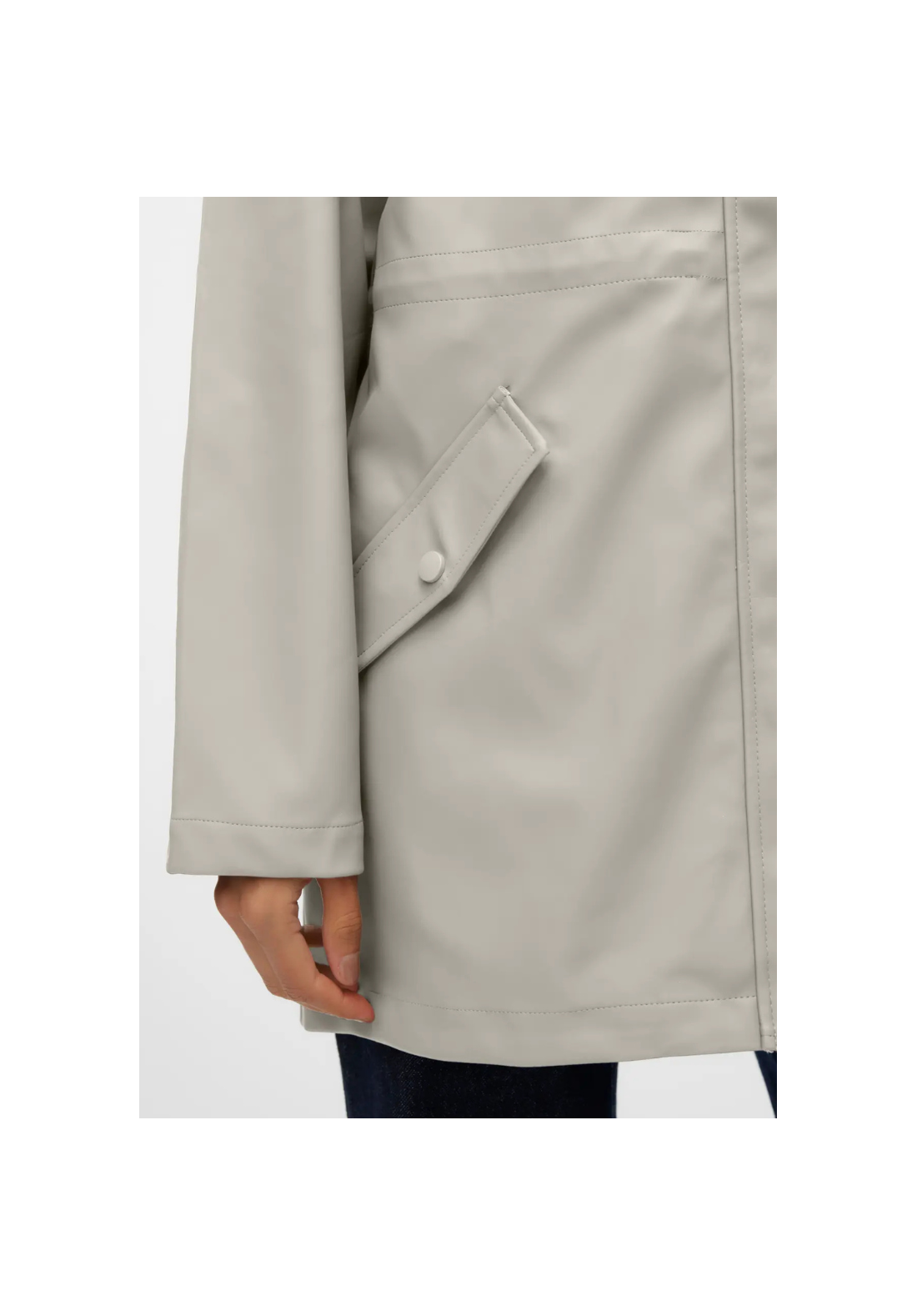 Chaqueta impermeable con capucha. Tiene bolsillos laterales con cierre de botón a presión y un cordón en la cintura para ajustarla.