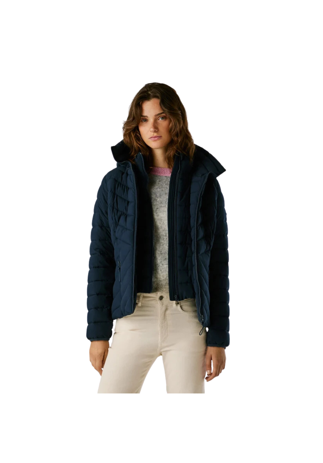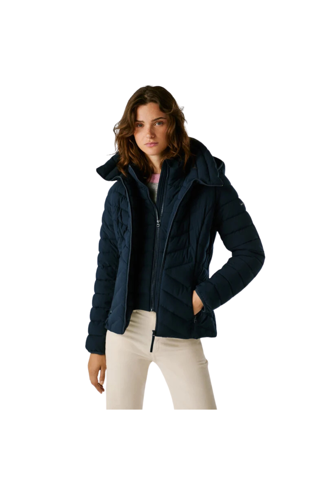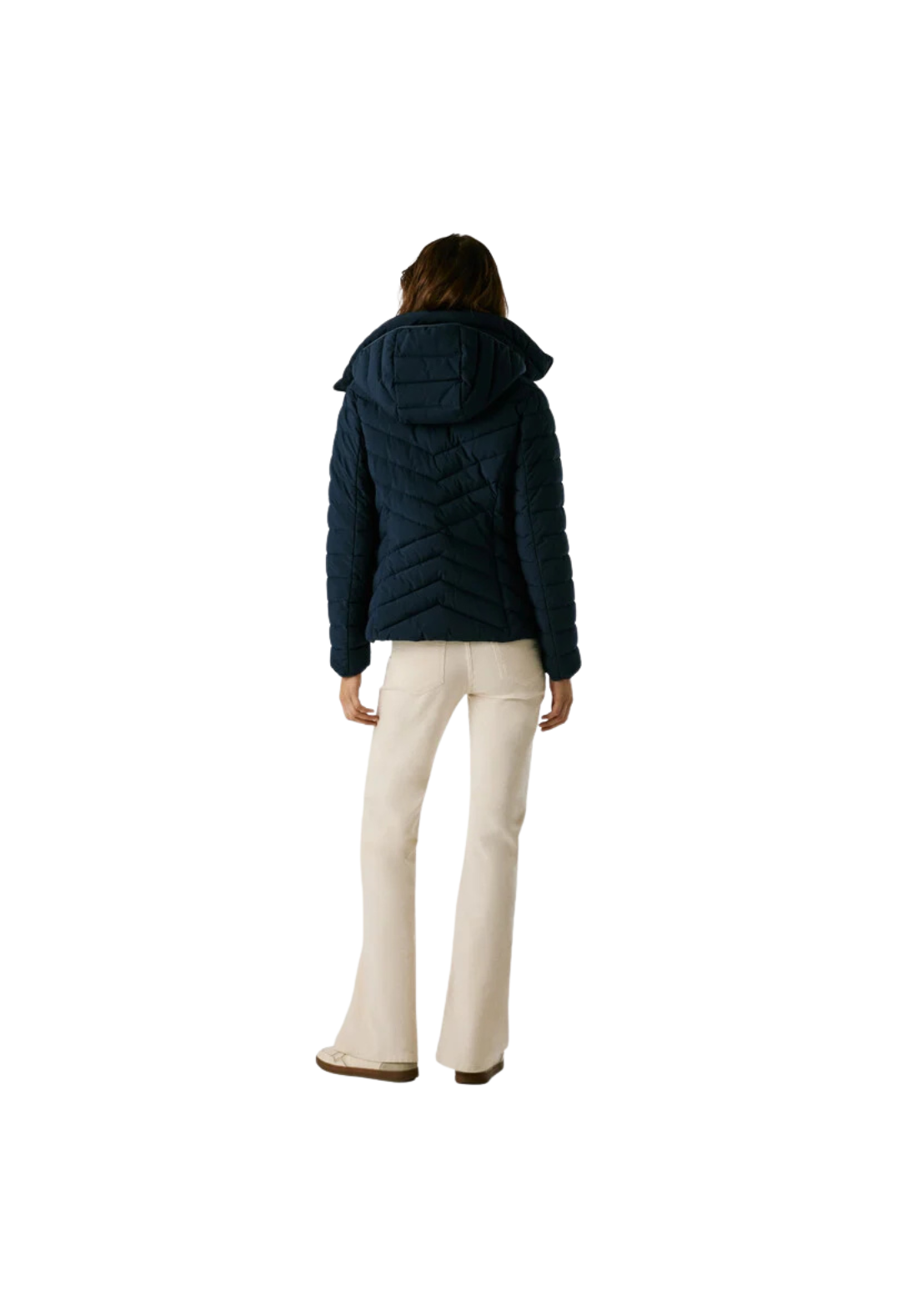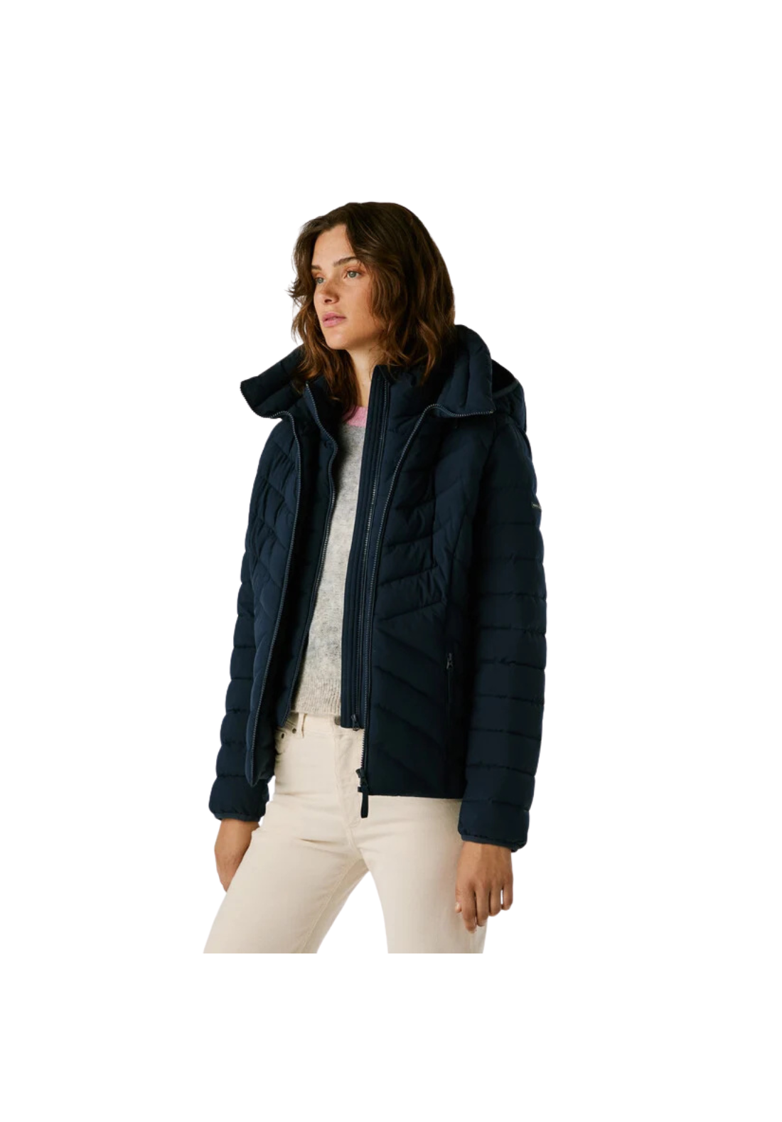 Plumífero corto, en tejido ligero e impermeable con paneles acolchados en forma de espiga. Tiene el cuello alto y capucha, cierre frontal de cremallera, una capa interior no desmontable con cierre de cremallera y bolsillos laterales también con cierre de cremallera.