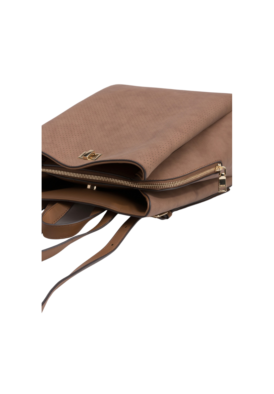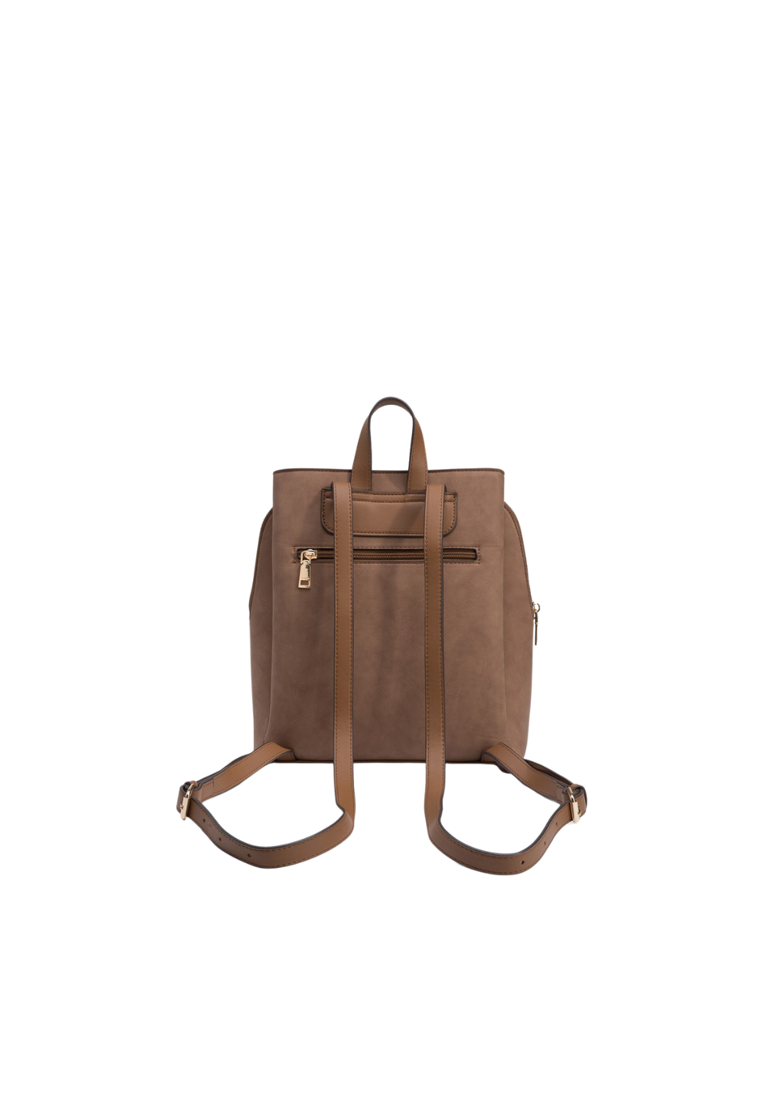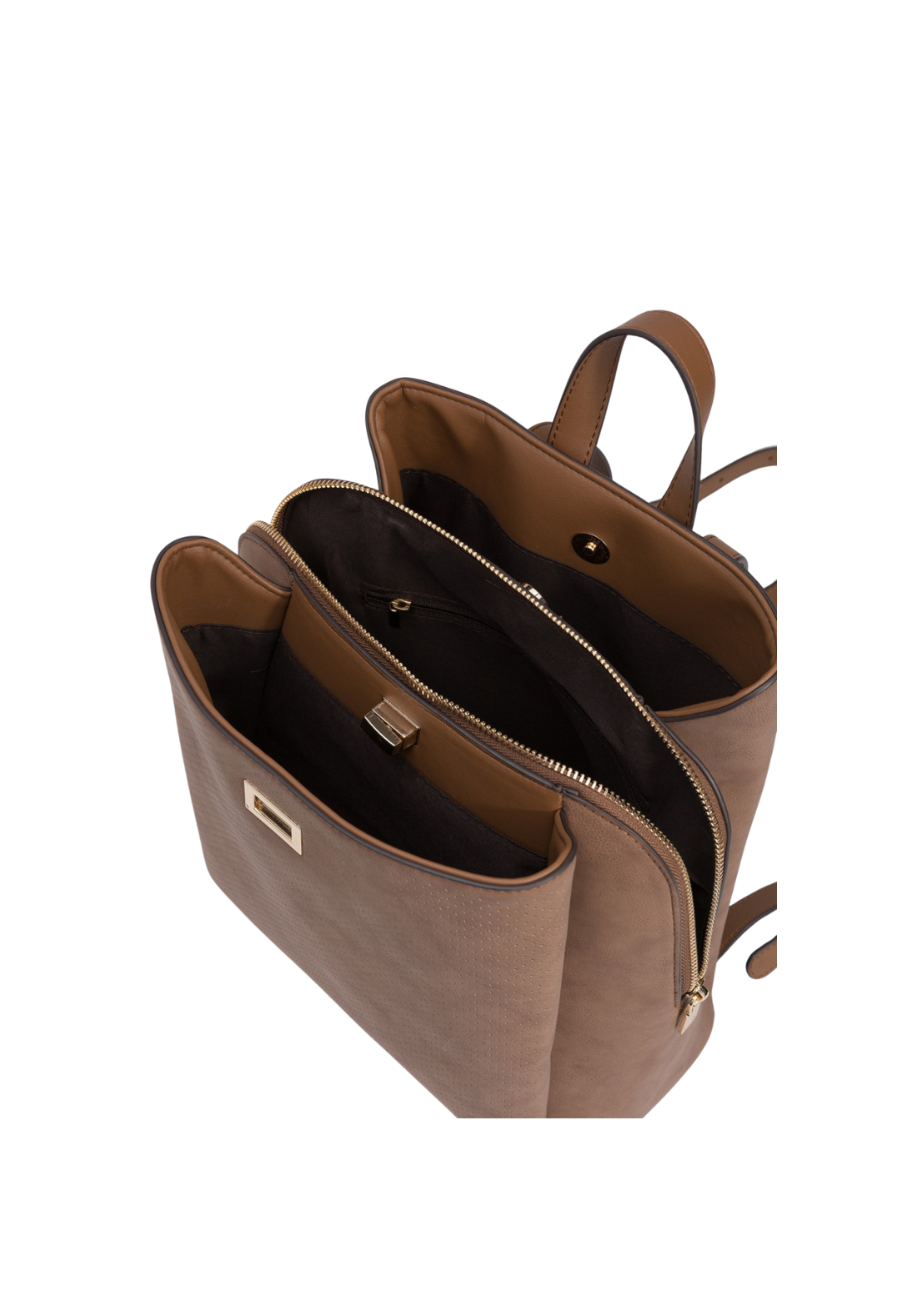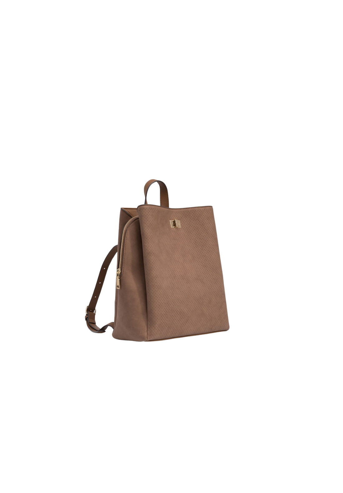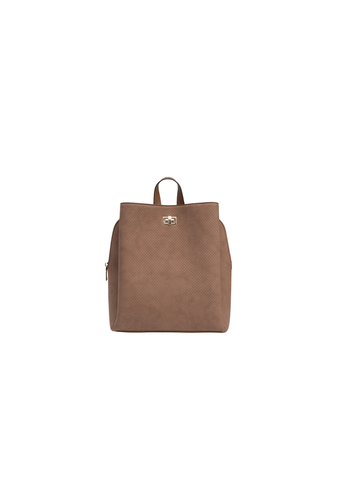 Mochila efecto ante perforado, con bolsillo externo y tres compartimentos. Asa de mano fija y asas de hombros ajustables. Bolsillo interno con cierre de cremallera. Tamaño grande.