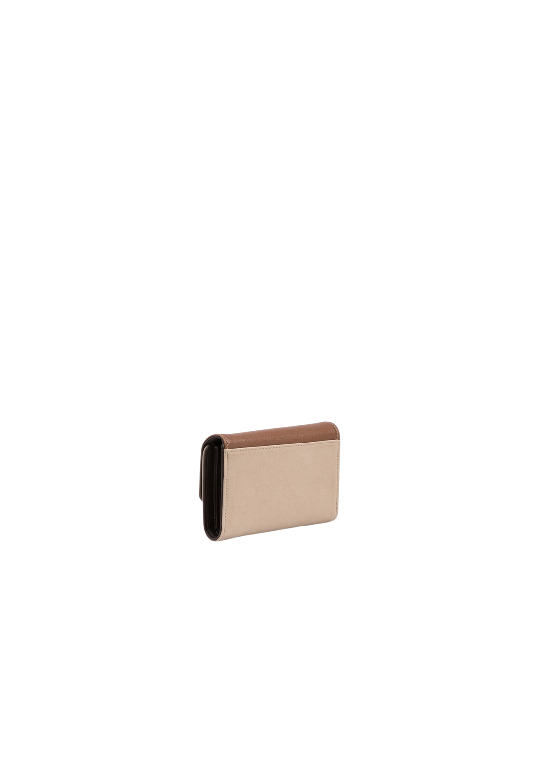 Monedero bicolor en efecto ante, con solapa en efecto piel y botón de presión. Compartimentos y bolsillos interiores para billetes, tarjetas y monedas. Tamaño mediano.