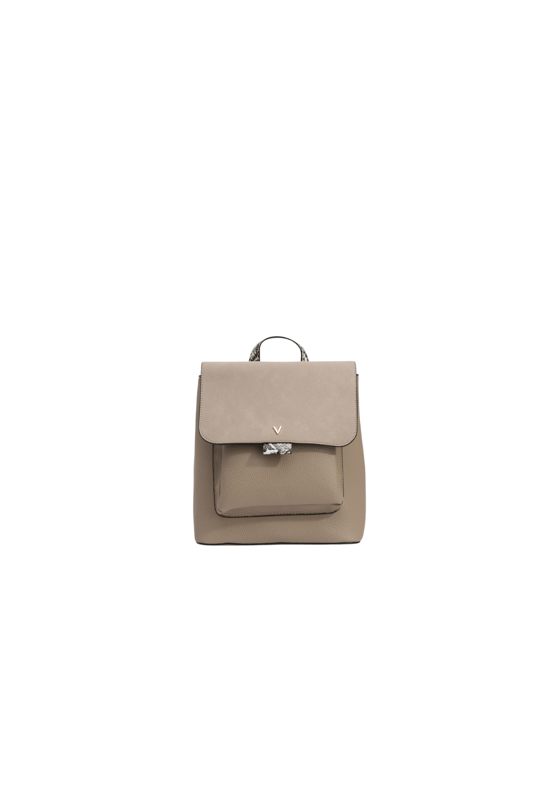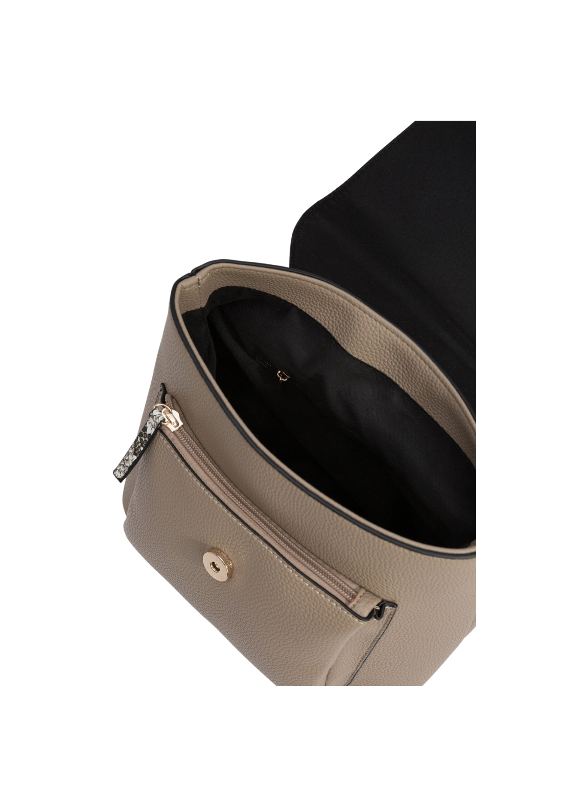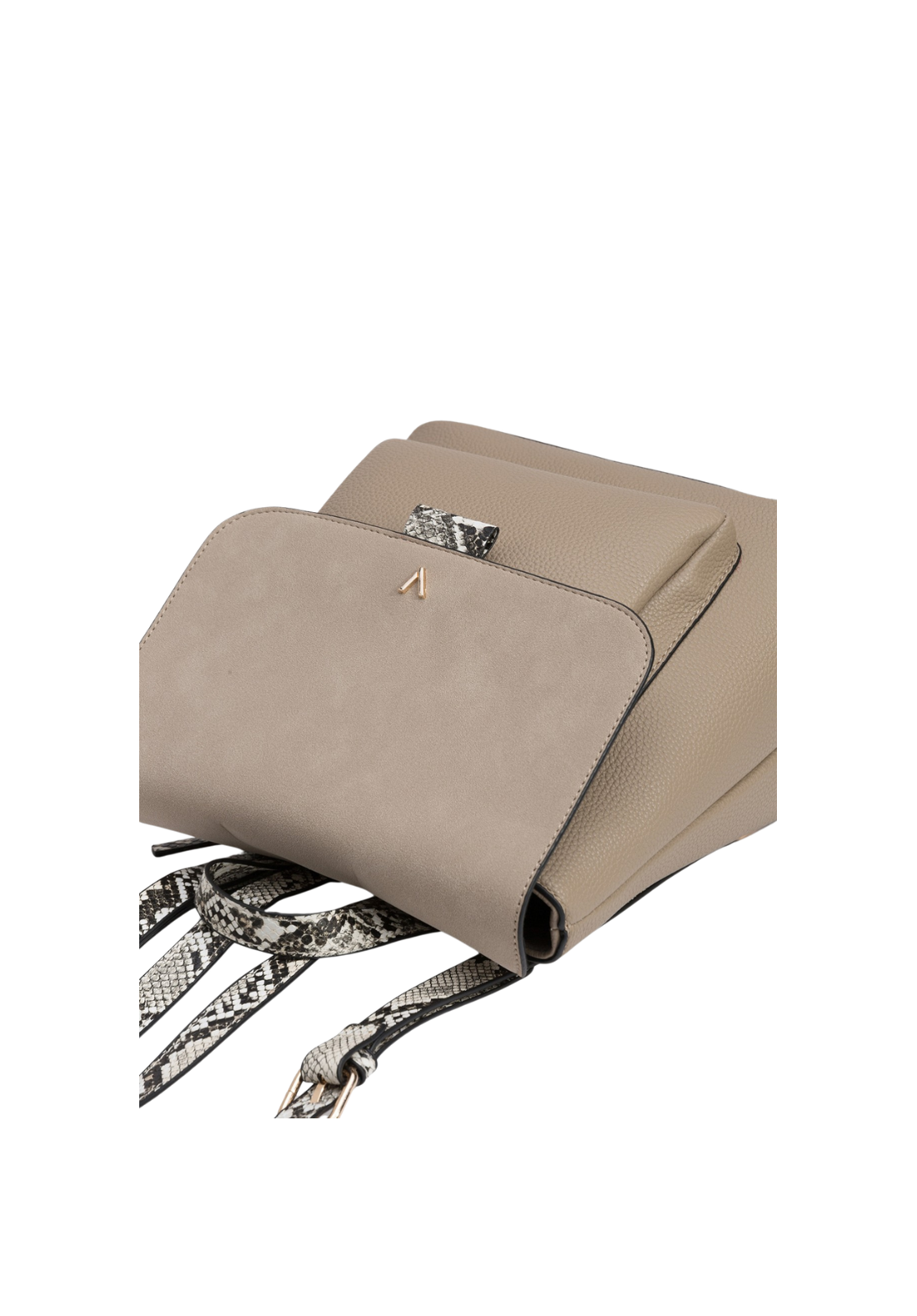 Mochila tipo bucket en efecto piel con bolsillo delantero, solapa en efecto ante y cierre magnético. Asa de mano fija y asas de hombro ajustables en efecto serpiente. Bolsillo trasero y bolsillo interior con cremallera. Tamaño mediano.