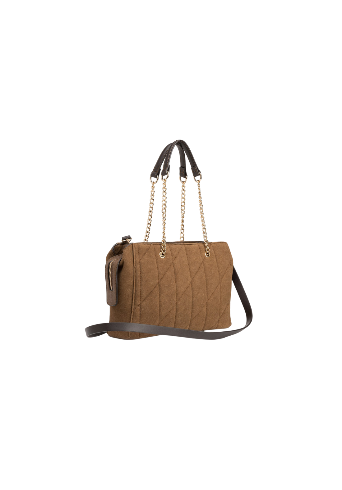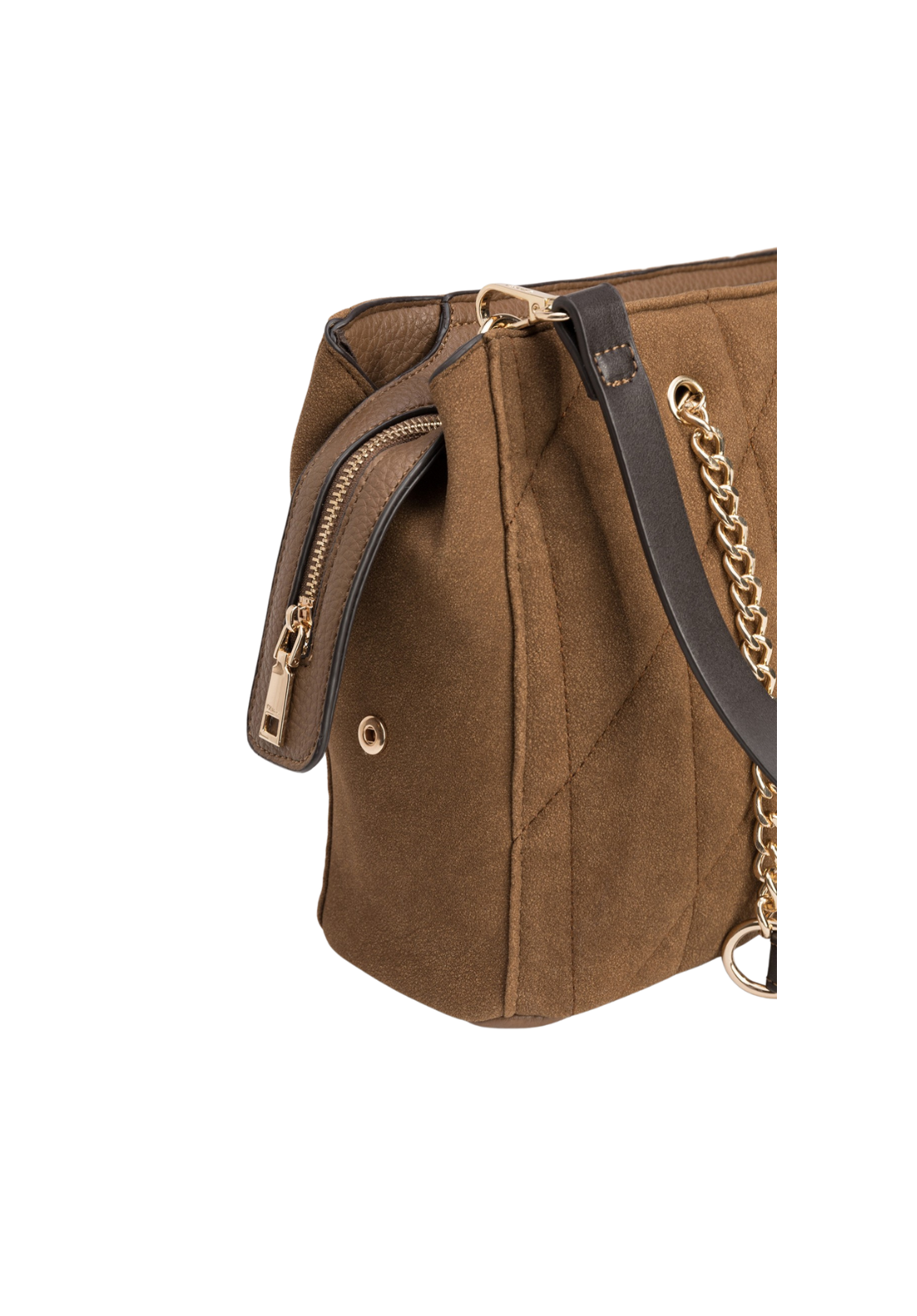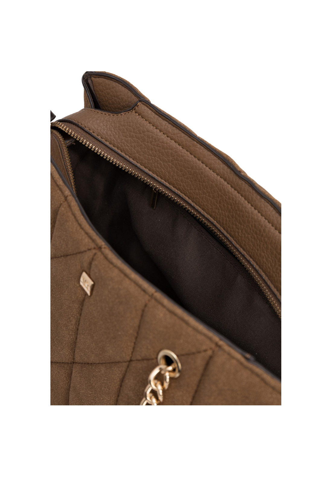 Bolso city efecto ante acolchado con cierre de cremallera superior y asas de hombro combinadas con cadena. Correa bandolera ajustable y extraíble. Bolsillo interior con cierre de cremallera.