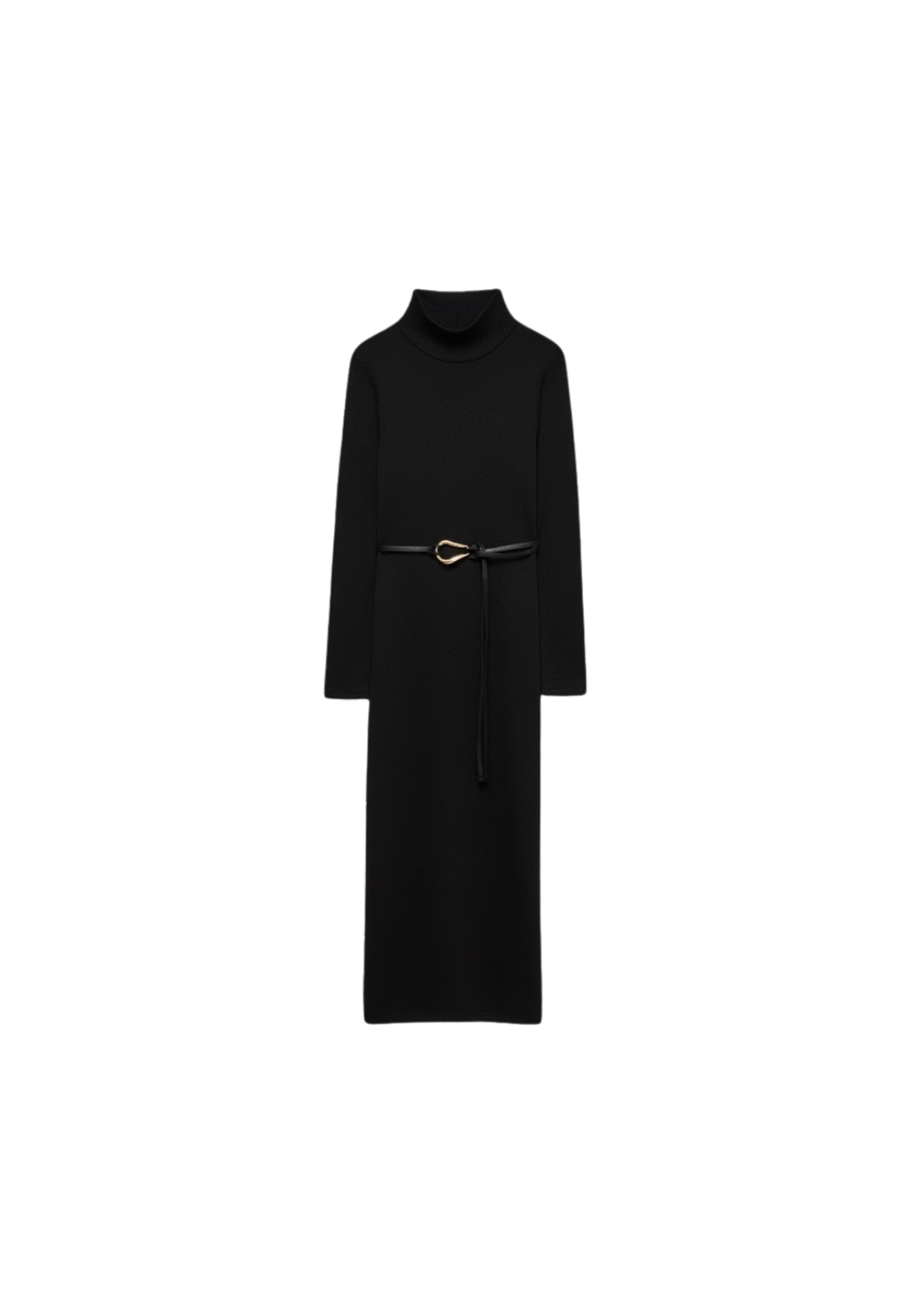 Vestido de manga larga, con cuello alto y lazada en la cintura. Detalle de broche en el cinturón.