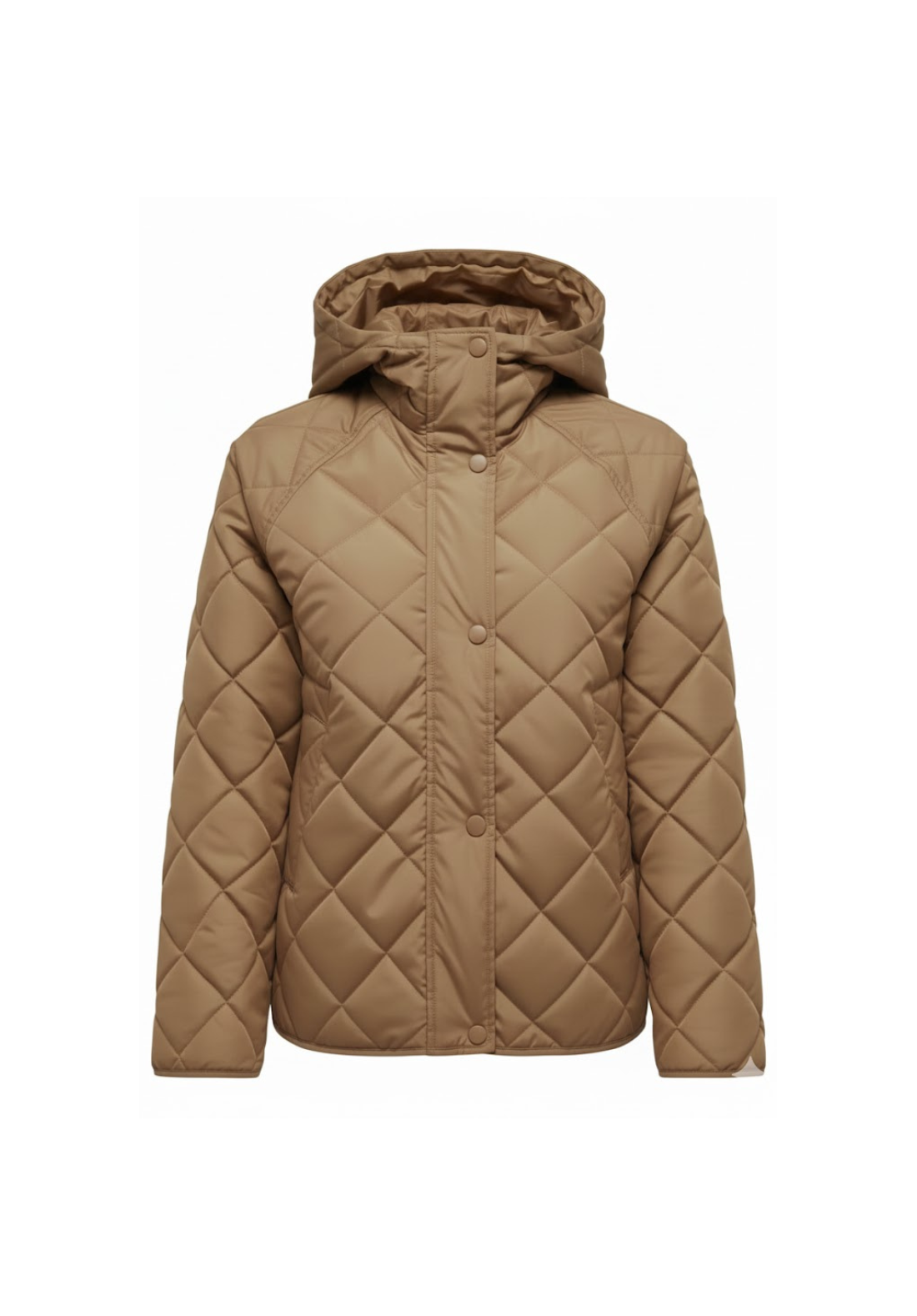 Chaqueta con cuello tipo beisbol, con cierre de botones, dos bolsillos laterales y capucha.