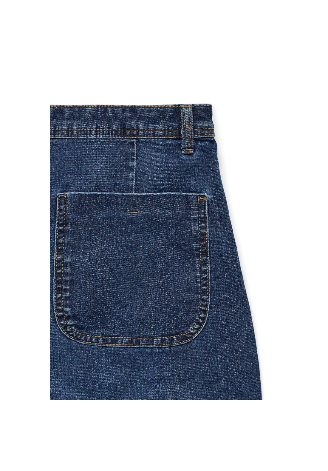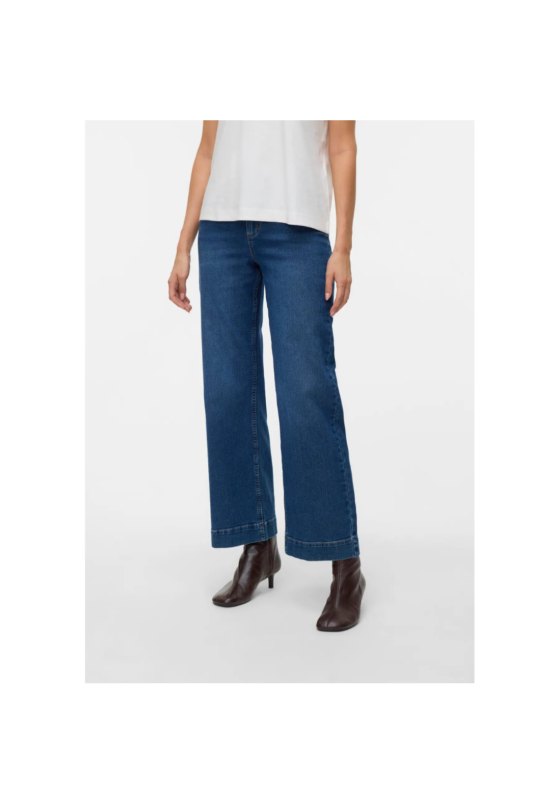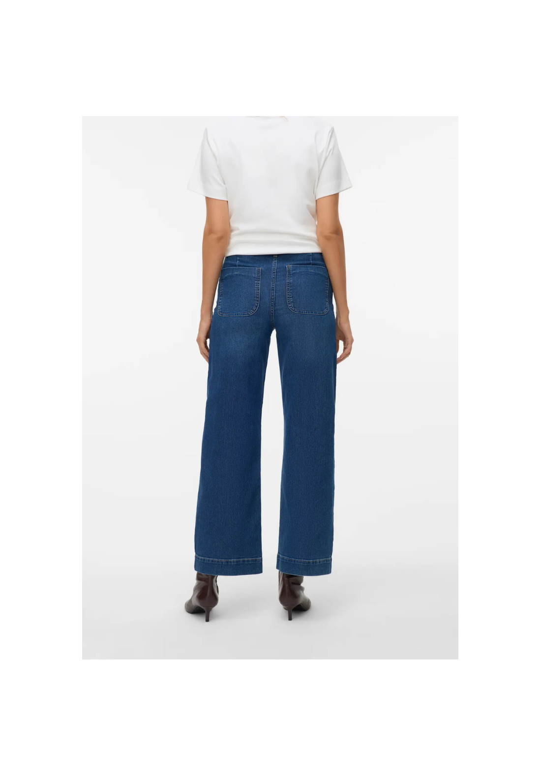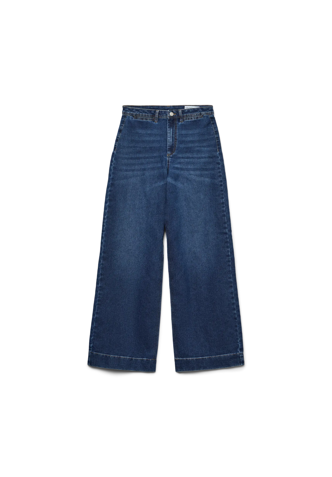 Vaqueros de cintura alta, de corte ancho, con cierre de botón y cremallera. Tiene bolsillos traseros y delanteros.