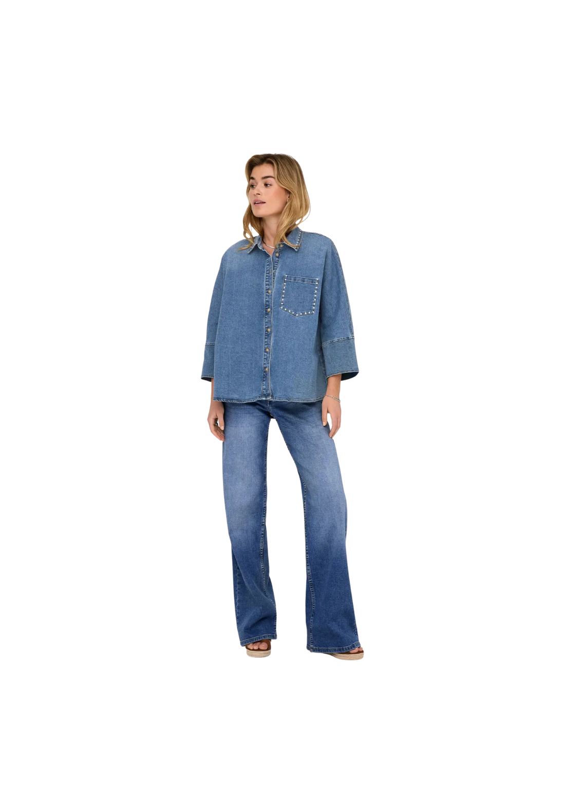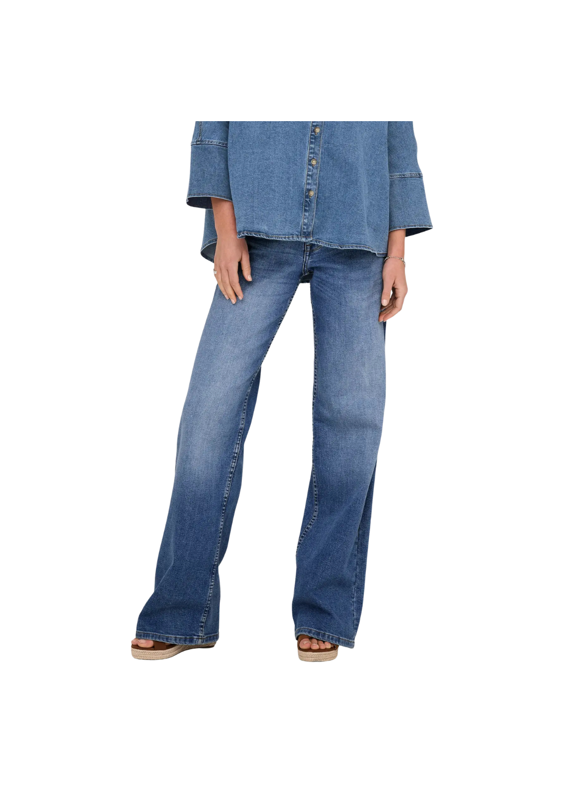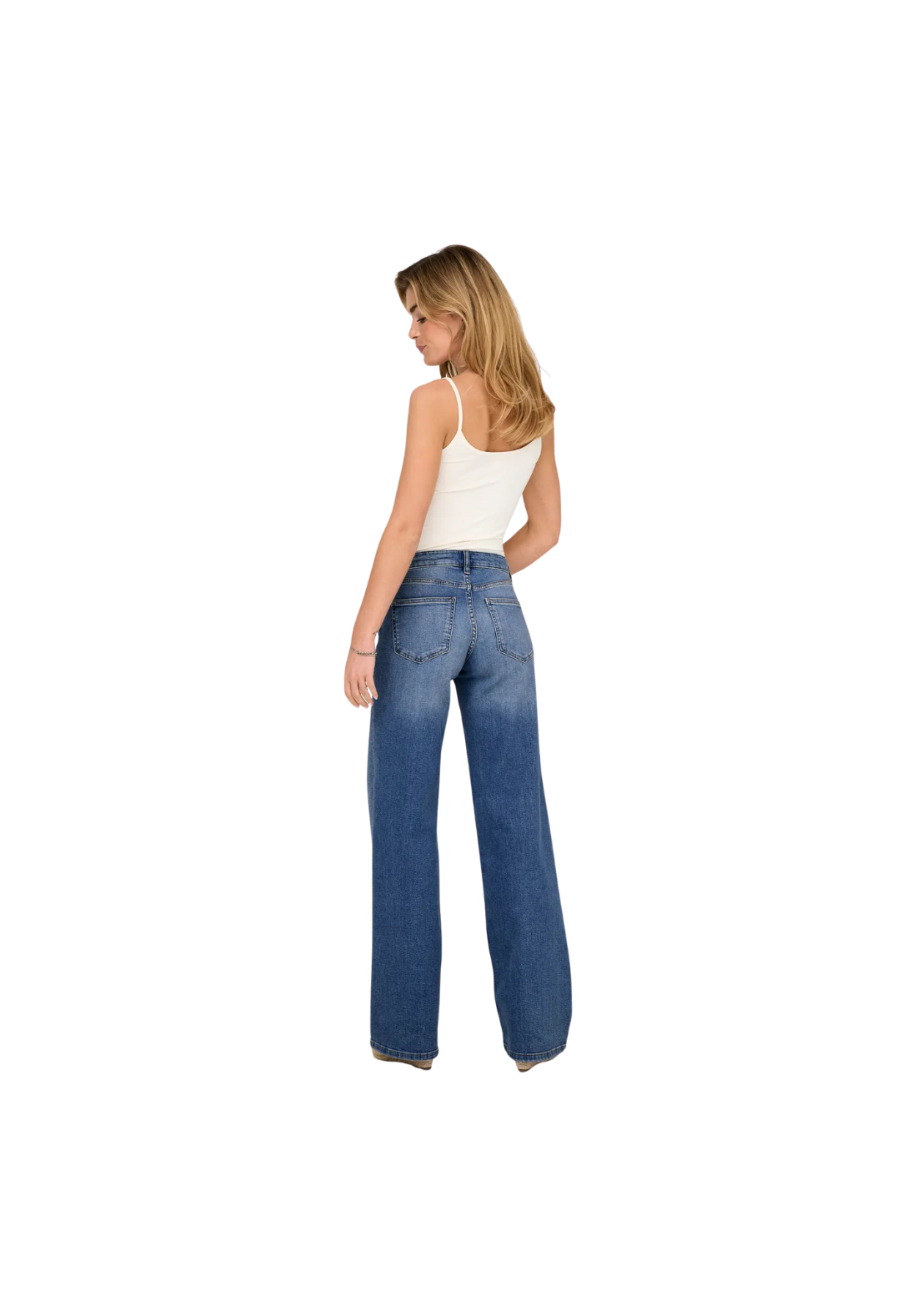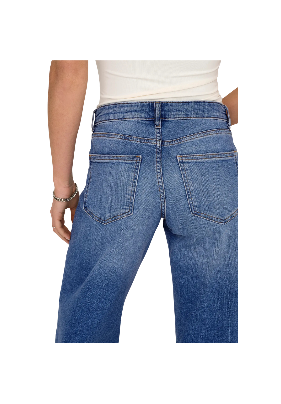 Vaqueros de cintura baja y de corte ancho, con cierre de cremallera y botón. Bolsillos traseros, monedero y delanteros.