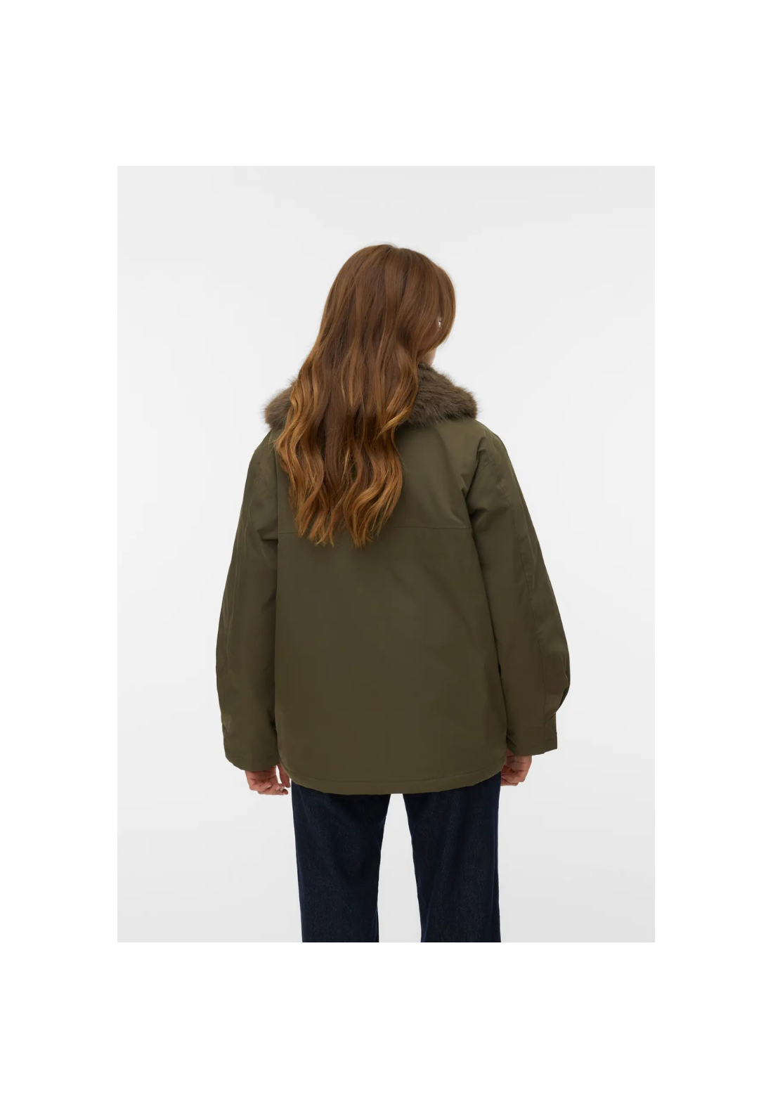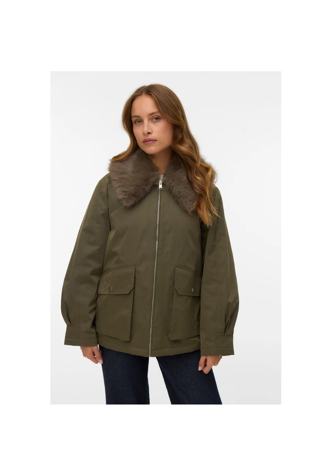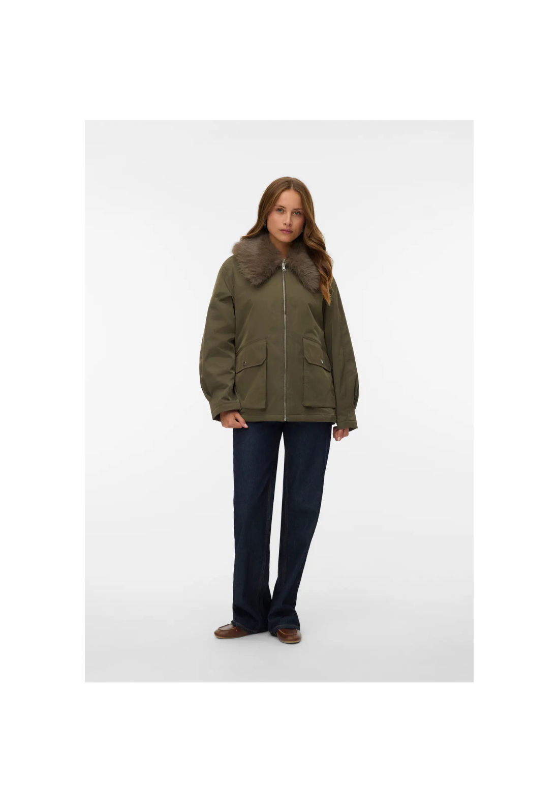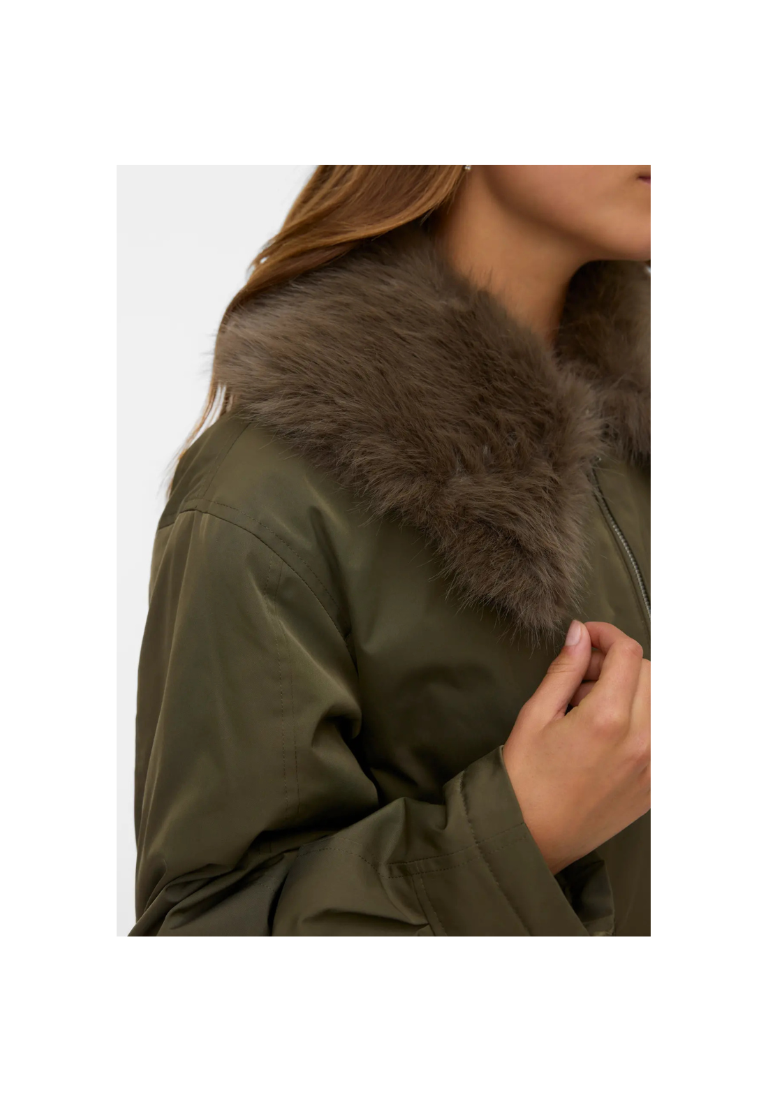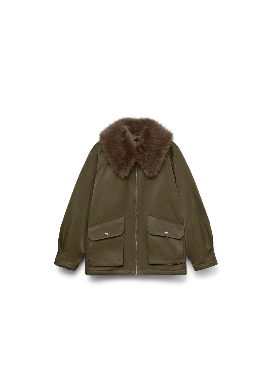 Chaqueta con cuello con pelo desmontable. Tiene dos bolsillos laterales con solapa y cierre frontal con cremallera.