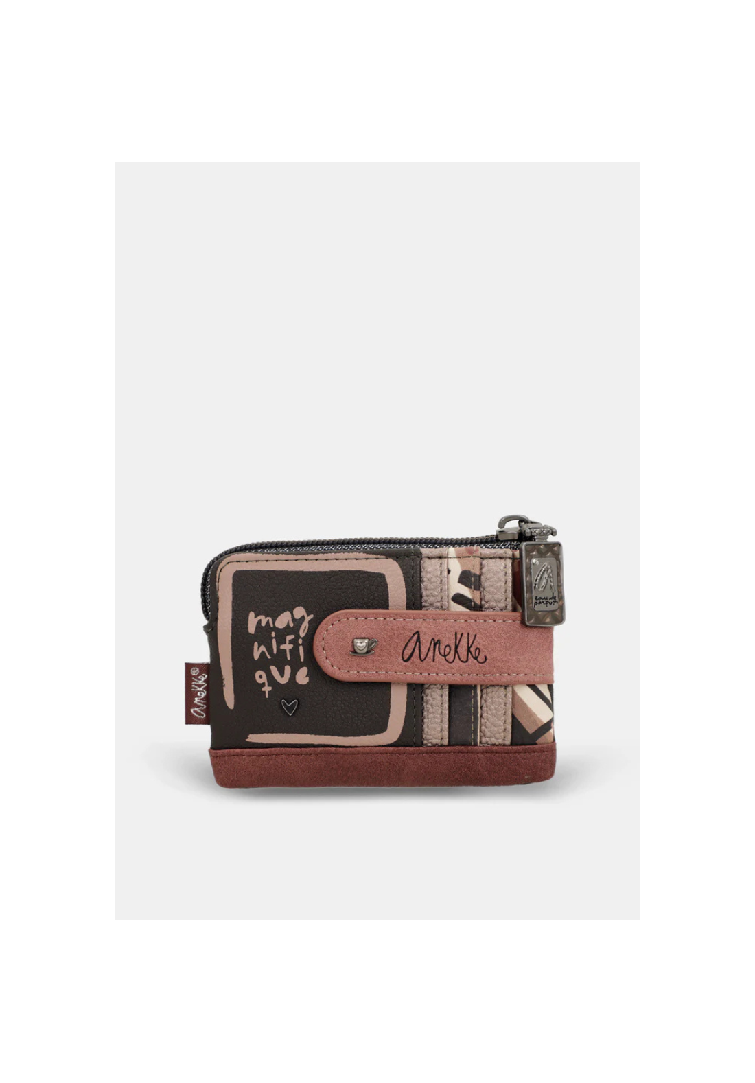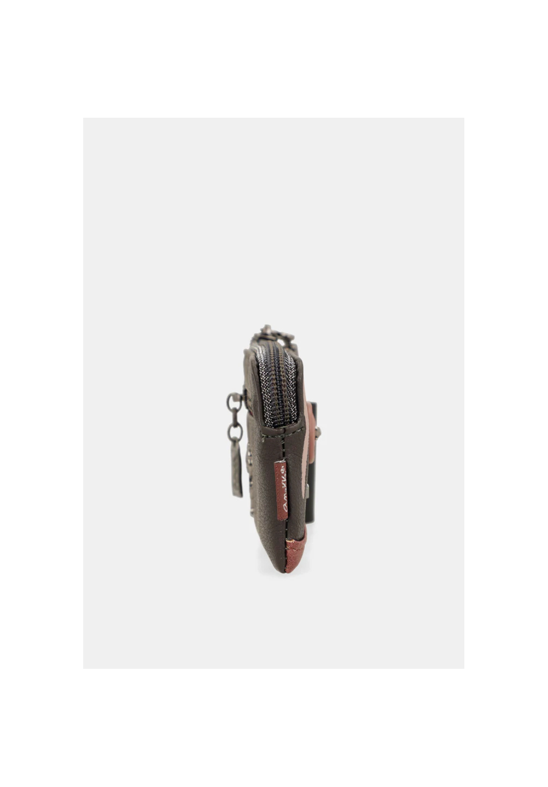 Monedero tarjetero con cierre de cremallera y solapa. Tiene un bolsillo trasero y multitarjetas delante.