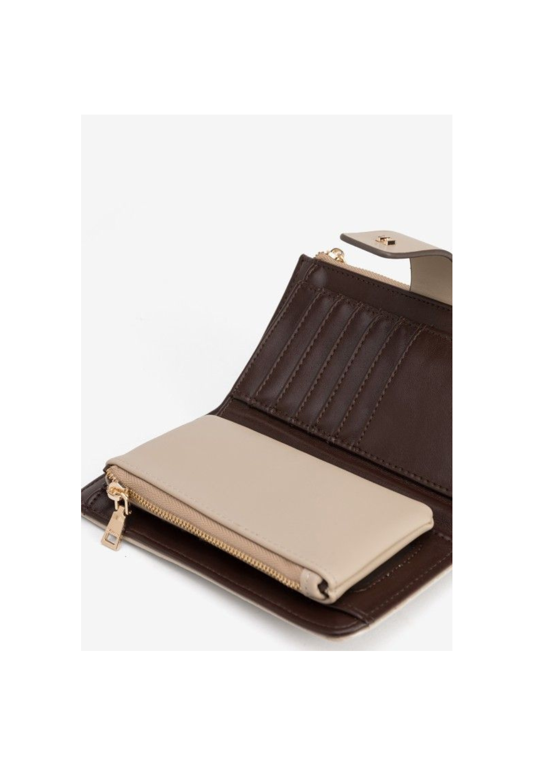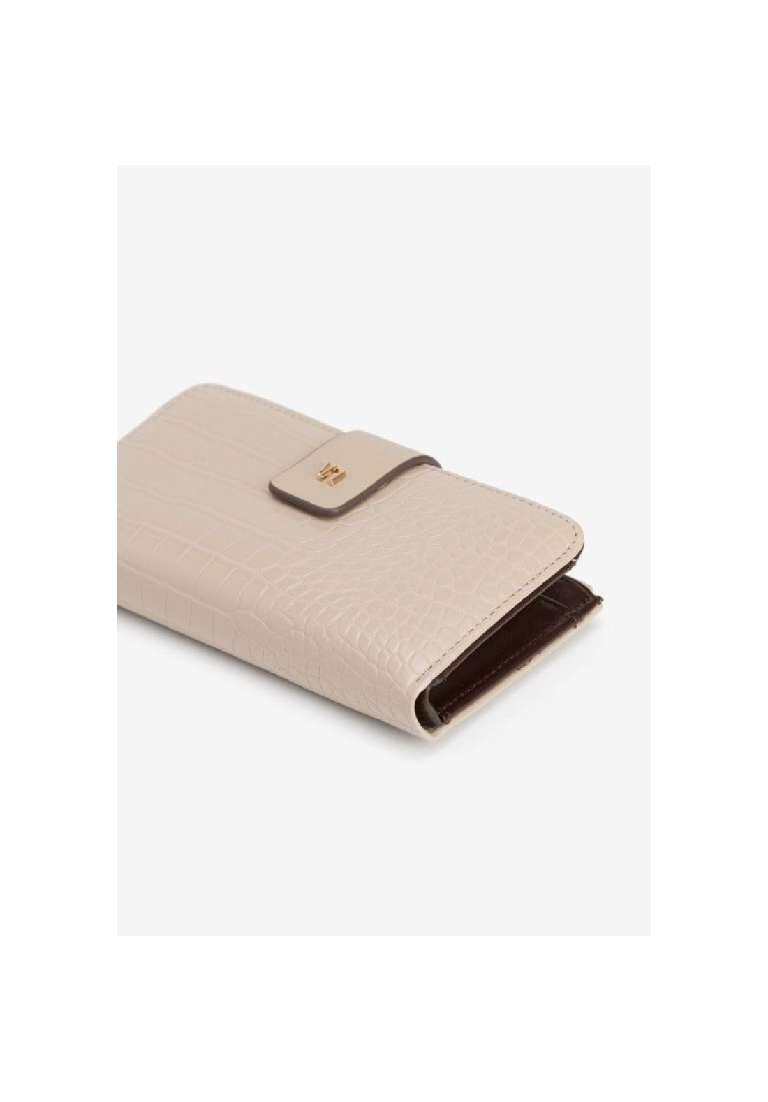 Porta monedas con textura imitación cocodrilo y cierre de botón metálico dorado.