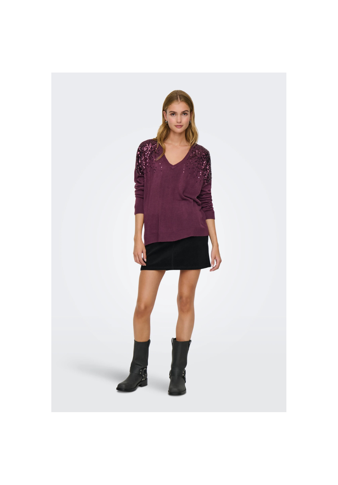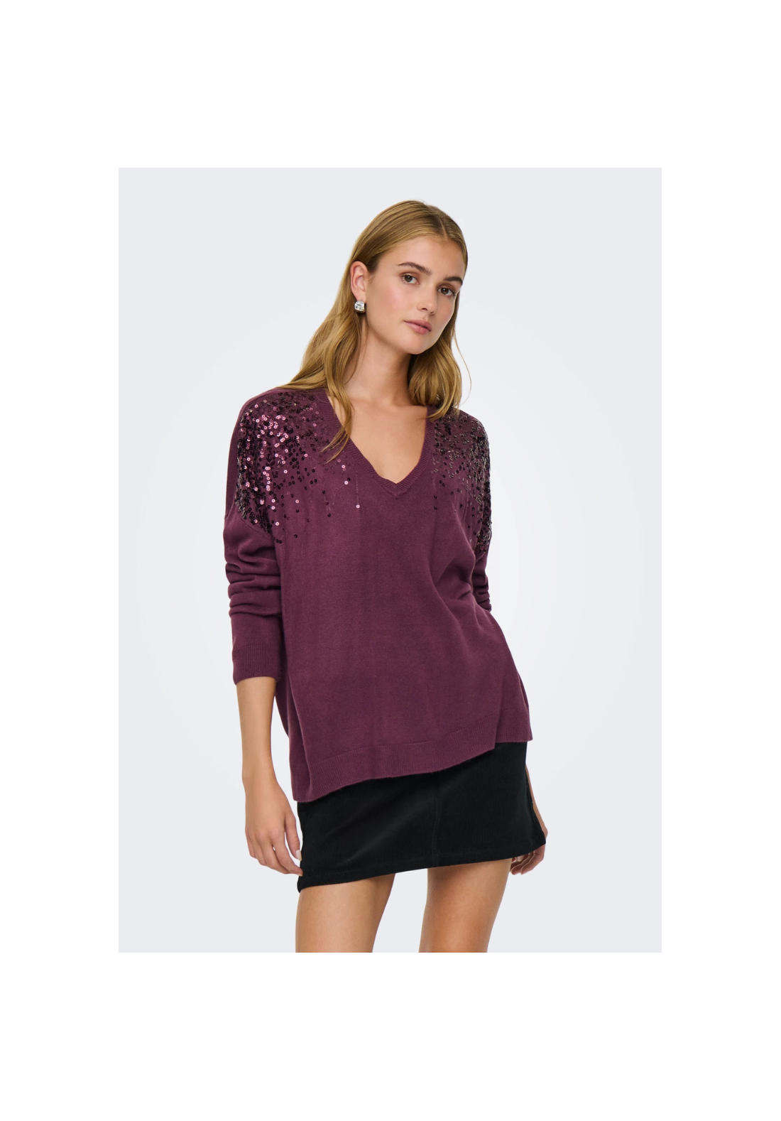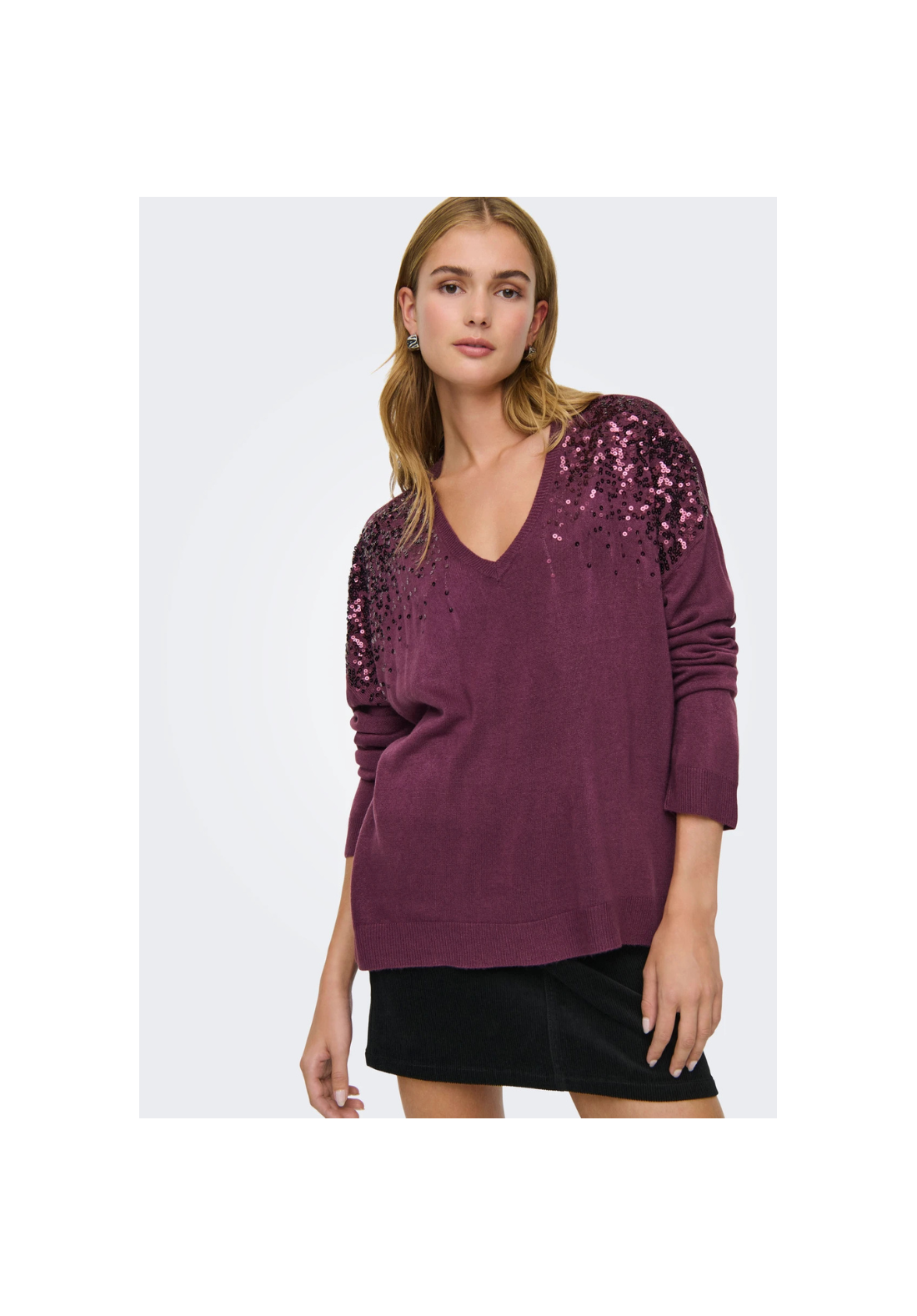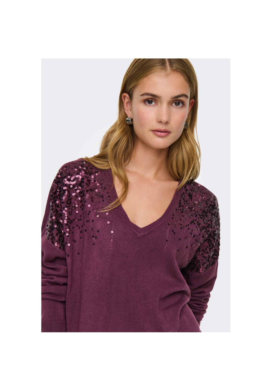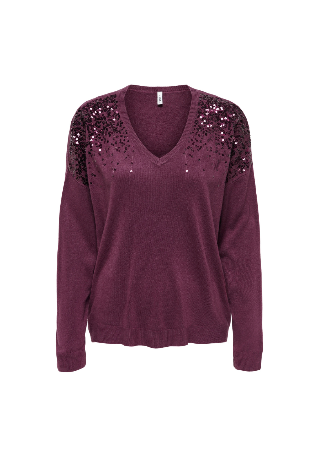 Jersey de punto, con cuello en V y hombros caídos. Detalle de brillo.