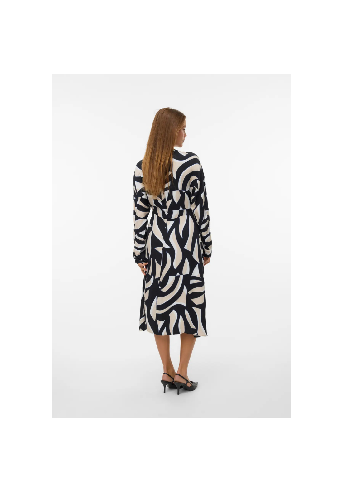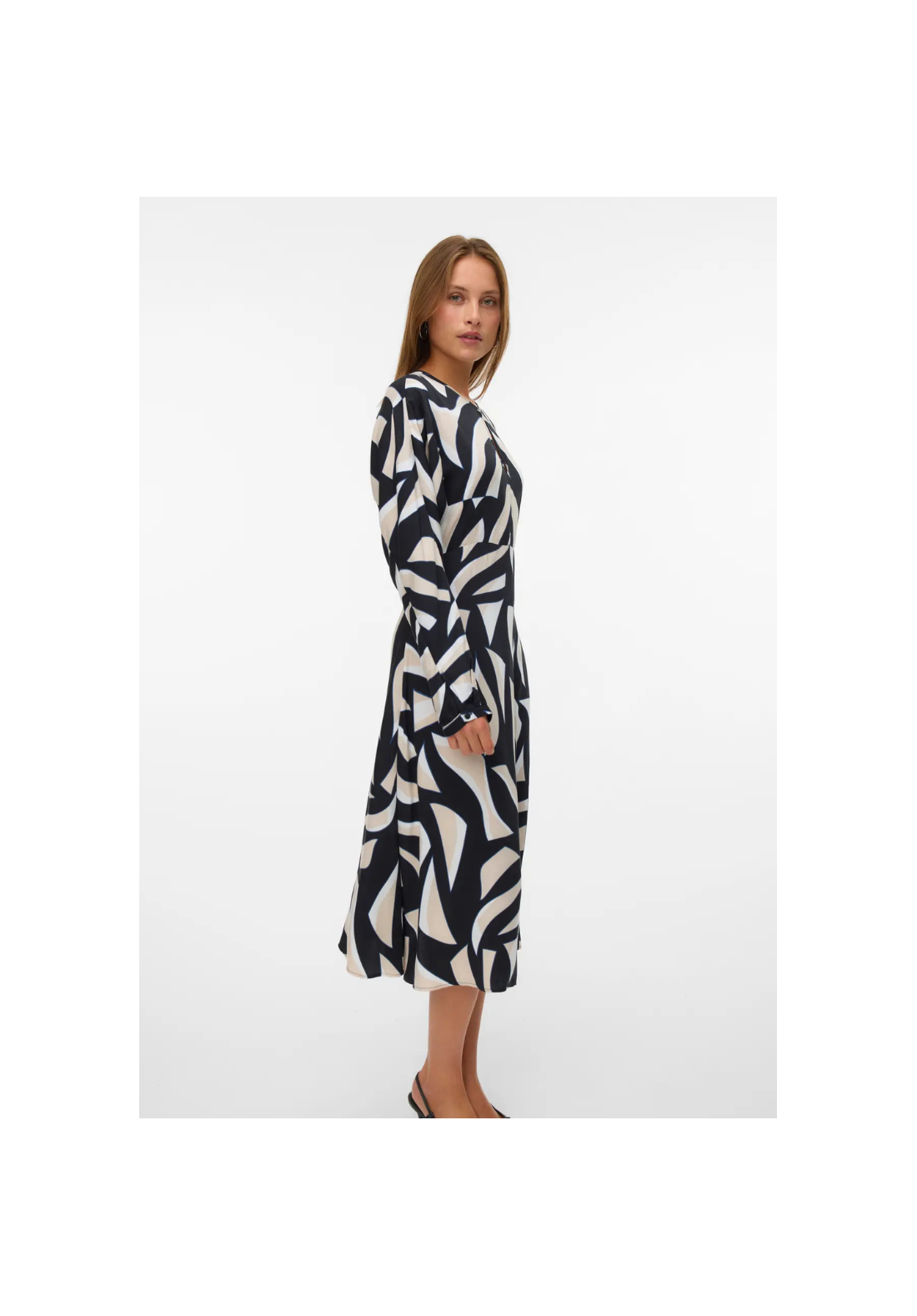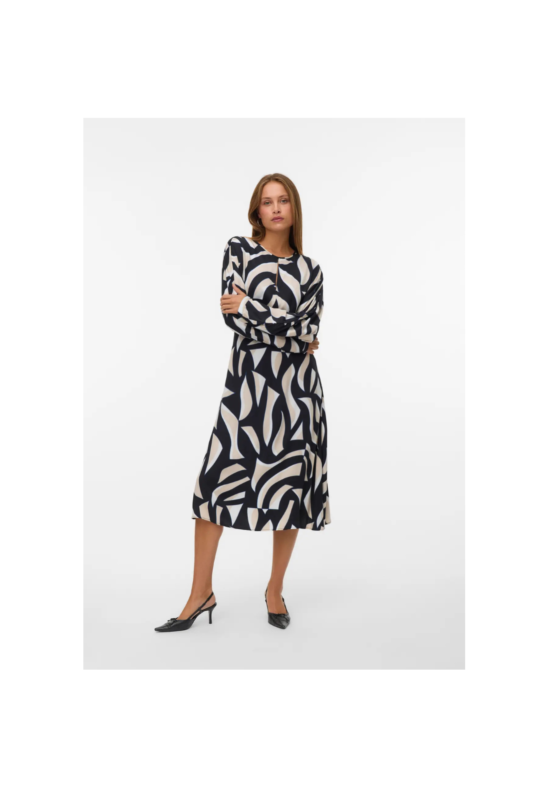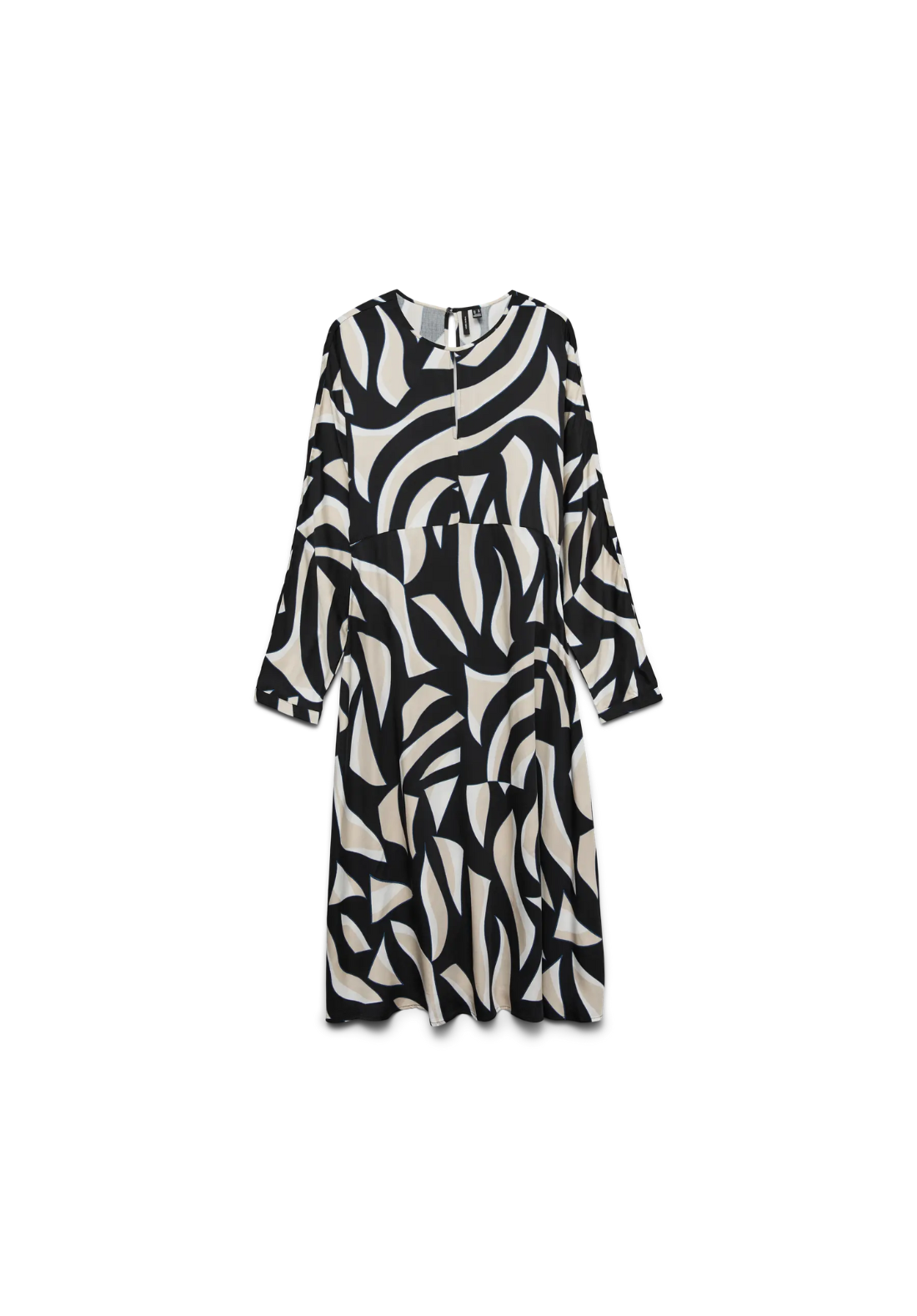 Vestido de cuello redondo y manga larga. Cierre de botón y trabilla. El largo es hasta la pantorrilla. Estampado repetido en toda la prenda.