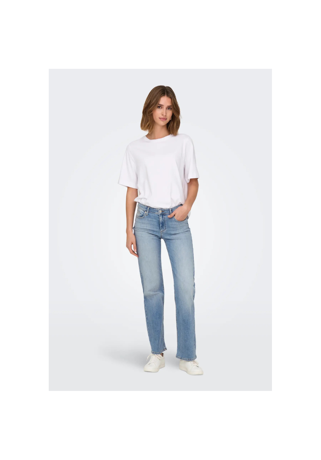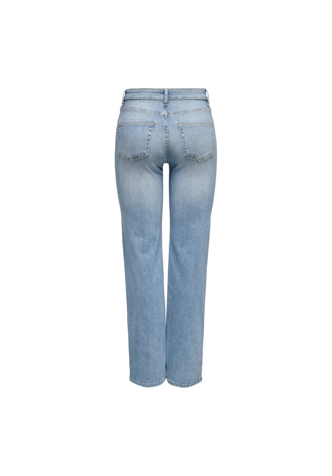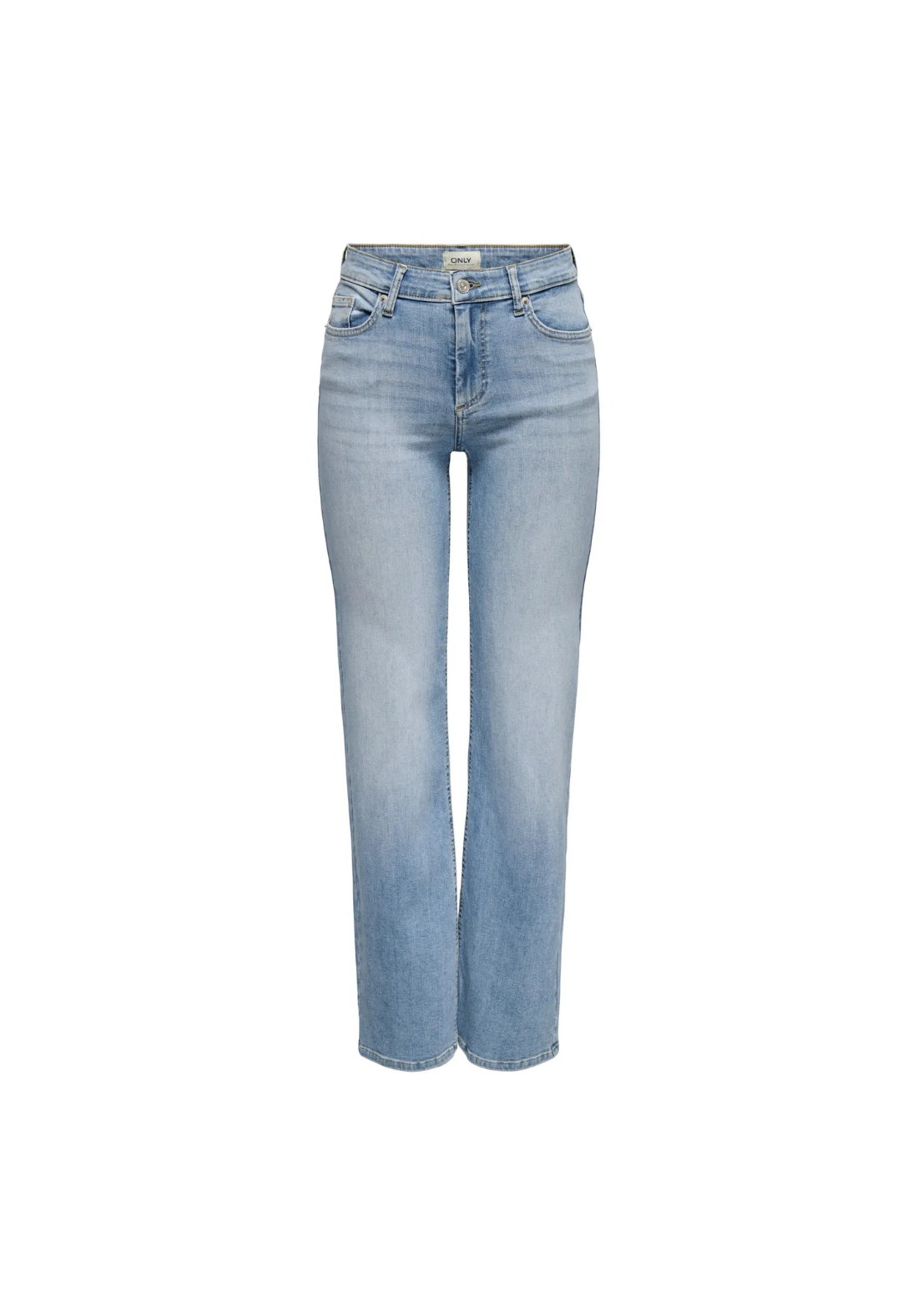 Vaqueros rectos, de cintura media, con cierre de bragueta con botones. Tiene cinco bolsillos y trabillas para cinturón.