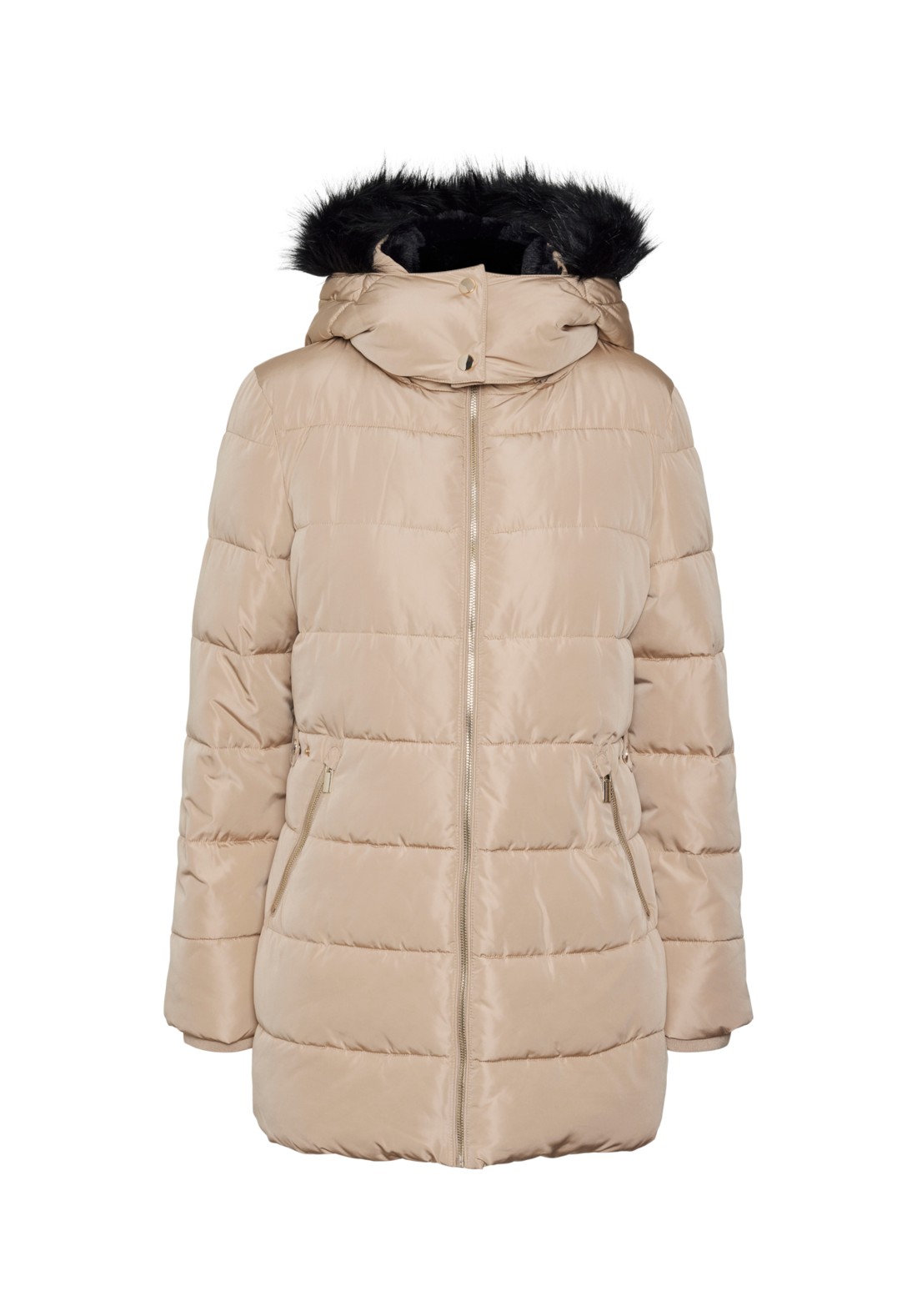 Abrigo largo 3/4 repelente al agua con gorro desmontable. El pelo del gorro también es desmontable y lle el interior del cuello forrado con pelo.