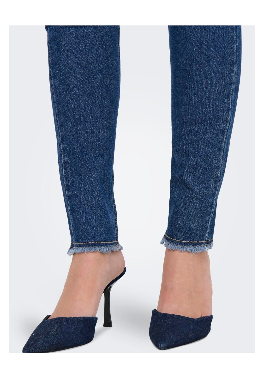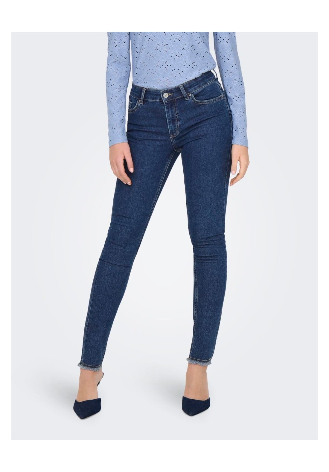 Jeans skinny de tiro medio con detalle desilachado en los bajos el tejido es muy  blandito y elástico.