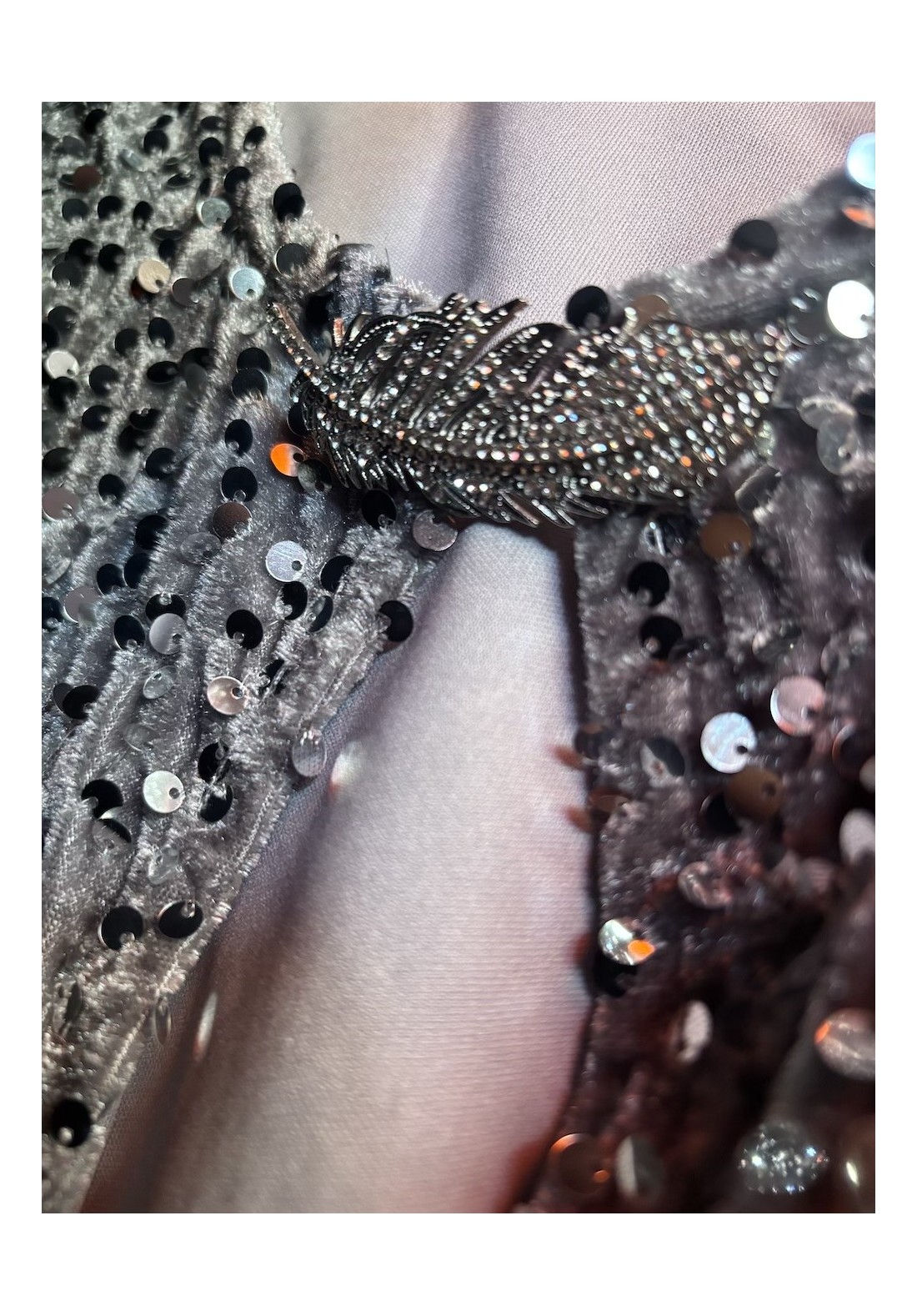 Chaqueta de fiesta con lentejuelas e imperdible con forma de hoja para cierre.