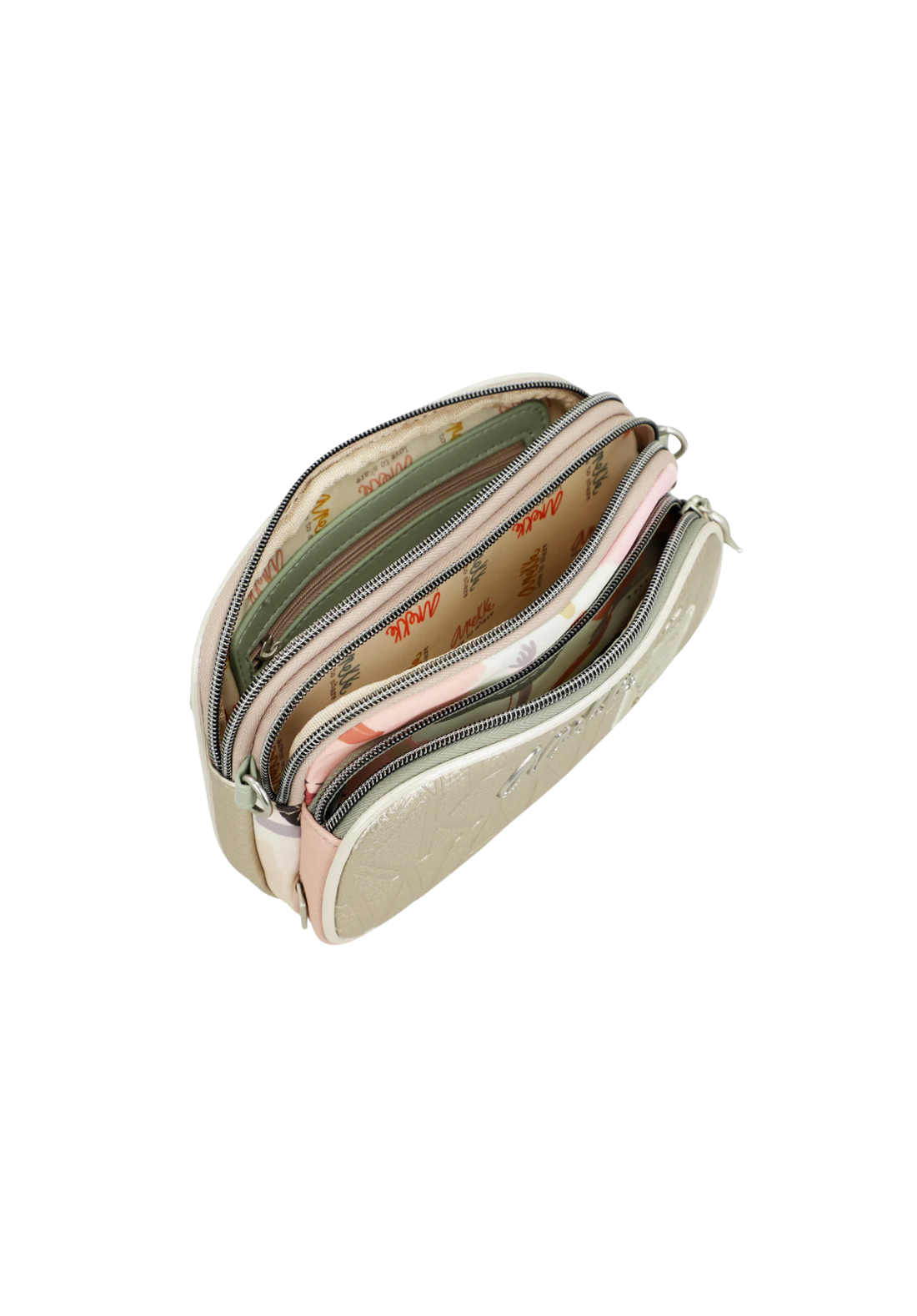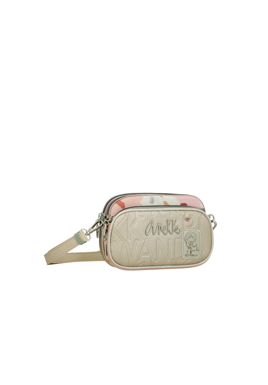 Bandolera de tamaño pequeño, tiene tres compartimentos independientes, todos cierran con cremallera. Interior forrado y tiene también bolsillos exteriores, tanto en el frontal como trasera. Tiene un asa bandolera regulable a diferente largo.