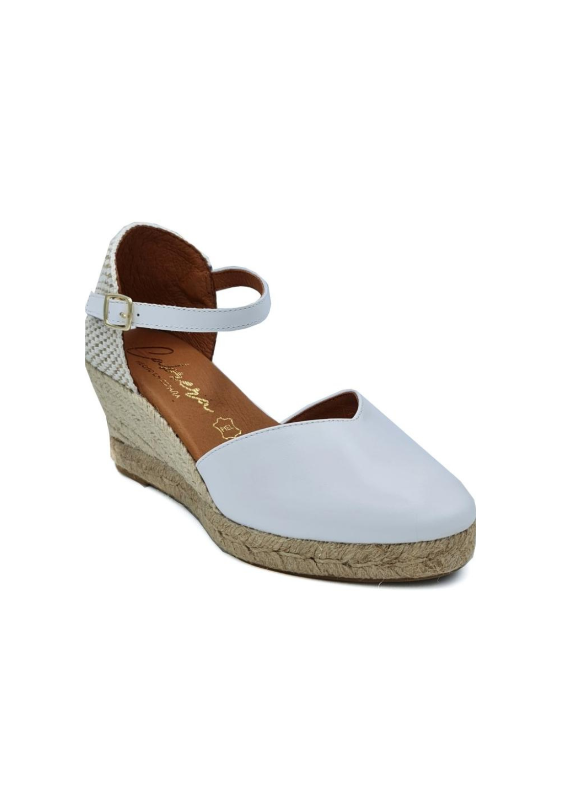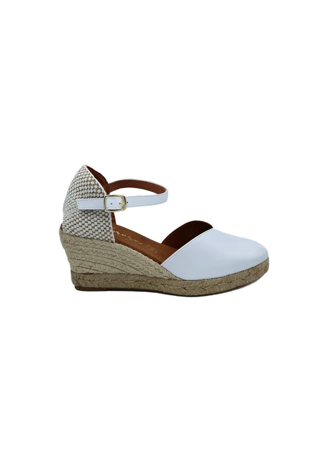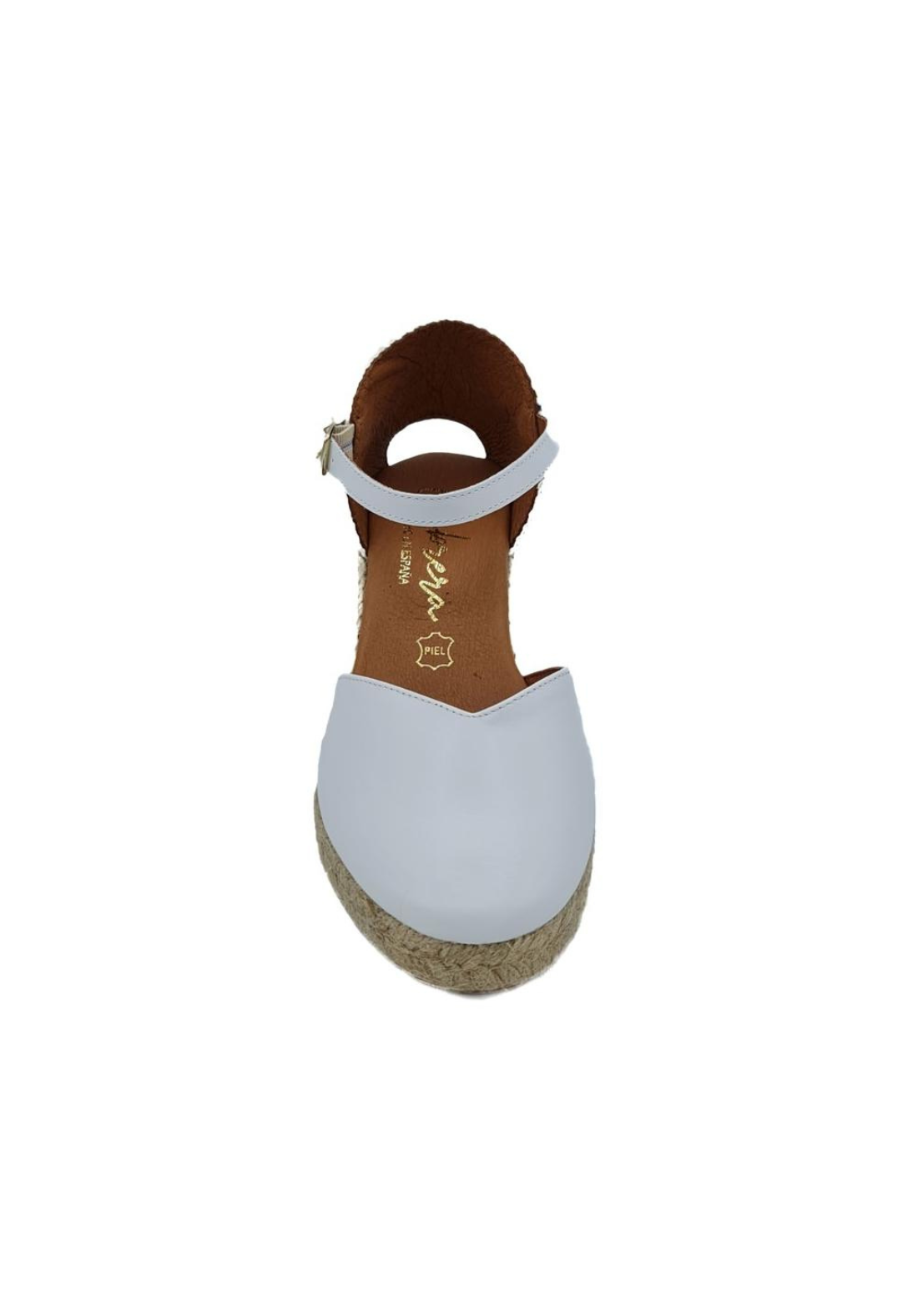 Alpargata de cuña 5 cuerdas fabricada en piel de color blanco con talonera y pulsera de cierre con hebilla, puntera cerrada y planta de piel acolchada.