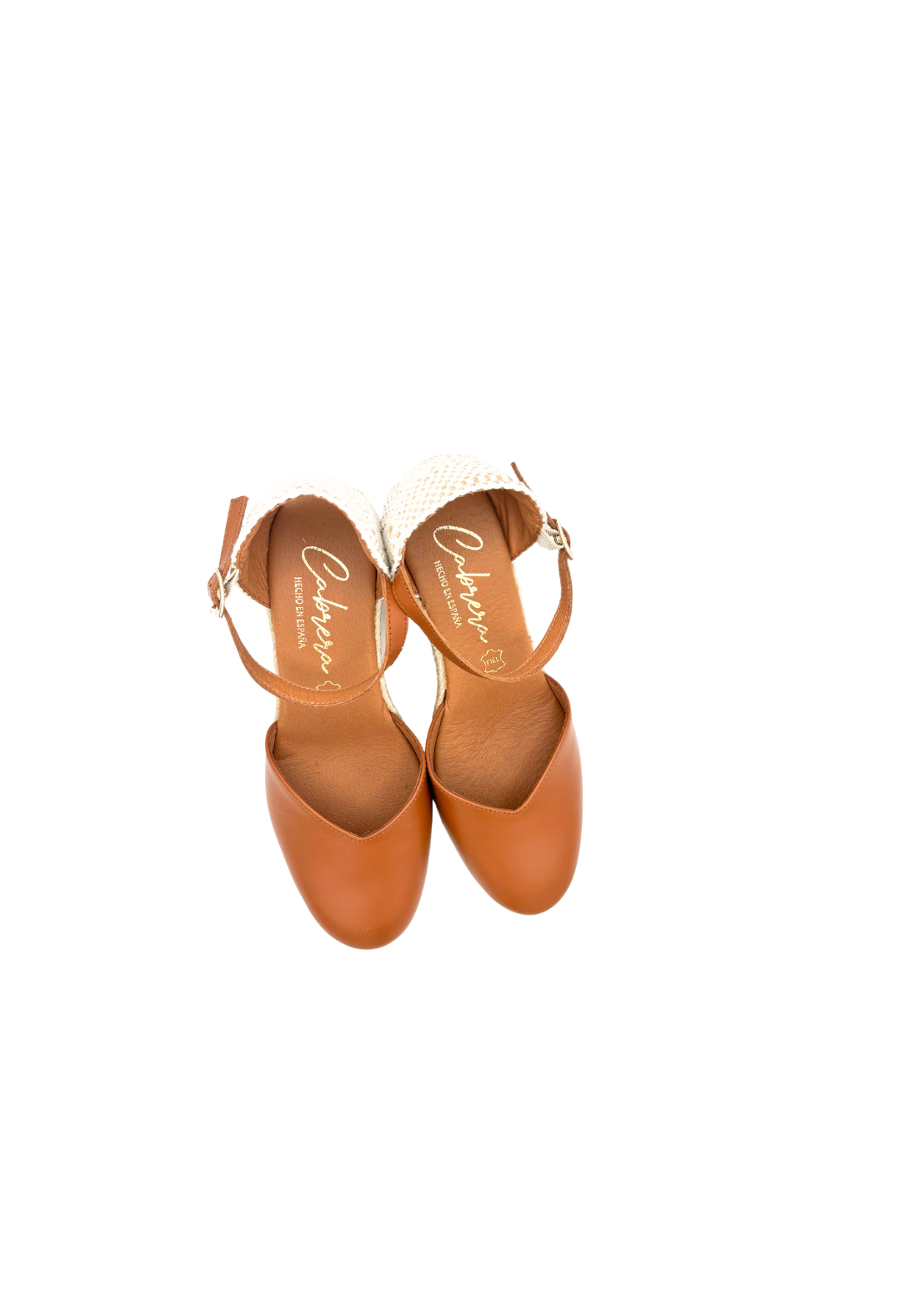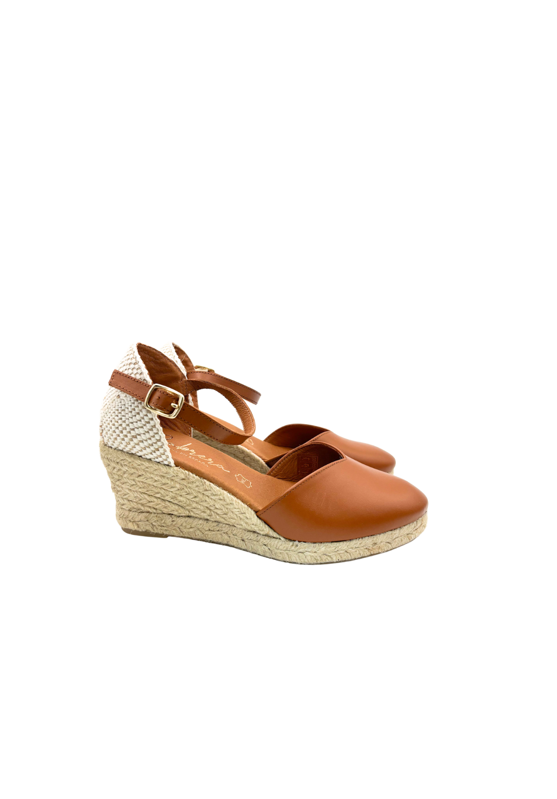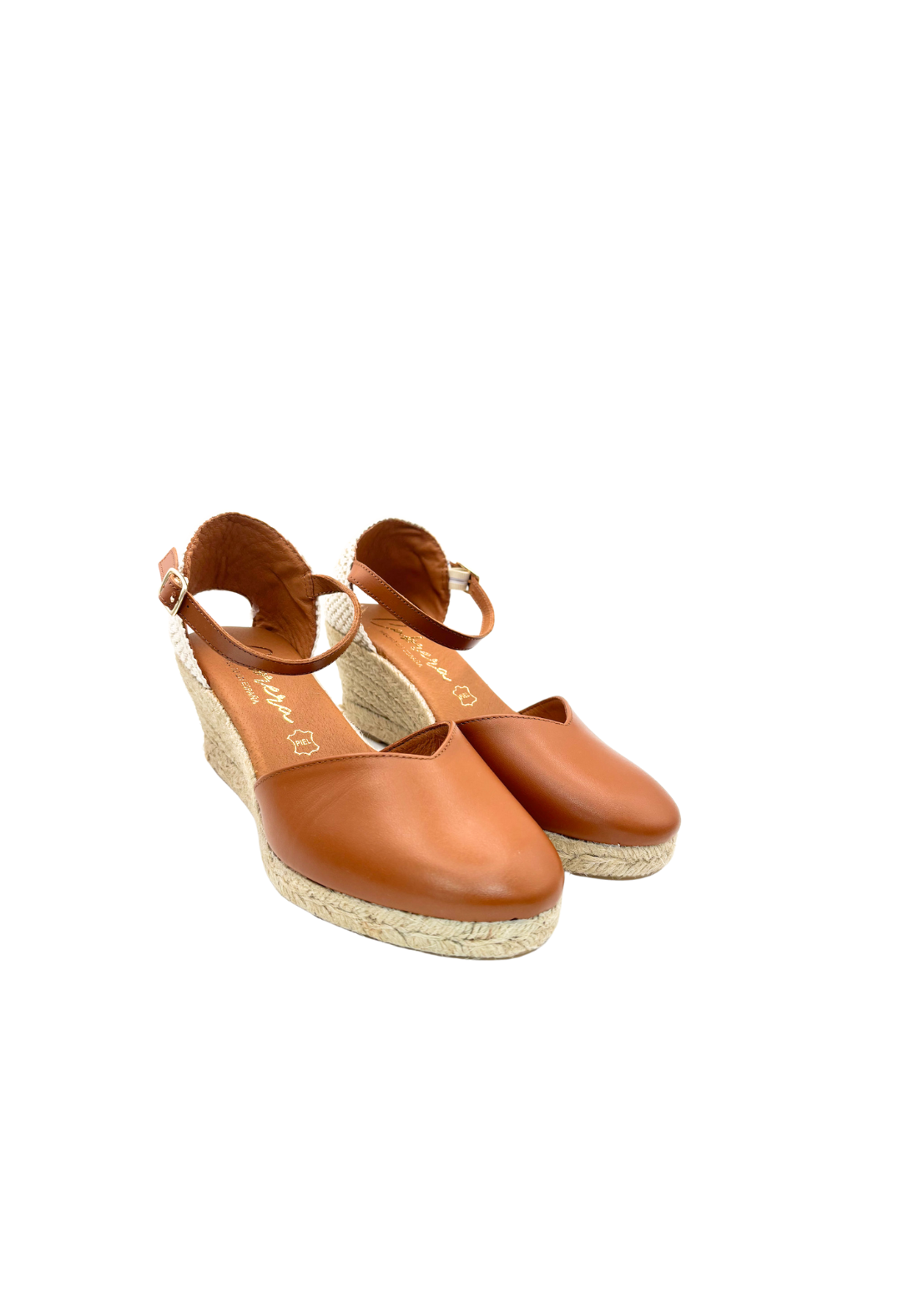 Alpargata de cuña 5 cuerdas fabricada en piel de color cuero con talonera y pulsera de cierre con hebilla, puntera cerrada y planta de piel acolchada.