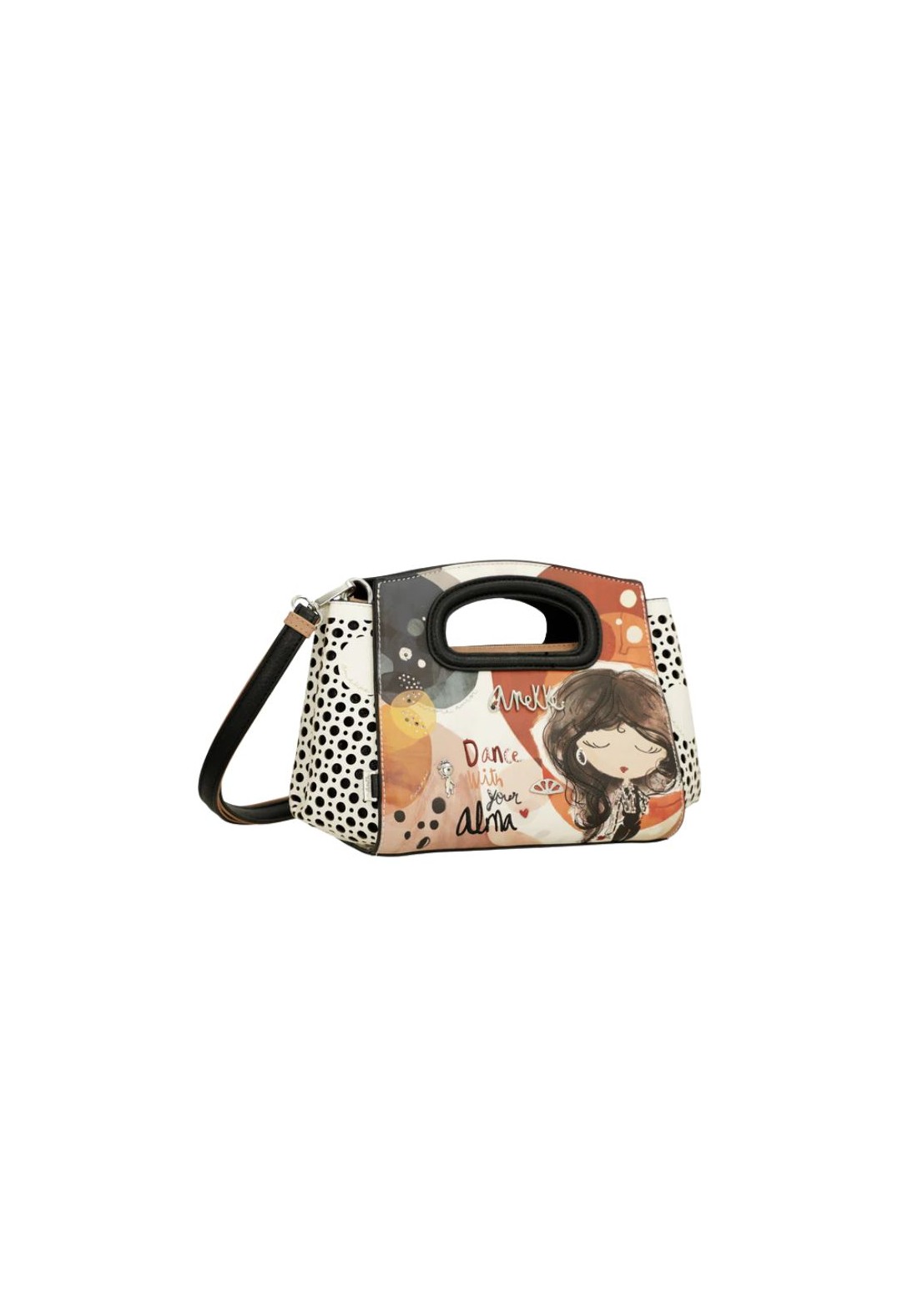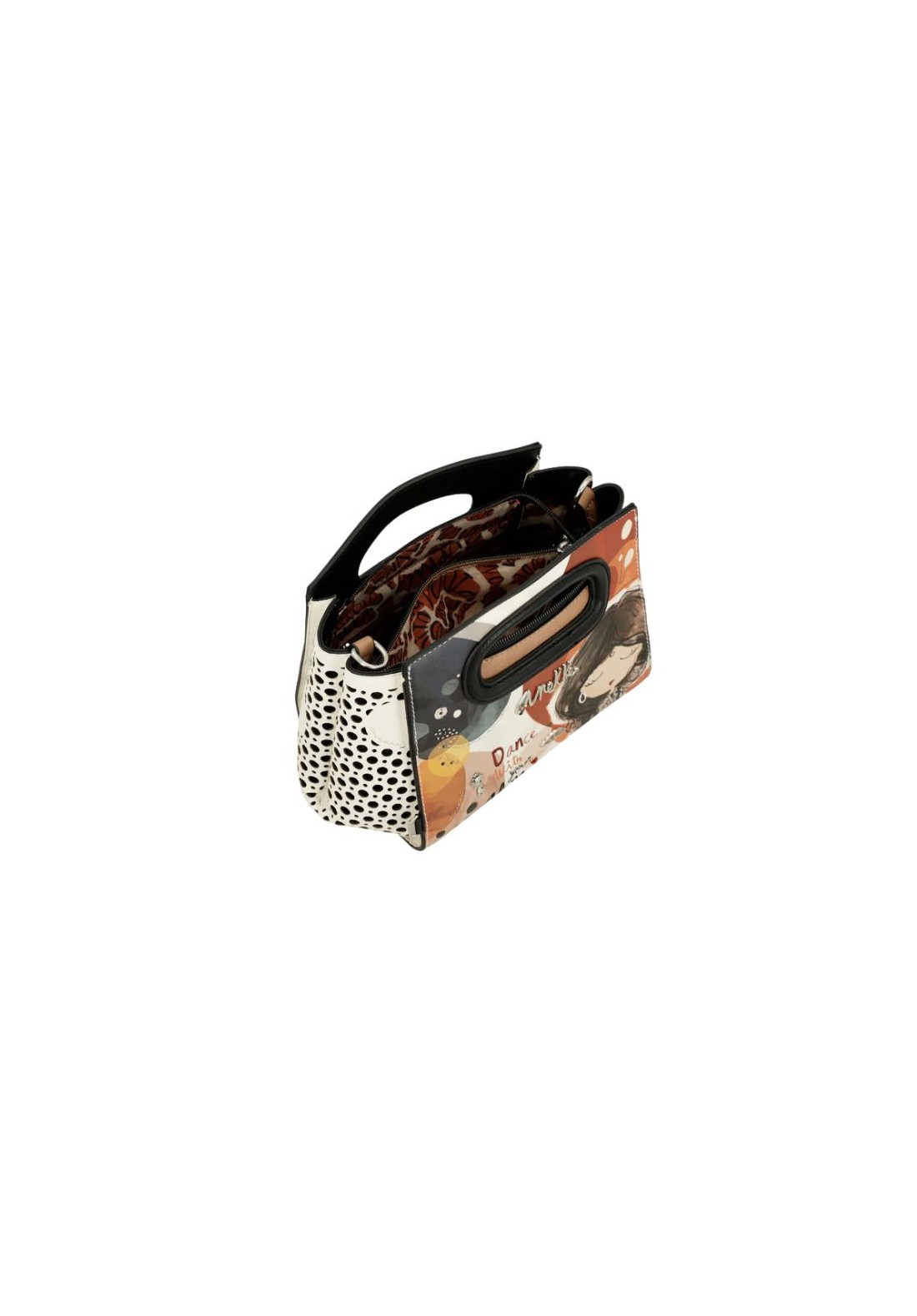 Tiene también un bolsillo trasero. Tiene dos asas de mano y una bandolera regulable a diferente largo.