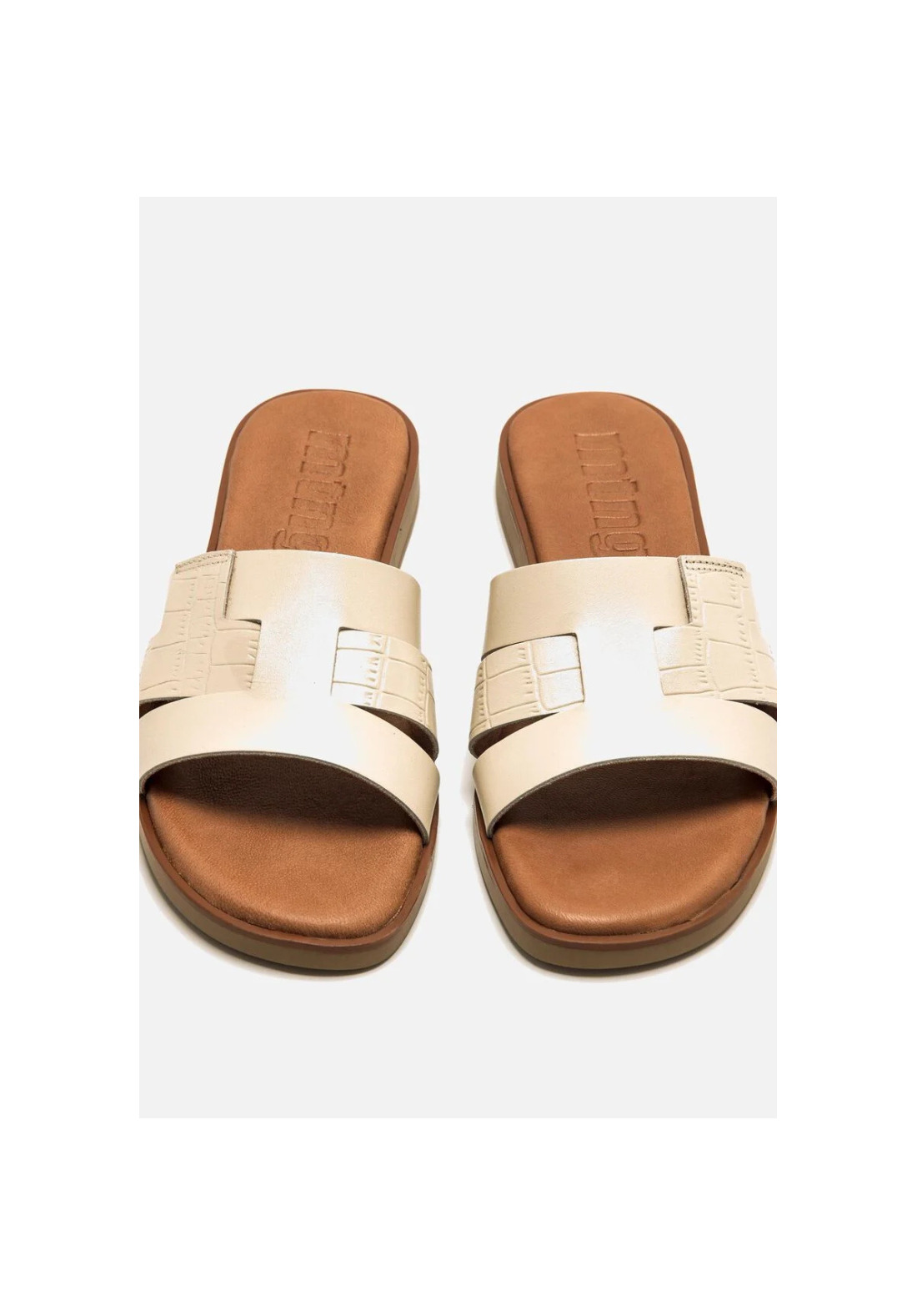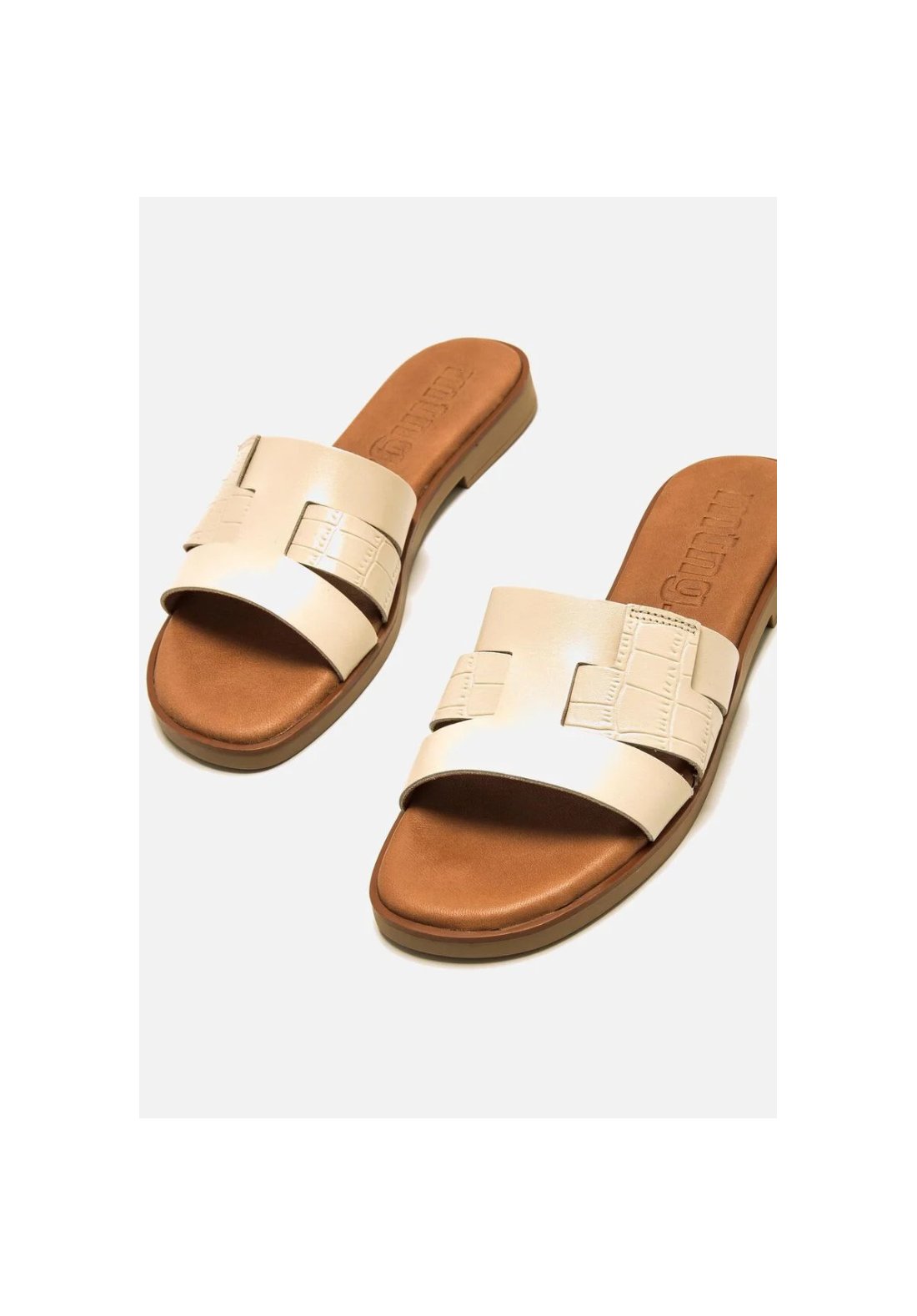 Sandalia plana de piel de color blanco roto Alysa. Sandalia con tiras lisas y con textura de efecto serpiente. Son muy cómodas por su suela plana y su planta de piel acolchada.