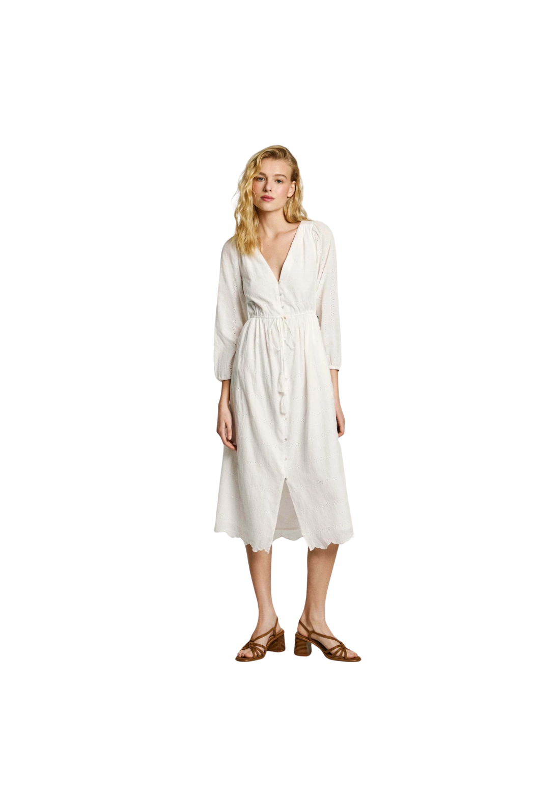 Vestido de manga larga, con cuello en V y cierre de botones. Tiene detalle de combinación.