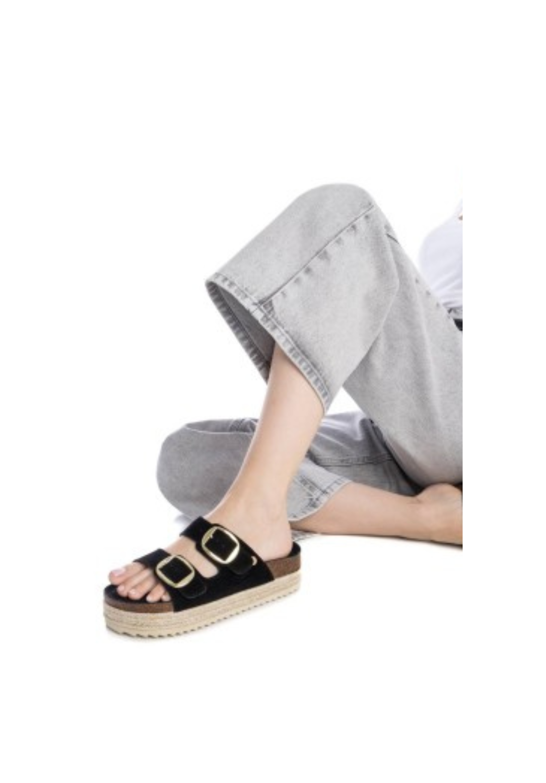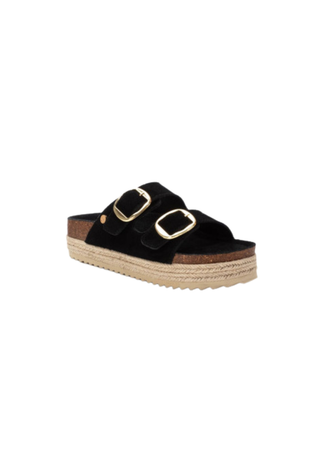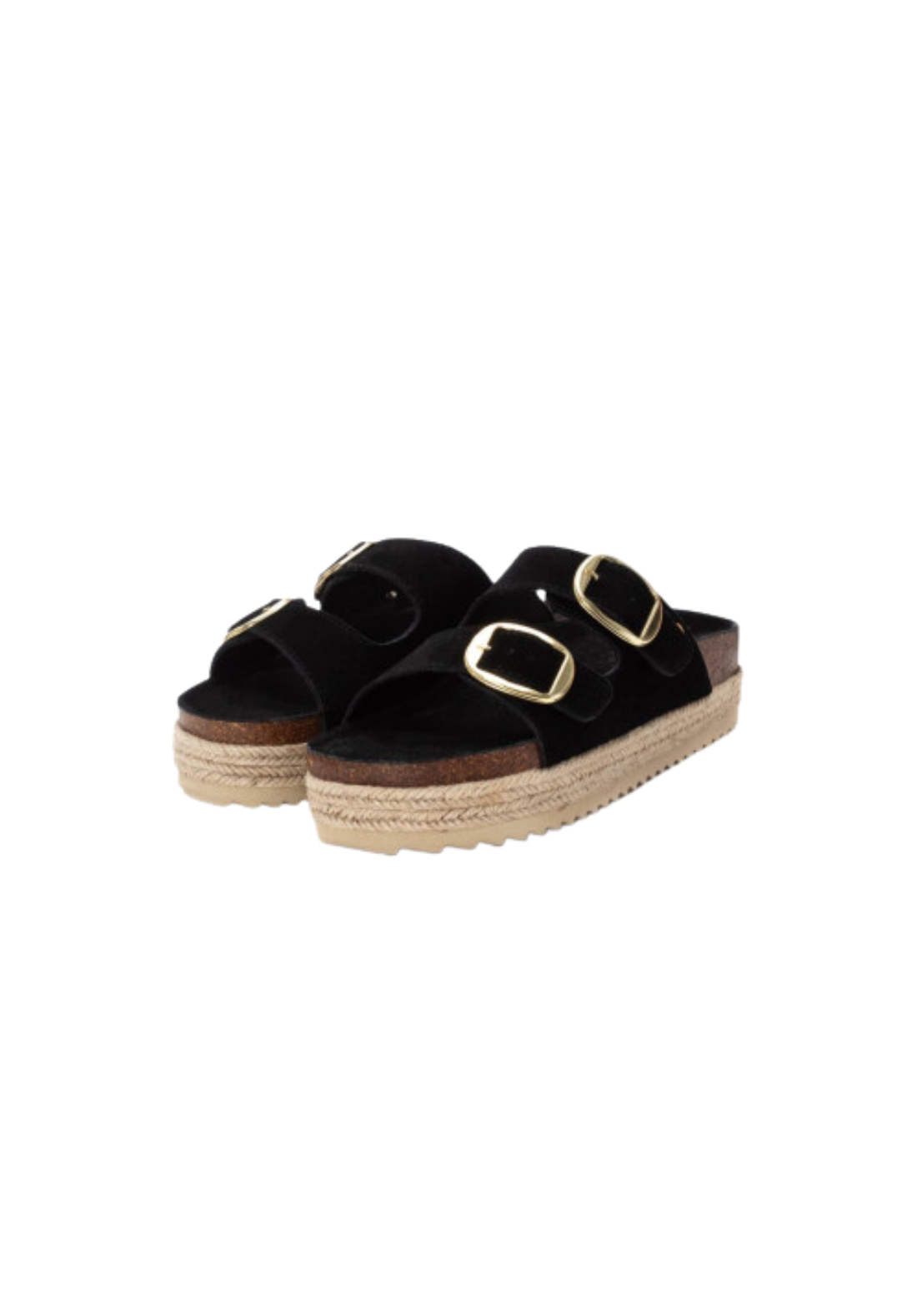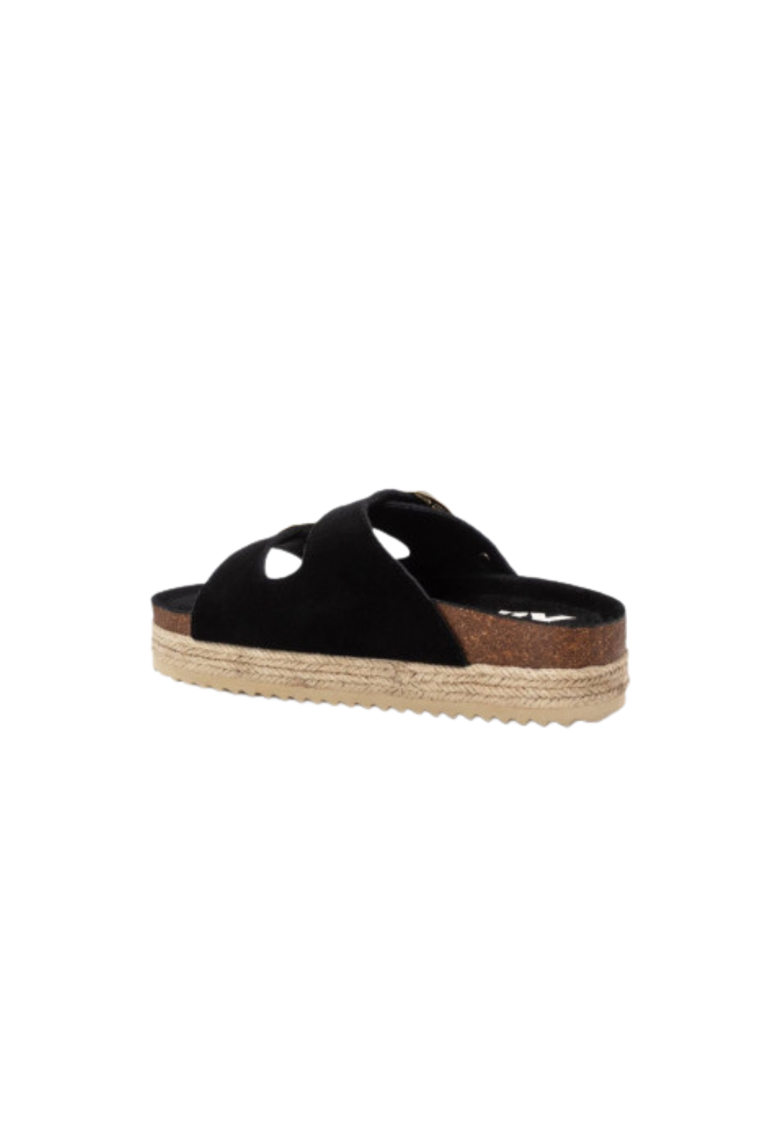 Estas sandalias de piel serraje con plataforma en color negro cuentan con doble tira y cierre de hebilla, asegurando un ajuste perfecto y un look moderno. Altura total de la plataforma 5 cm (plantilla bio 2,5 cm, zona cuerda 2,5 cm).